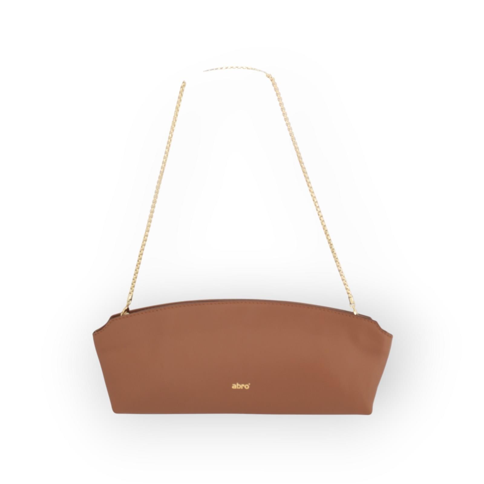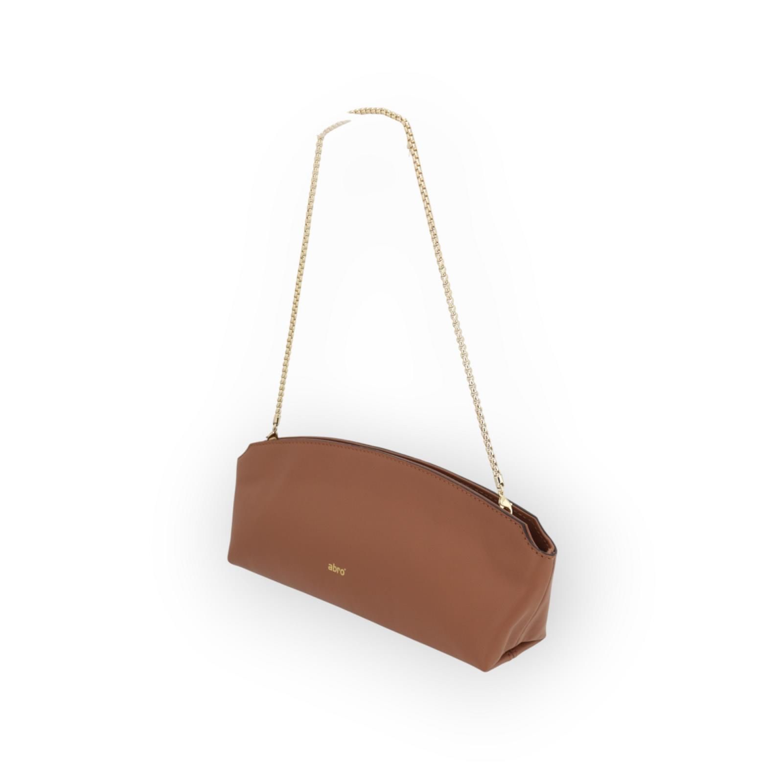 Clutch Ballroom van Abro voor dames. Deze clutch handtas is gemaakt in cognac zacht Italiaans leer. Heeft een afneembare gouden ketting. Is afgesloten met een rit en heeft binnenin 2 steekvakken waarvan 1 met rits. Is een elegant, feestelijk model.