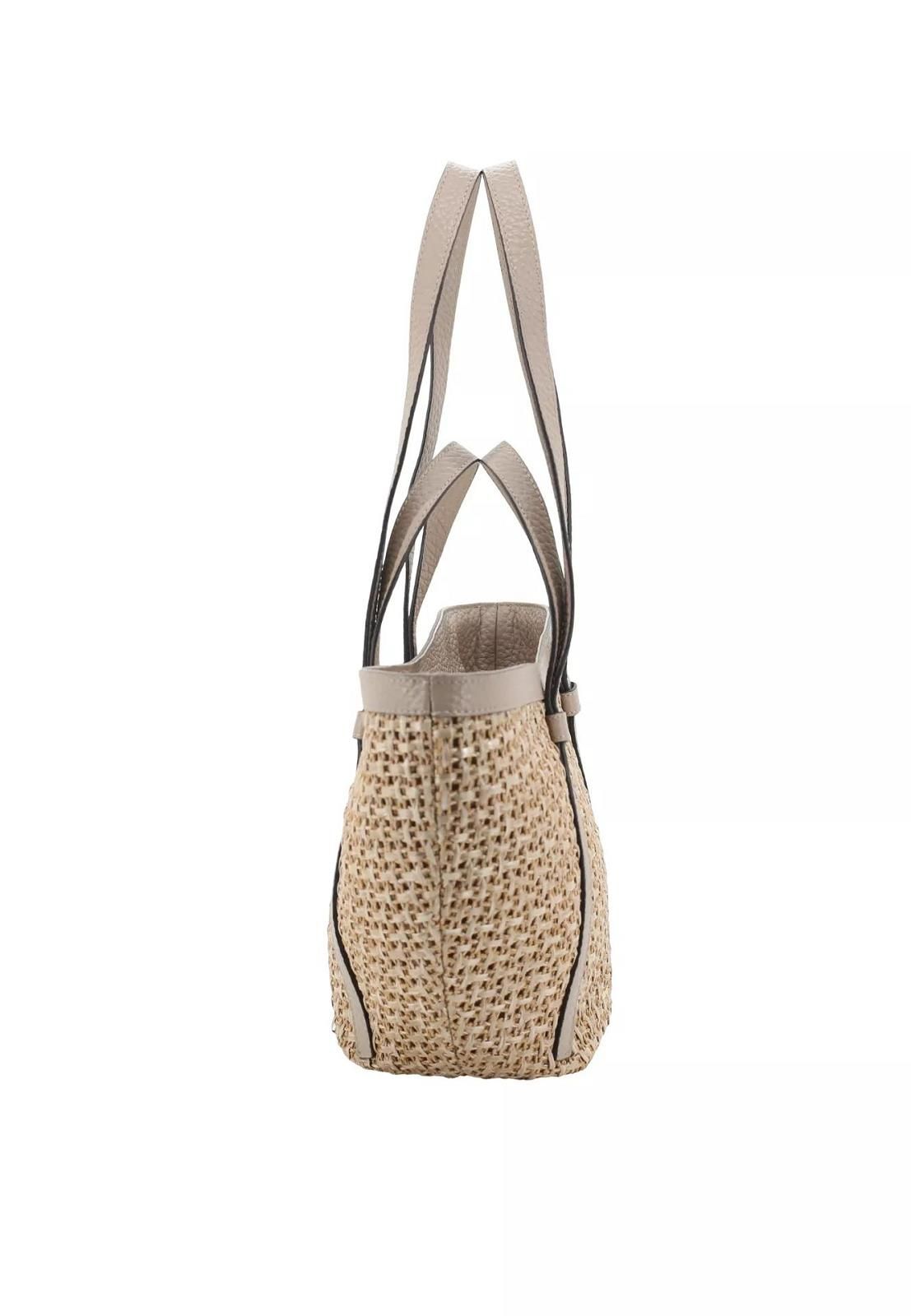 Shopper Cosmo Medium van Abro voor dames. Deze nieuwe stijl is in beige raffia gevlochten materiaal met beige leer omrand en handvaten. Is afgesloten met een ritssluiting. Heeft binnenin 1 ruim vak, 2 steekvakken en nog een vakje met ritssluiting. Is zeer praktisch voor alledaags gebruik.