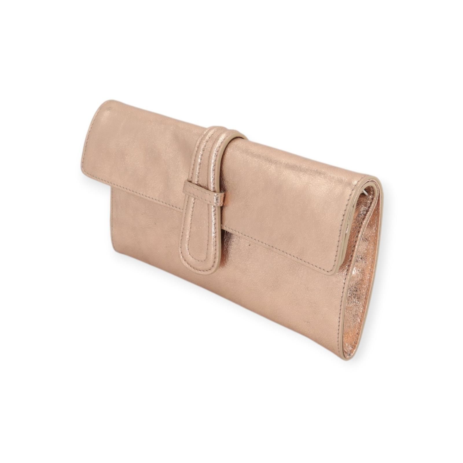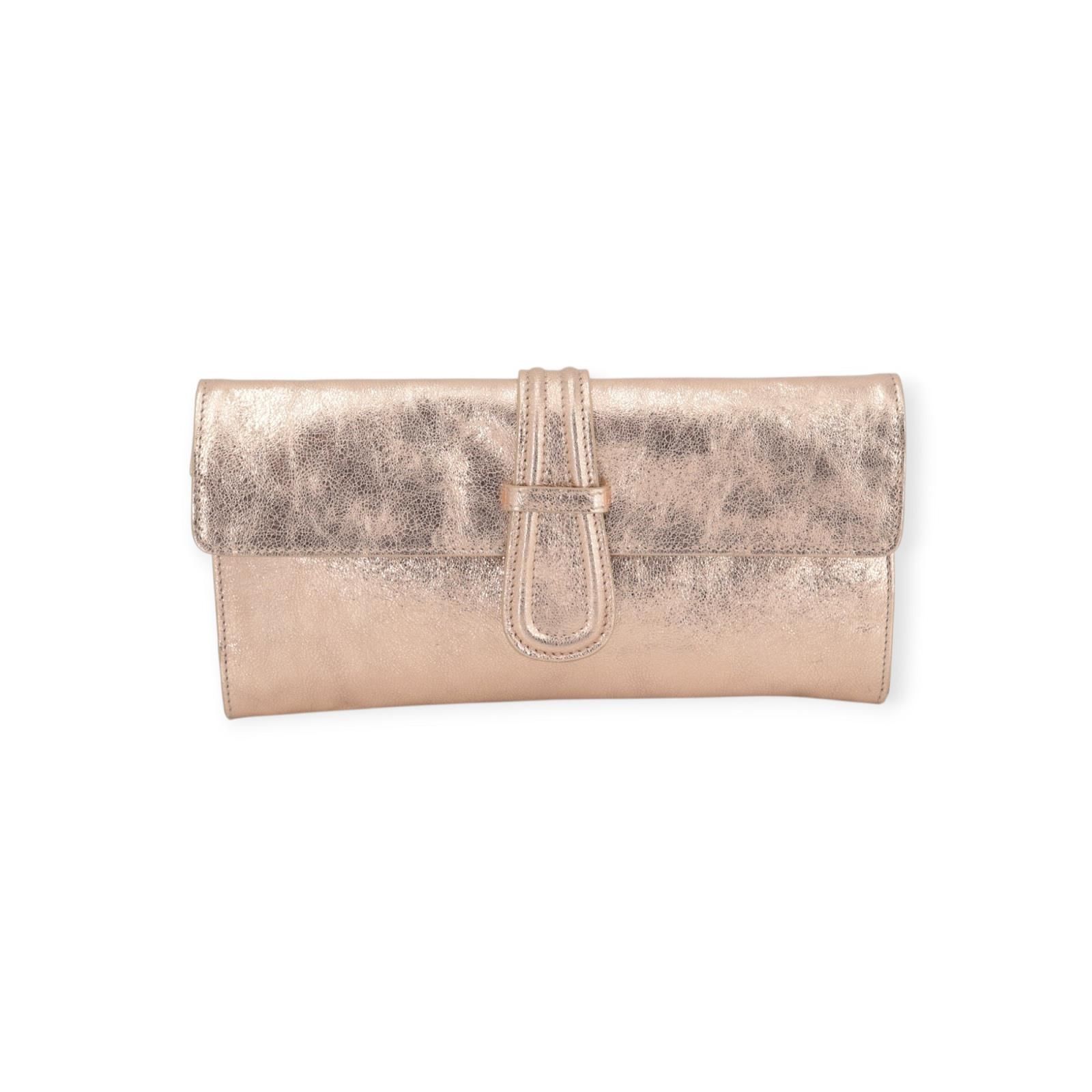 Clutch Luna van Abro voor dames. Deze clutch handtas is gemaakt in koper, rosé shining, metallic zacht Italiaans leer. Is met een magnetische klepsluiting en heeft een ruim binnenvak en 1 vak met ritssluiting. Heeft een afneembare gouden ketting.