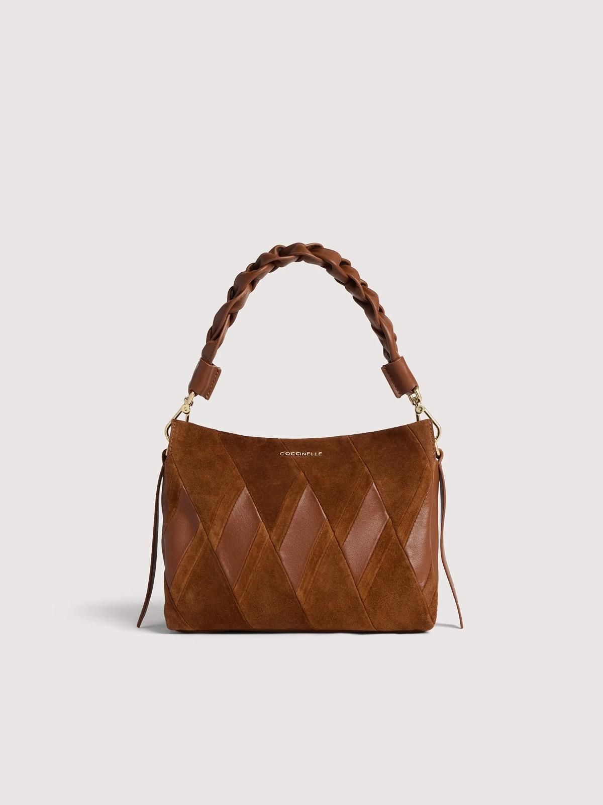 Hand- en schoudertas Boheme New Geometric Patch van Coccinelle voor dames. Deze handtas is in suède cognac. Is een lijn van zacht, dubbelzijdig leer met een gevlochten hengsel. Dit model is gemaakt door stroken van verschillende materialen en kleuren die mooi aan elkaar genaaid zijn om het gewenste patroon te vormen.