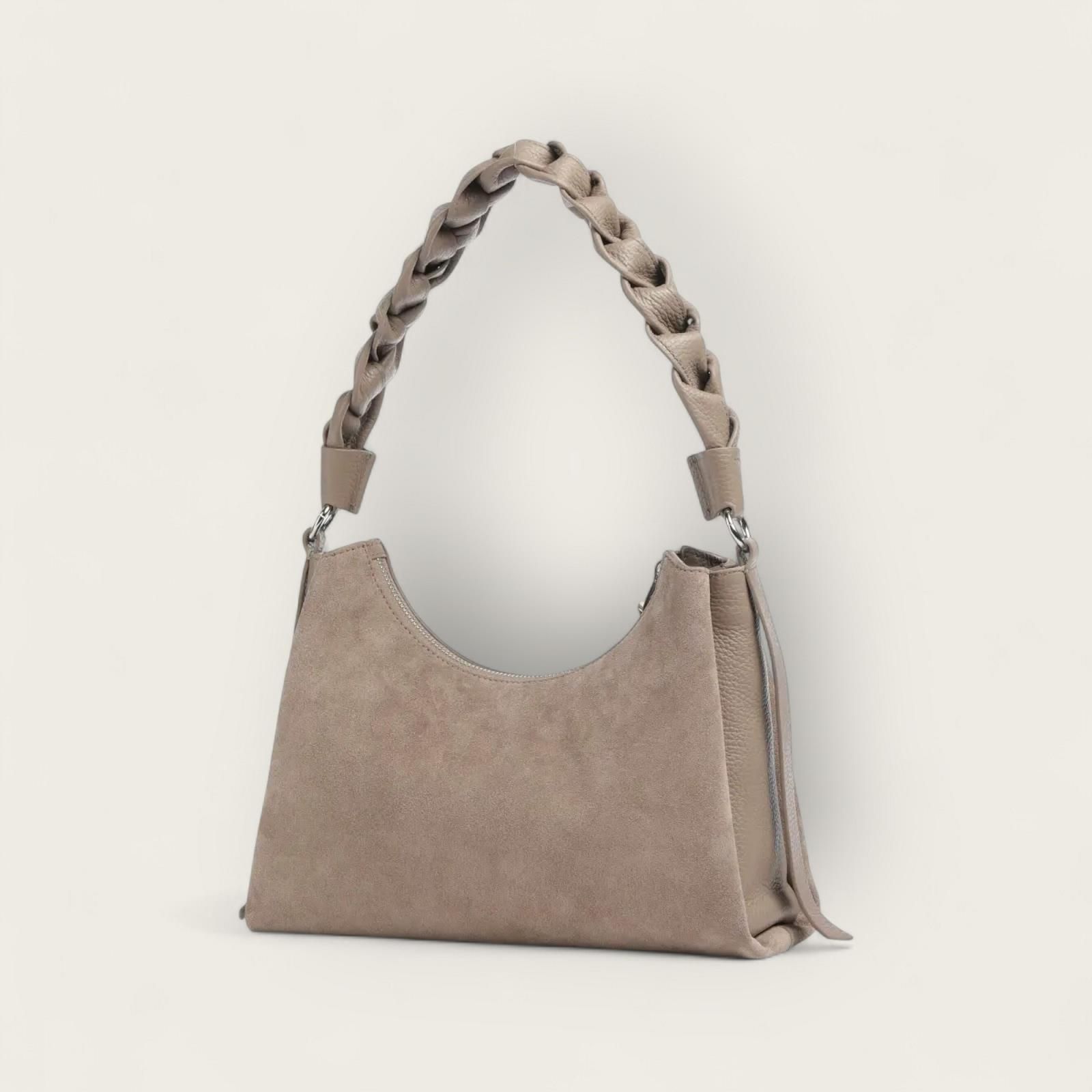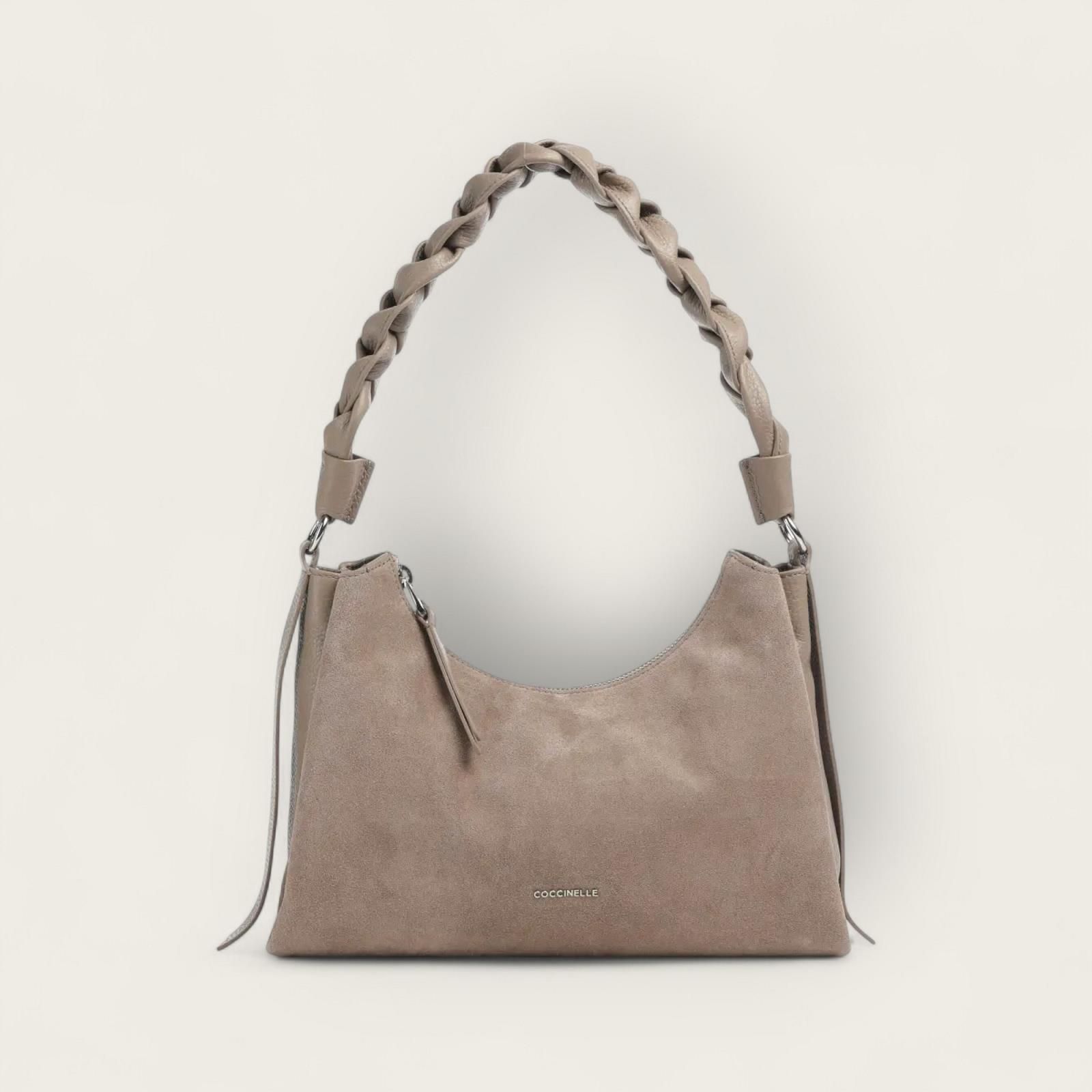 Hand – en schoudertas Coccinelle Boheme Suède in taupe. Deze schoudertas voor dames heeft een gevlochten handvat wat het model zeer elegant maakt. Is volledig in suède en ideaal voor het dagelijks gebruik. De extra linten aan de zijkant maken het model nog vrouwelijker. Is gemaakt uit 3 binnenvakken waarvan 1 met ritssluiting. Logo gestempeld in goud als extra detail.