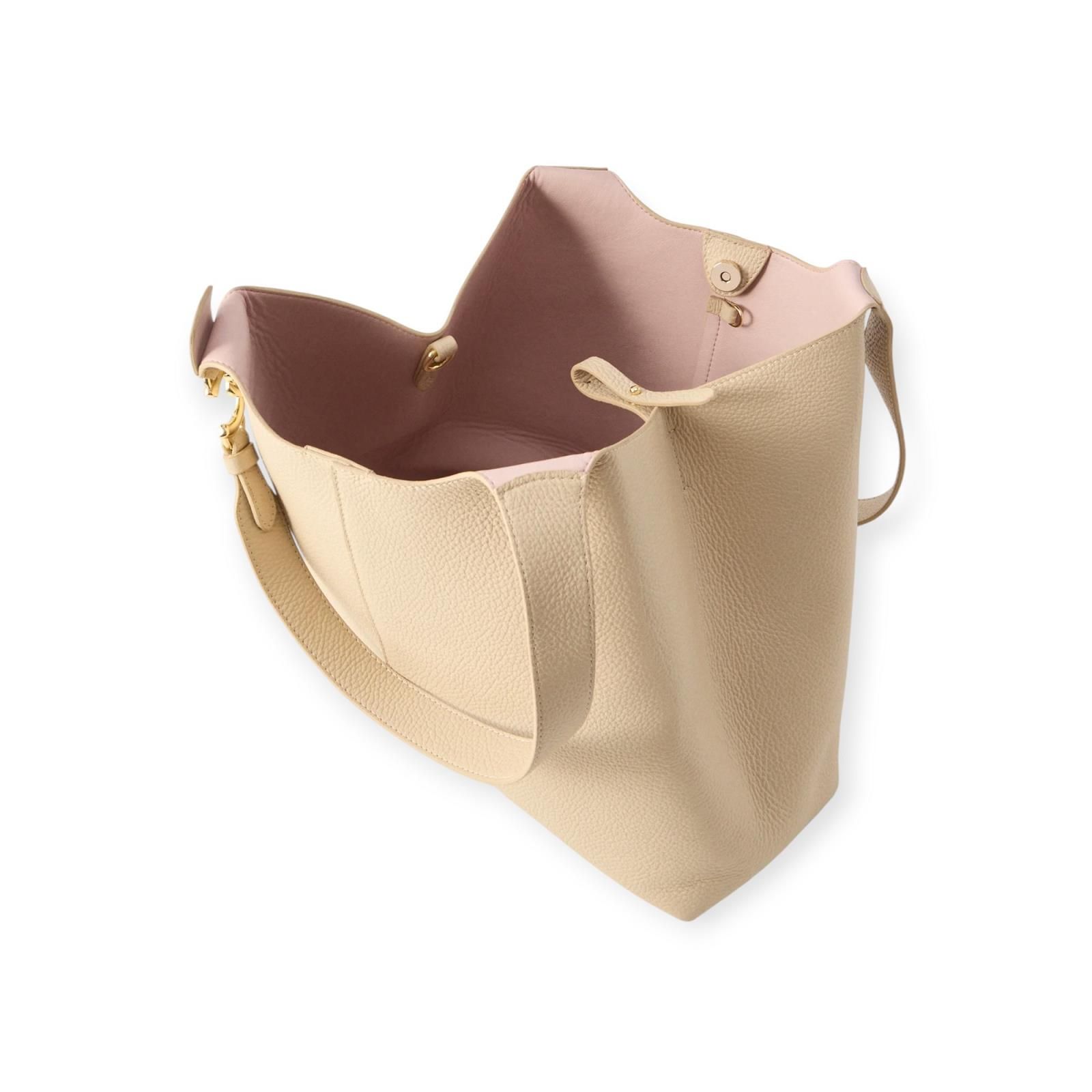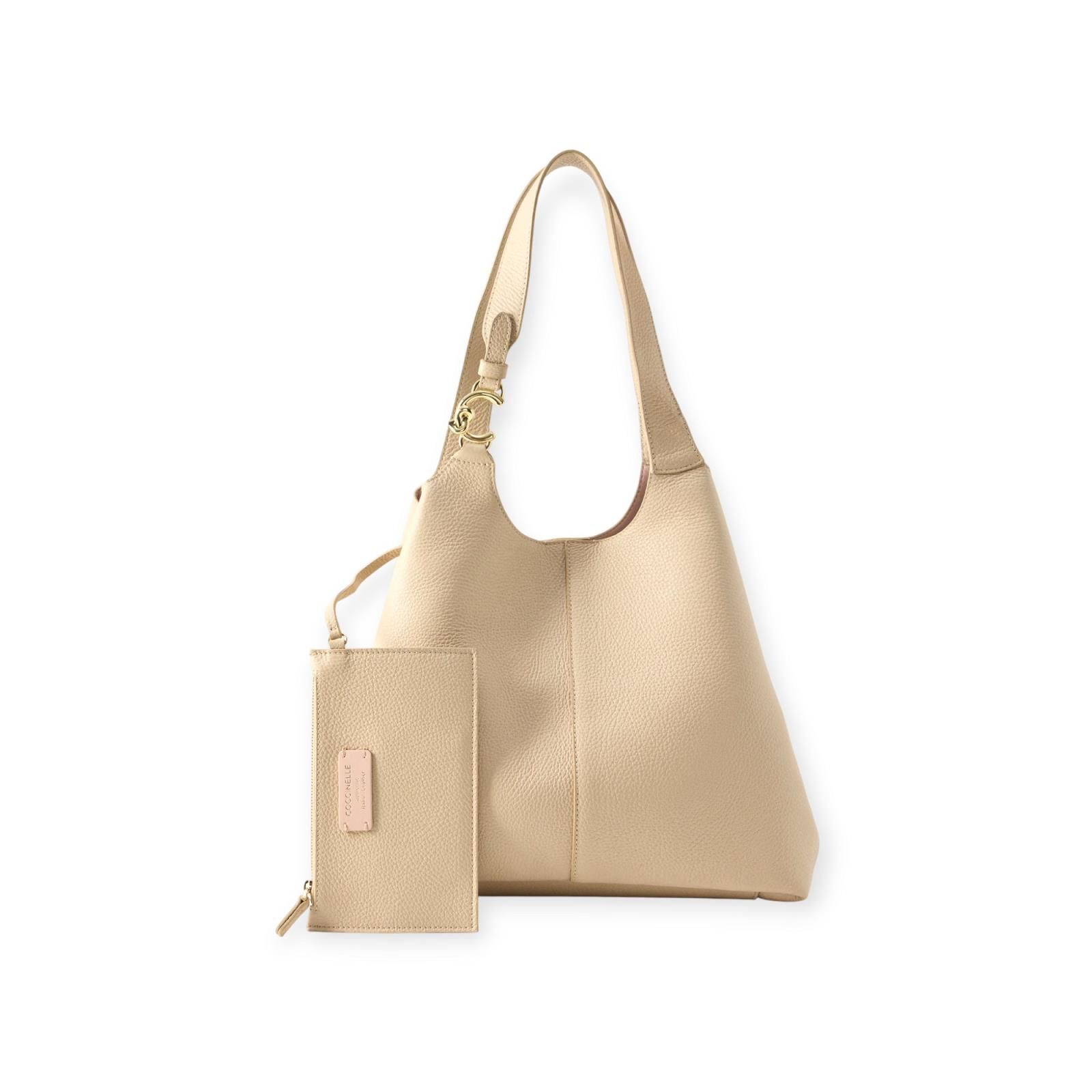 Hand- en schoudertas C-EASY large van Coccinelle in beige leer. Deze handtas heeft aan de handvaten het C met plectrum detail in goud. Is afgesloten met een drukknoop sluiting en een riem met drukknop voor het model terug mooi in zijn vorm te krijgen en als extra afsluiting. De binnenkant is 1 open ruim vak met een aparte etui in groen leer met ritssluiting die je kan afhalen met behulp van karabijnhaakje.