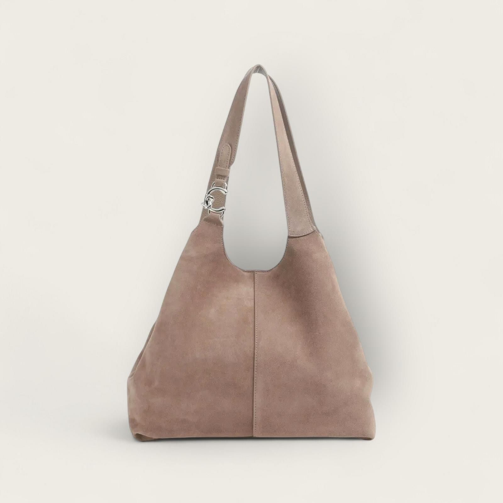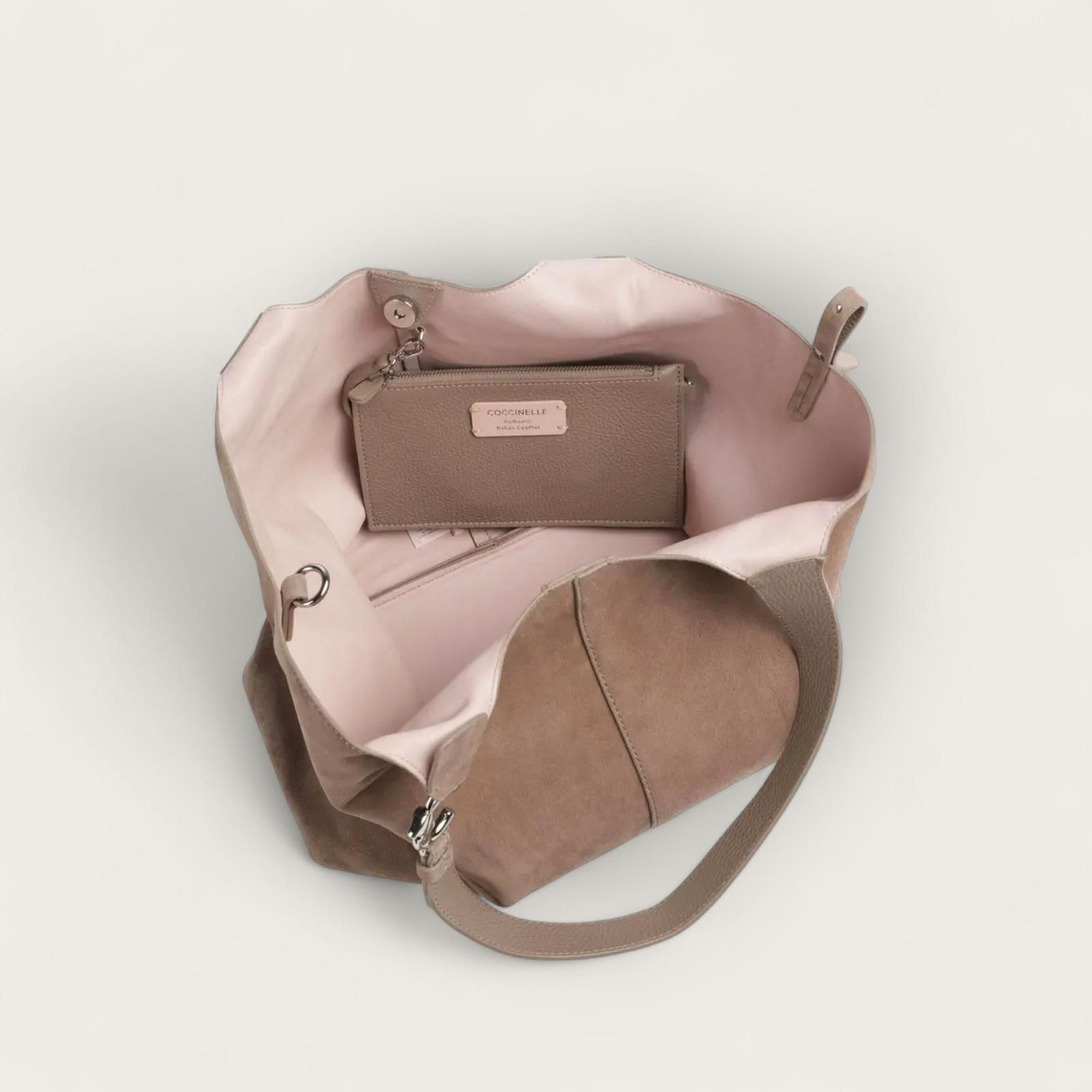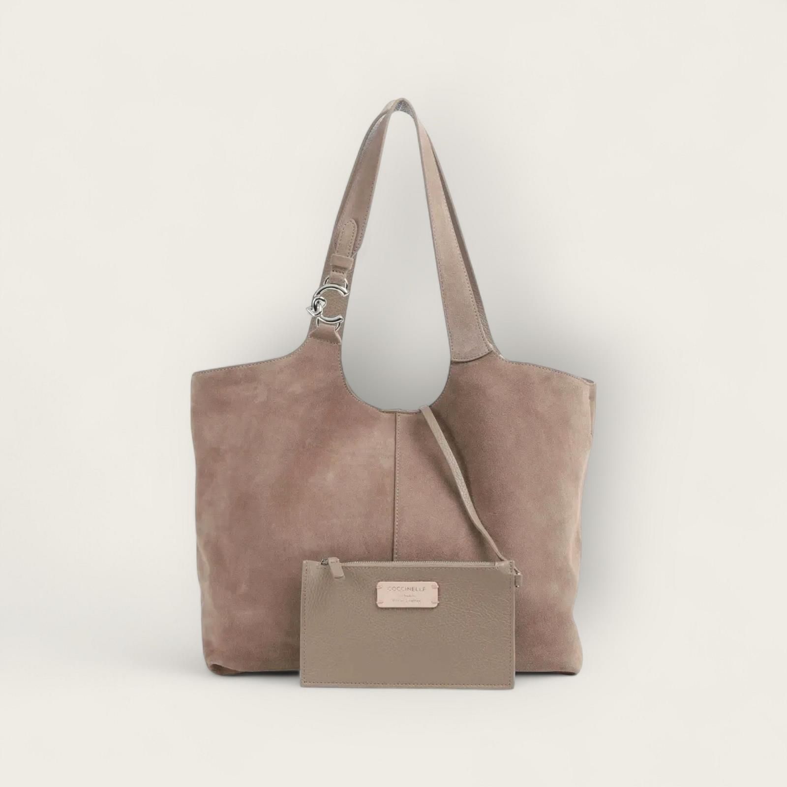Hand- en schoudertas Coccinelle C-EASY in taupe suède. Deze schoudertas voor dames is uit de C-EASY lijn. Heeft aan de handvaten Het C met plectrum detail in zilver. De onderkant van de handtas is in taupe leer voor beschadigingen te voorkomen. Is afgesloten met een drukknoop sluiting en een riem met drukknop voor het model terug mooi in zijn vorm te krijgen en als extra afsluiting. De binnenkant is 1 open ruim vak met een aparte etui in taupe leer met ritssluiting die je kan afhalen met behulp van karabijnhaakje.