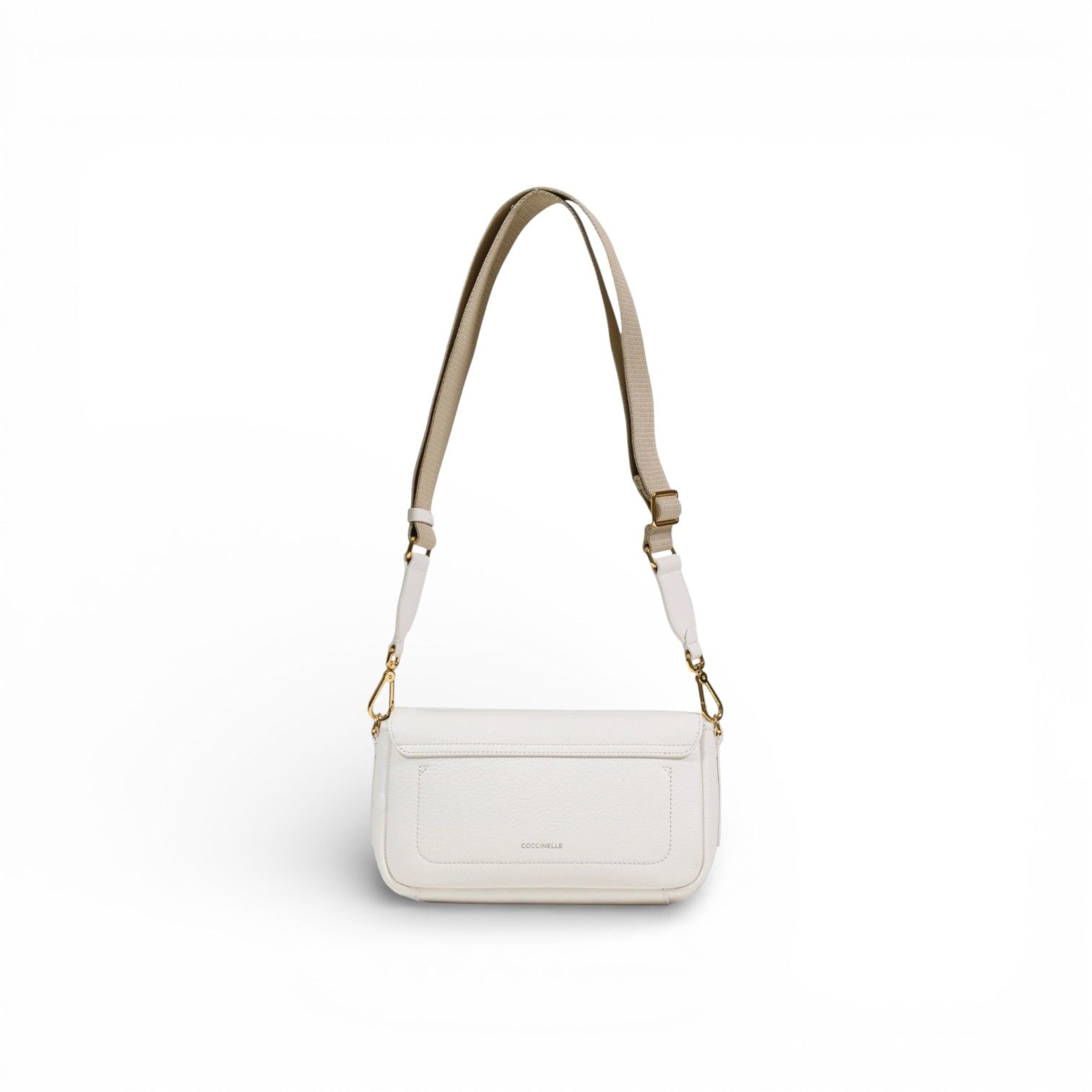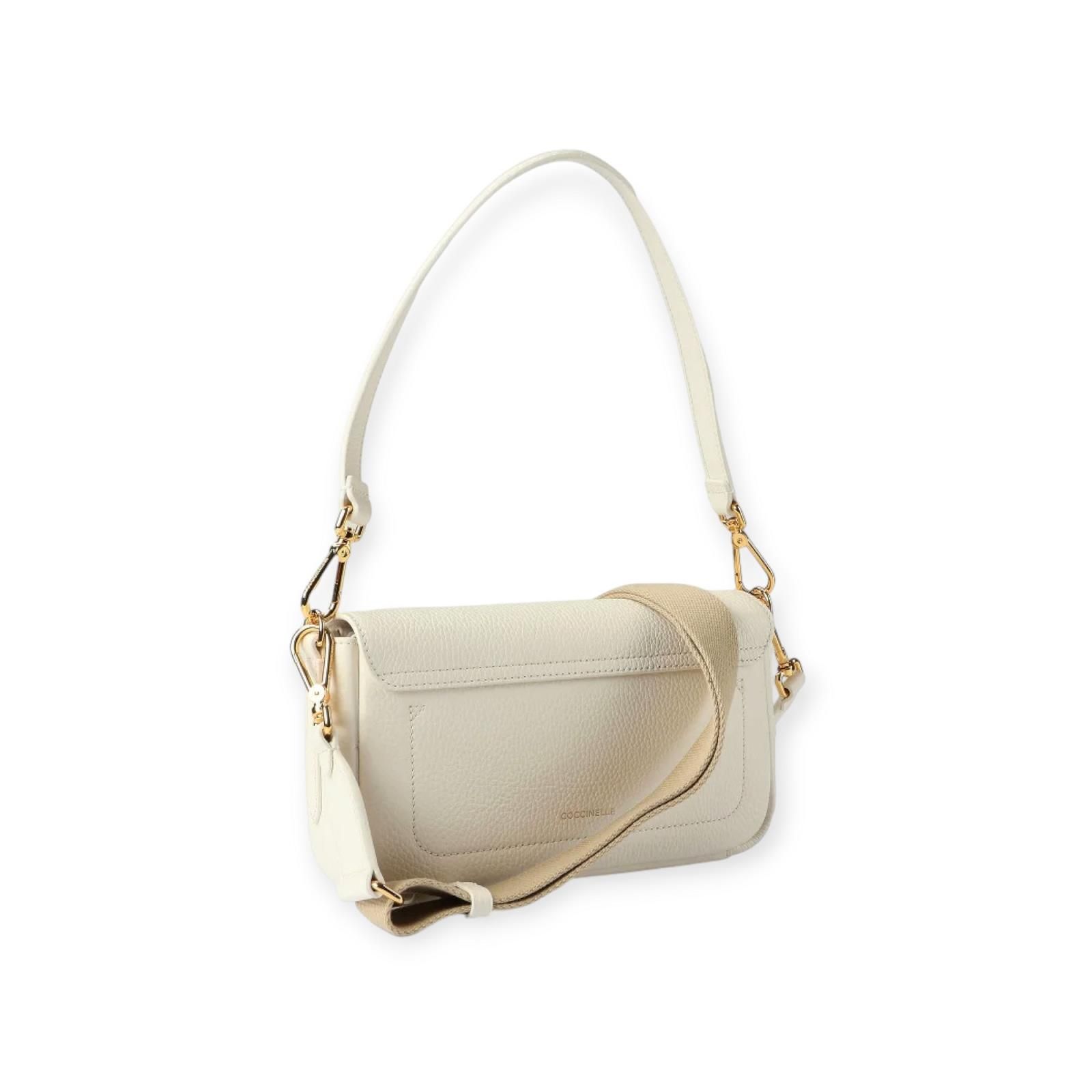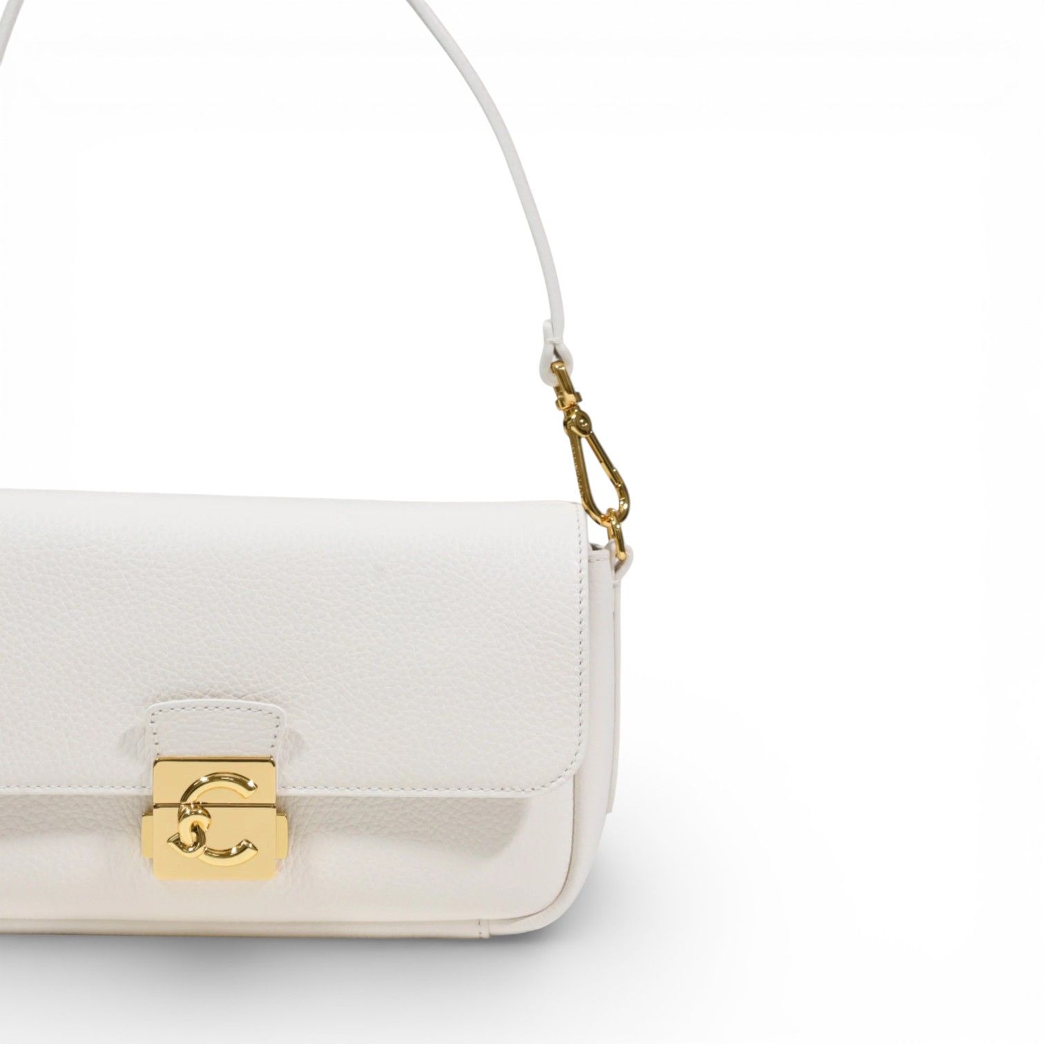 Hand-en schoudertas C-Me Lock Medium van Coccinelle voor dames. Deze nieuwe lijn is de verfijnde lijn van het C-Me Logo met een moderner en opvallendere sluiting die het eigentijdse karakter benadrukt. Is in offwit leer met een drukknoopsluiting aan de zijkant. Heeft een afneembare schouderband die verstelbaar is. Heeft steekvakken waarvan 1 met ritssluiting.