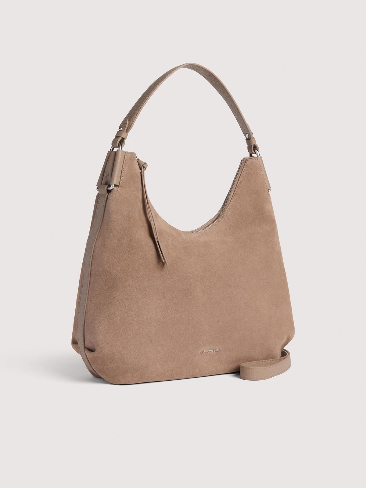 Hand- en schoudertas Coccinelle Rebekka in taupe suède. Deze schoudertas heeft een handvat in taupe leer afgewerkt met een karabijnhaak aan de zijkant als extra detail. Is afgesloten met een ritssluiting. De binnenkant is zeer ruim met 2 steekvakken en een ritsvak. Het logo is gestempeld in goud.