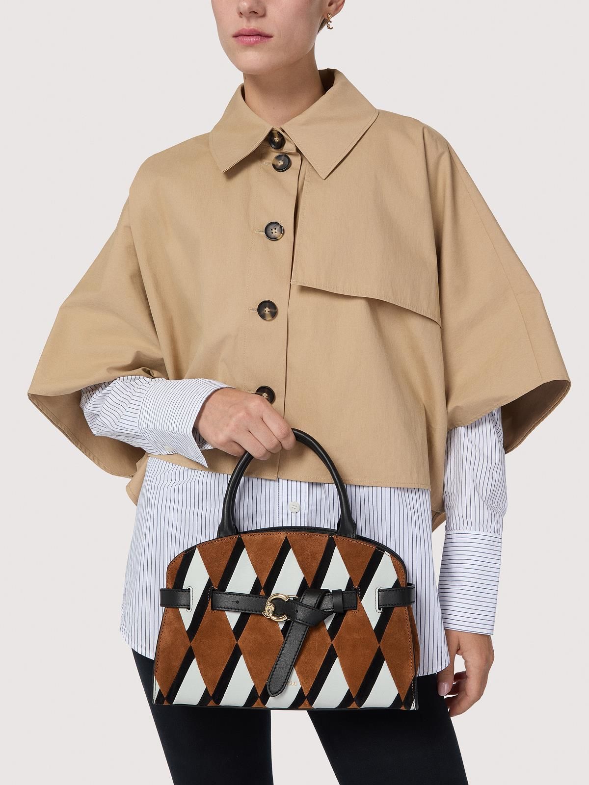 Hand -en schoudertas Sabine van Coccinelle voor dames. Deze prachtige handtas is met geometrische en verfijnde rondingen in cognac suède. Is mooi afgewerkt met cognac leder handvaten. Heeft een afneembare en verstelbare schouderband. Is onderverdeeld in 3compartimenten waarvan 1 met rits, 1 met magneetknop en 1 met klep waar er nog een steekvakje met rits is.