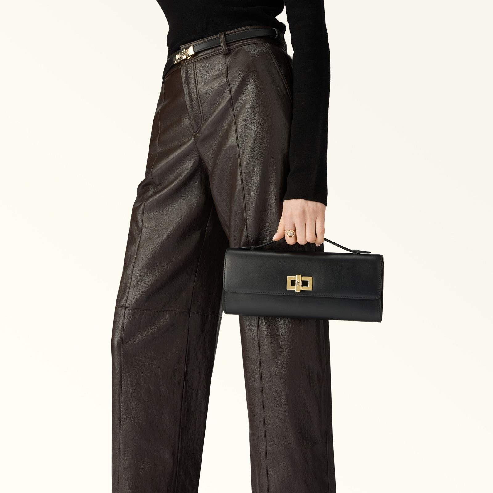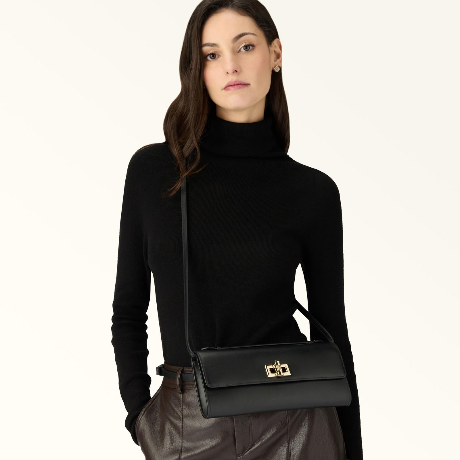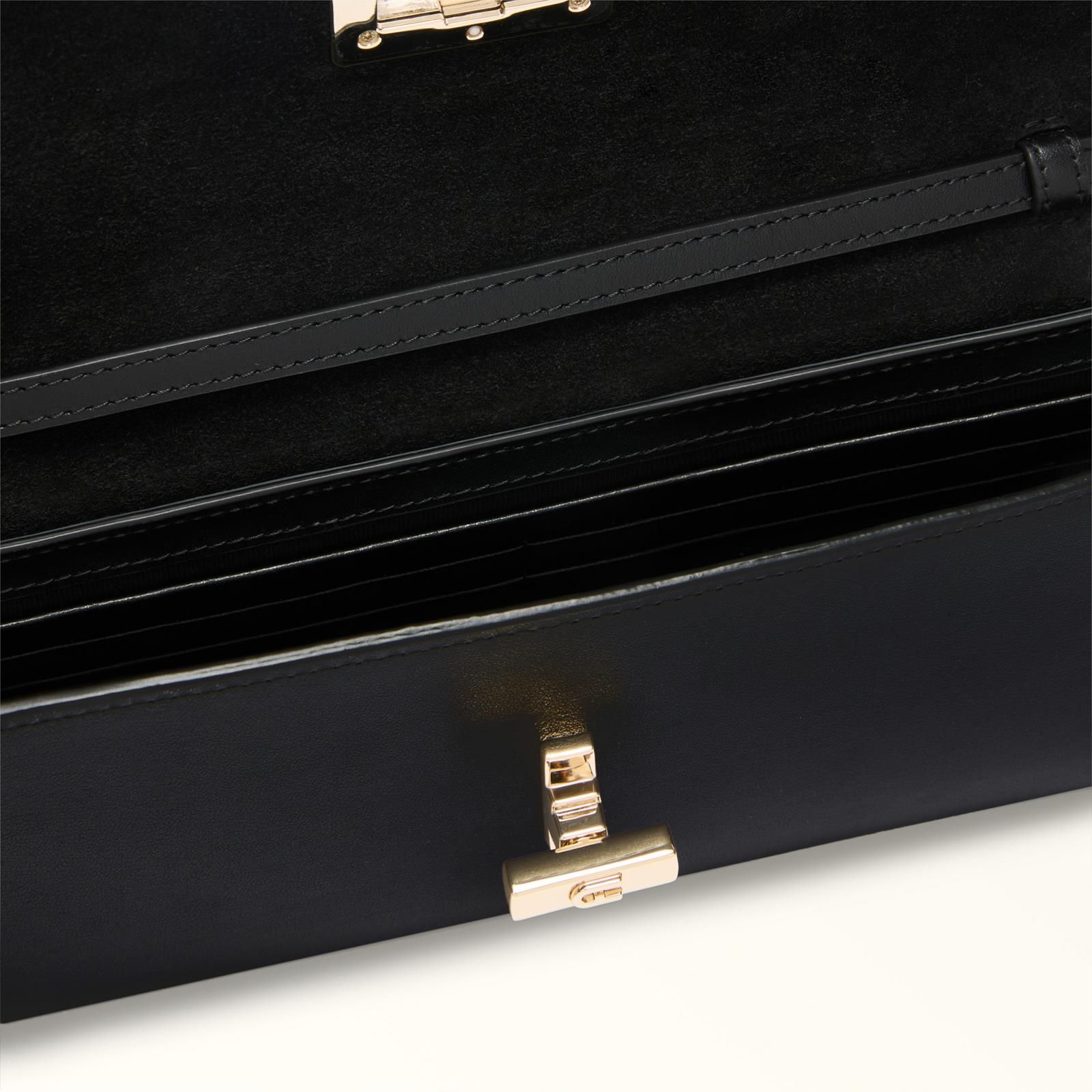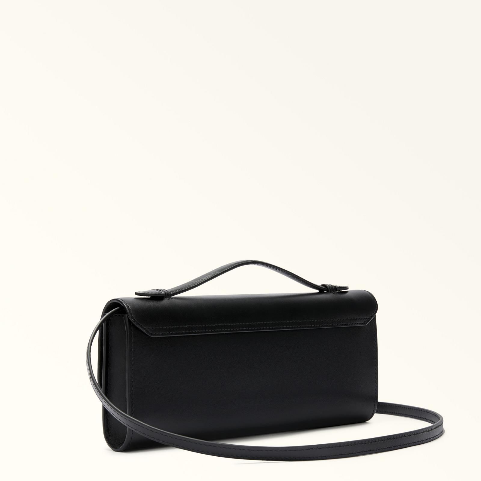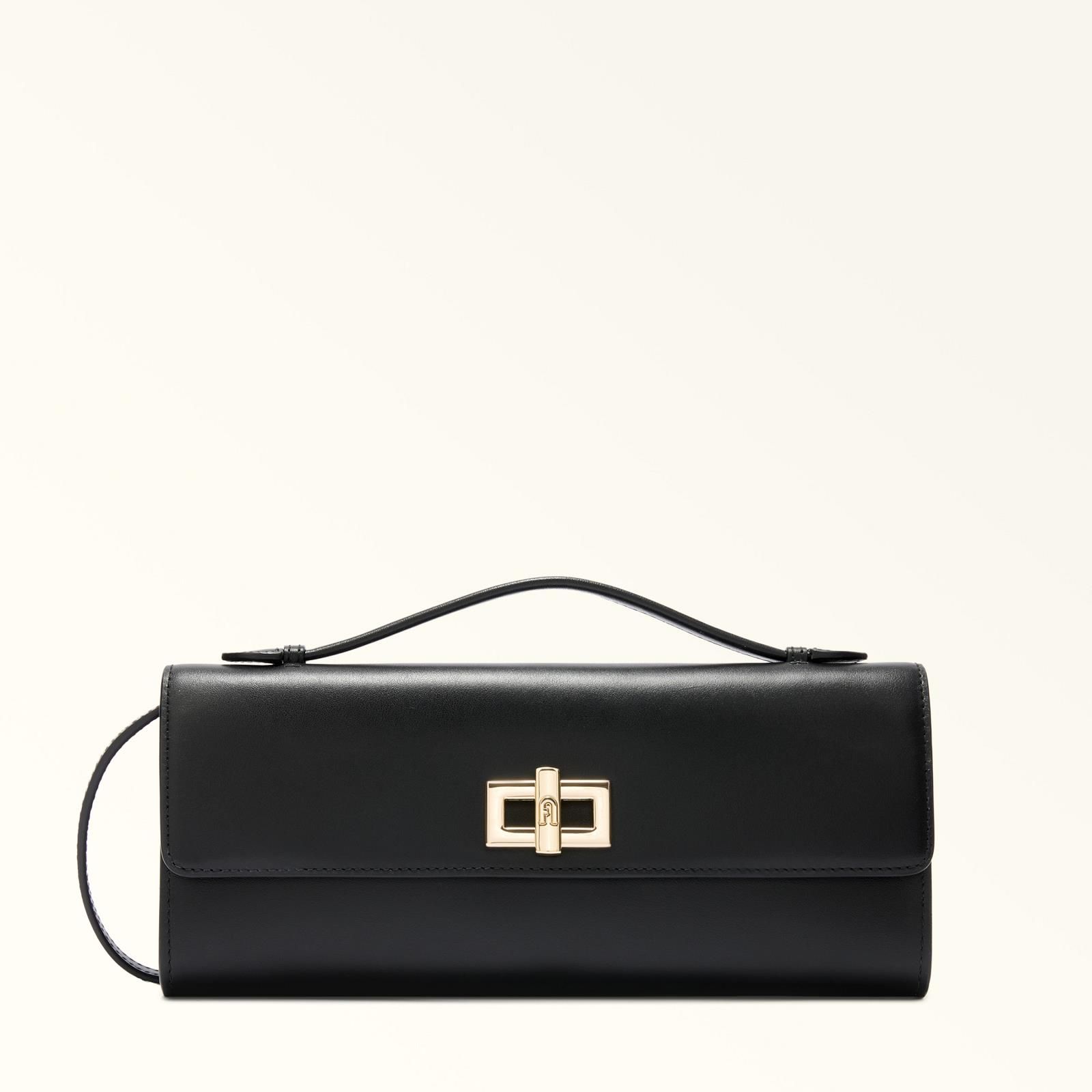 Clutch Clara van Furla voor dames. Deze clutch , is in zwart nappaleer. Heeft een elegant ‘baguette’ design. Heeft een bijpassende schouderband om dit model als crossbody te gebruiken. Of het binnin wegstoppen om een verfijnde clutch te creëren. Is mooi afgewerkt met een handvat aan de bovenkant en het iconisch logo verwerkt in de draaisluiting. Is afgesloten met een flap en draaisluiting. Heeft binnenin 3 steekvakjes.
