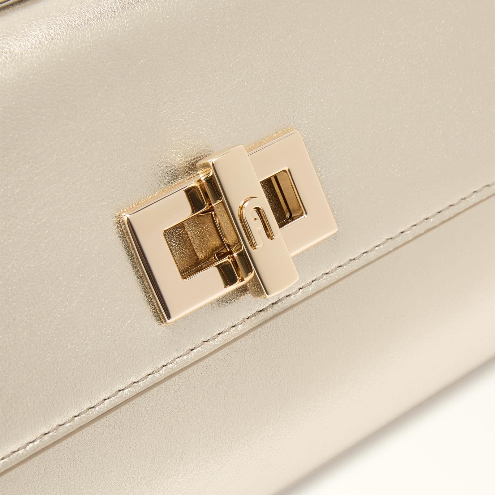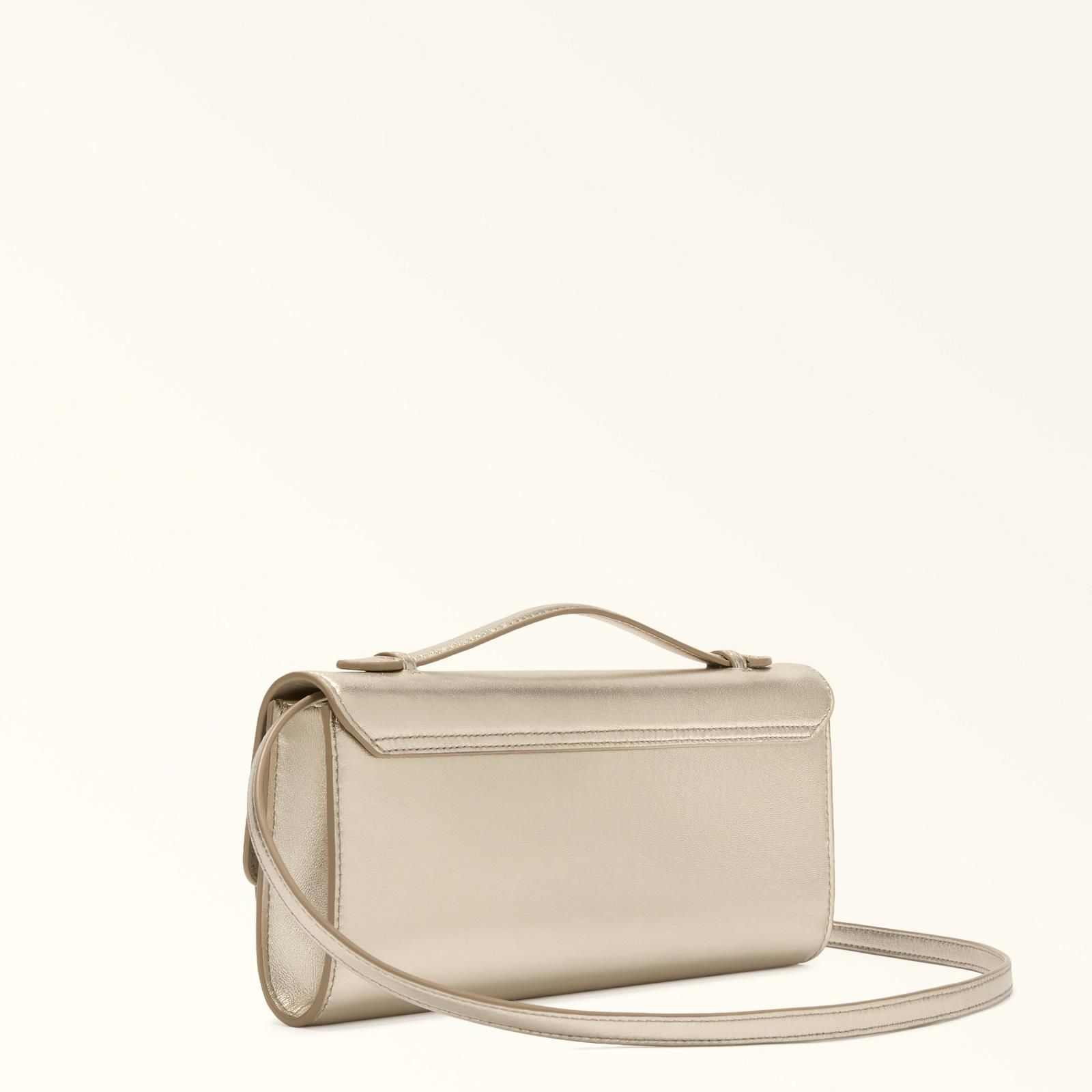 Clutch Clara van Furla voor dames. Deze clutch , is in goud metallic nappaleer. Heeft een elegant ‘baguette’ design. Heeft een bijpassende schouderband om dit model als crossbody te gebruiken. Of het binnin wegstoppen om een verfijnde clutch te creëren. Is mooi afgewerkt met een handvat aan de bovenkant en het iconisch logo verwerkt in de draaisluiting. Is afgesloten met een flap en draaisluiting. Heeft binnenin 3 steekvakjes.