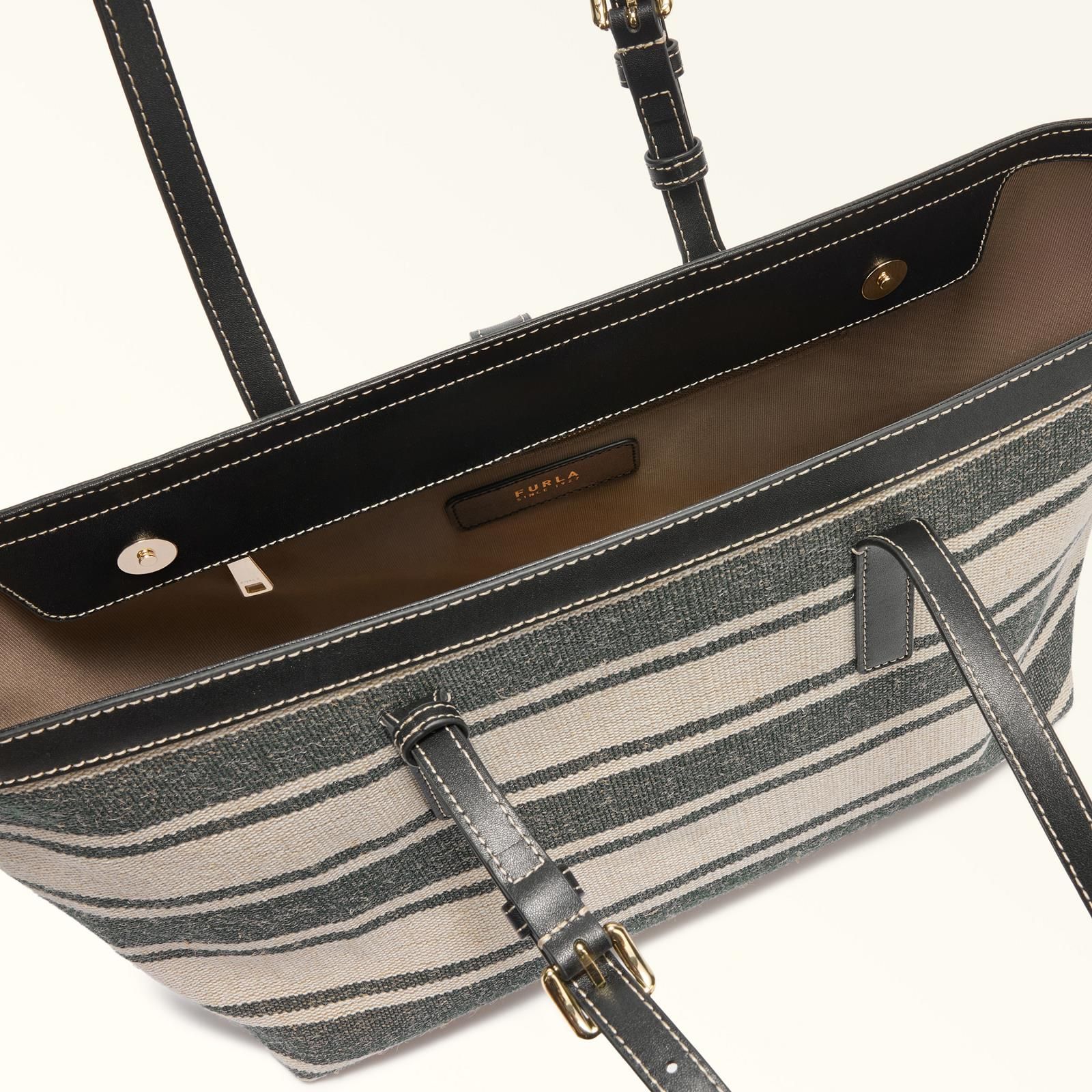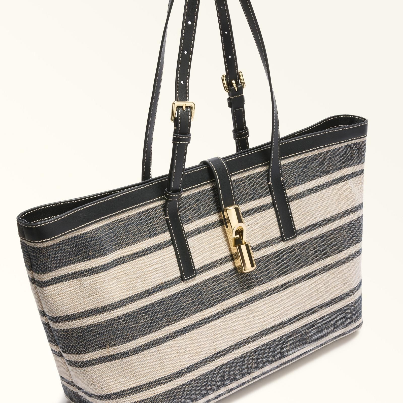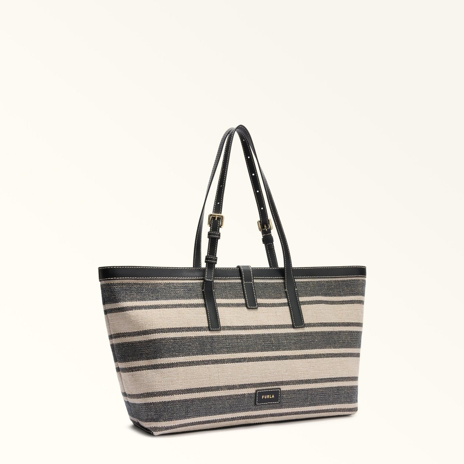 Shopper Debby Tote Large van Furla voor dames. Deze handtas is gemaakt van canvas met een gestreepte print en valt op door zijn zachte vorm en contrasterende details met donkerblauw leer. Heeft 2 lange handvatten die verstelbaar zijn. De tas is afgesloten met het nieuwe cilindrische hardware met het iconische Furla Arch-logo magneetsluiting. Heeft binnenin 2 insteekvakken en 1 binnenvak met ritssluiting. Het open interieur biedt deze shopper voldoende ruimte voor je spullen.