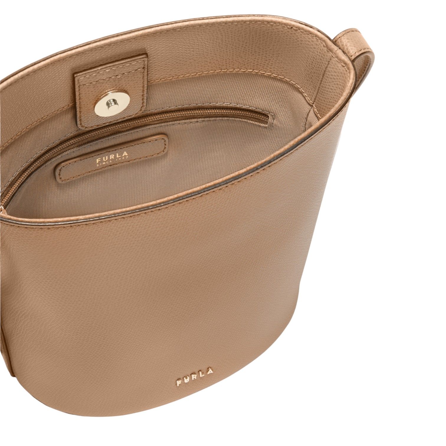 Hand – en schoudertas Roxie van Furla voor dames. Deze handtas is in beige leer. Deze handtas is een compacte bucket tas die je aan de hand kan houden of aanpassen met de vaste verstelbare band voor op de schouder te dragen. Heeft een mooie ‘keychain’ accessoire: een afneembare cilindrische bedel met 2 gevlochten koorden. Is afgesloten met een magneetsluiting en is binnenin een open vak met aan de zijkant 1 steekvak en 1 steekvak met ritssluiting.