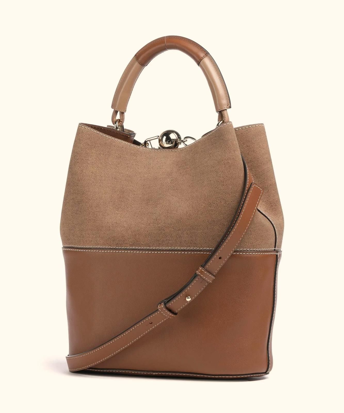 Hand – en schoudertas Sfera medium van Furla voor dames. Deze handtas is de ideale bucket bag voor elke dag: is zowel compact als ruim. Gemaakt van zacht suède met denimeffect en cognac leer. Het iconische Sfera-logo siert de extra sluiting binnenin voor een opvallende finishing touch. Is afgesloten met een magneetsluiting. De binnenkant is volledig gevoerd en bestaat uit 1 afneembare etui met ritssluiting. Heeft een afneembare verstelbare schouderband en de handgreep is ook afneembaar