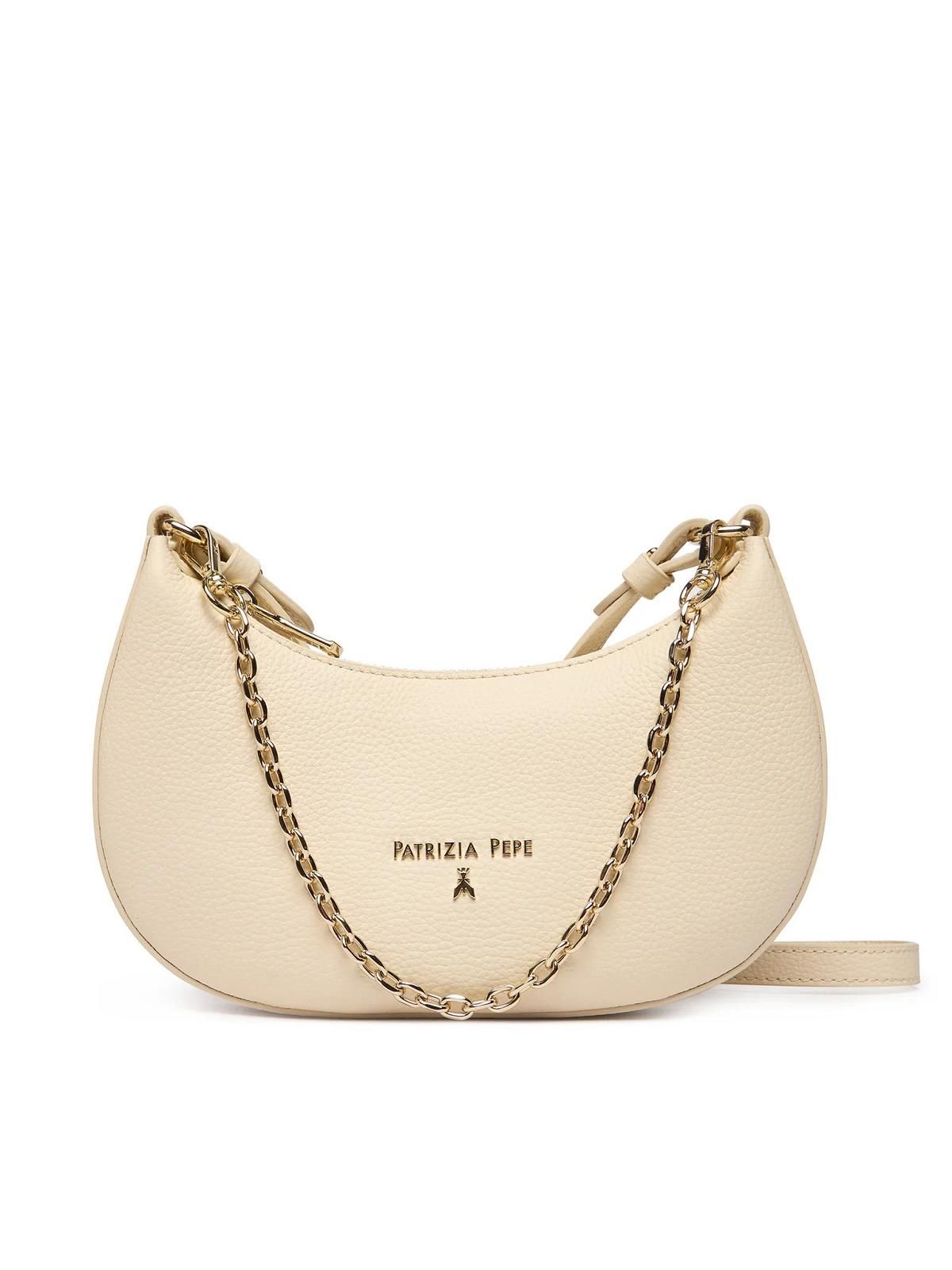 Hand en-schoudertas Borsa Bag van Patrizia Pepe voor dames. Dit elegant handtasje is in off wit / butter leer. Is mooi maanvormig van model met een afneembare, verstelbare schouderband of een afneembare metalen ketting. Is gesloten met een ritssluiting en heeft binnenin 1 steekvakje.