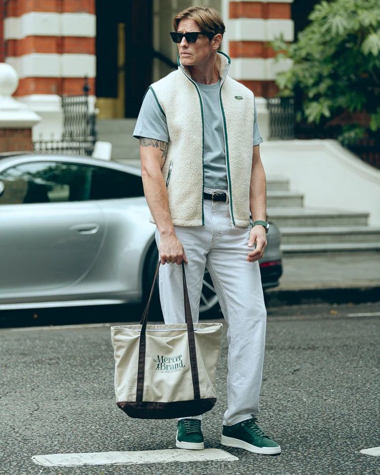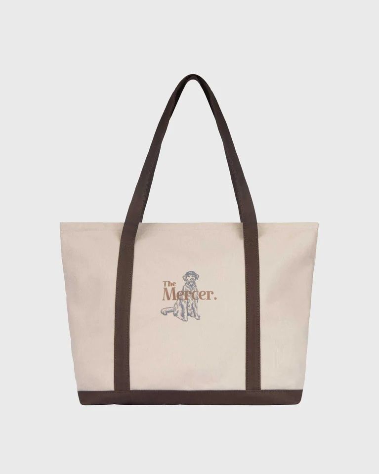 Shopper Canvas Bag van Mercer voor dames en heren. De Mercer Canvas Bag in wit met bruin borduursel is de perfecte mix van stijl en functionaliteit, met een opvallende 'The Mercer Brand'-print. Ruim en duurzaam, ideaal voor boodschappen, sportbenodigdheden of dagelijks gebruik.