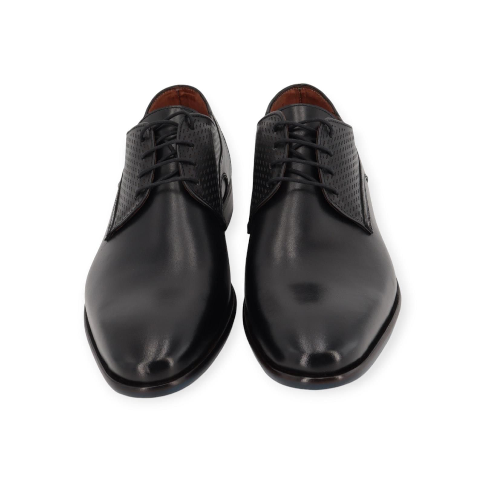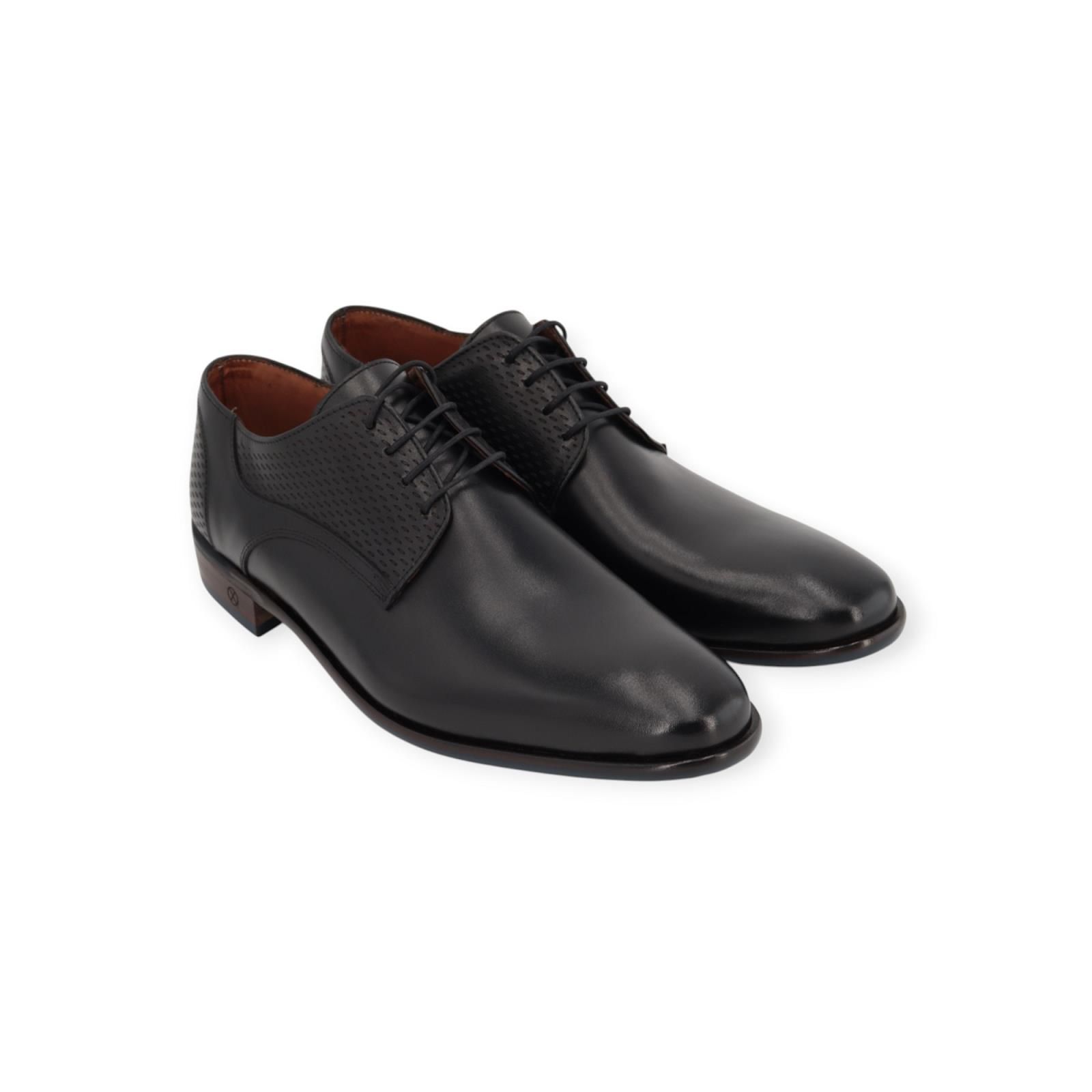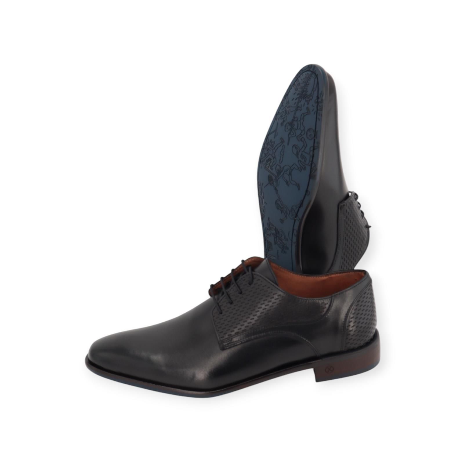 Veterschoen Igor van Ambiorix voor heren. Deze veterschoen is in zwart zacht kalfsleer. Mooi afgewerkt met een subtiele laserprint aan de zijkant en hielflap. Is op een rubberen buitenzool in blauw antislip met olympische spelen print. Combineer deze met blauwe of zwarte veters.