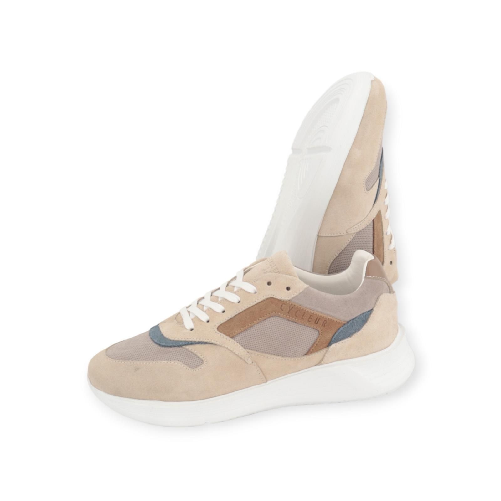 Sneaker Angliru RP4 van Cycleur De Luxe voor heren. Deze sneaker is in zand suède met bruine tinten en blauwe accenten. Heeft aan de zijkanten en neus lichte mesh stukken. Is afgewerkt met witte veters. Heeft een dikke zool die zeer licht aanvoelt met een dempende uitneembare binnenzool.