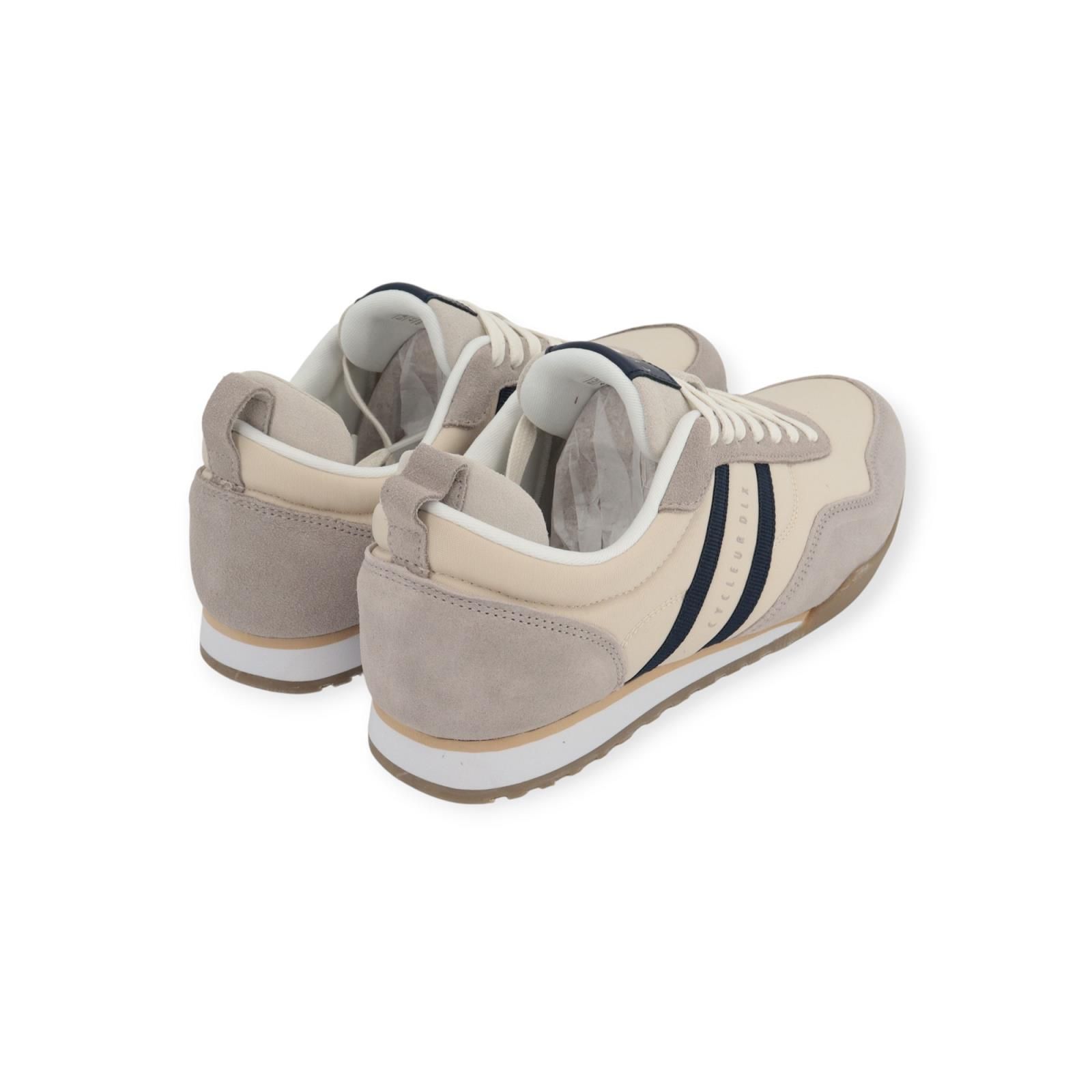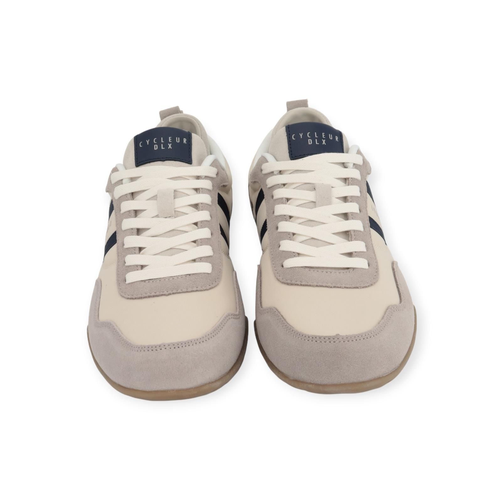 Sneaker CR14 van Cycleur De Luxe voor heren. Deze sneaker is in beige nylon met grijs suède. Is afgewerkt met een extra hielkussen voor nog meer comfort. Heeft een uitneembare binnenzool en een zacht dempende buitenzool.