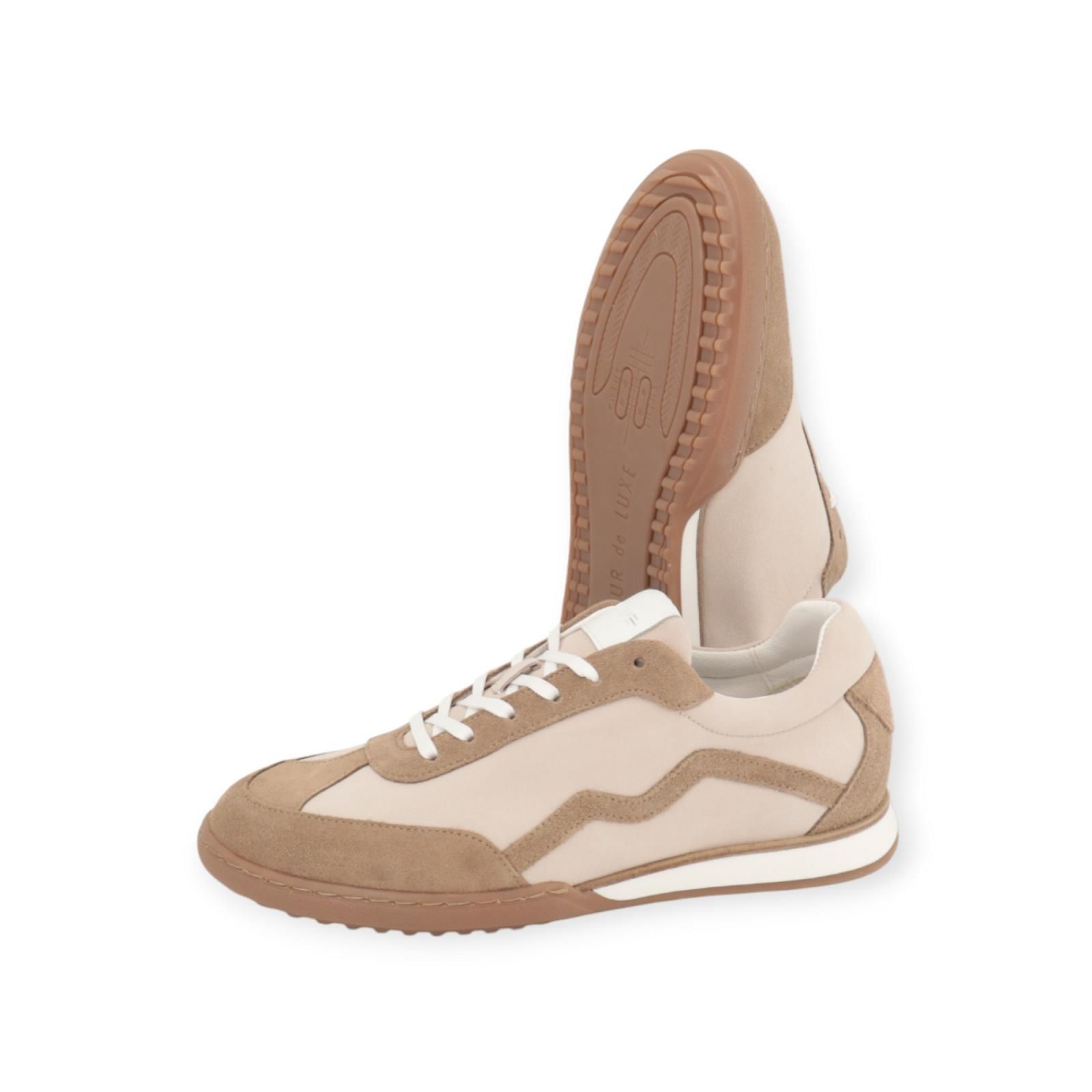 Sneaker New Crash 2 van Cycleur De Luxe voor heren. Deze lage sneaker is in licht beige suède met beige stukken en lijnen suède afgewerkt. Heeft een aangename lichte gummyzool met een dempende uitneembare binnenzool.