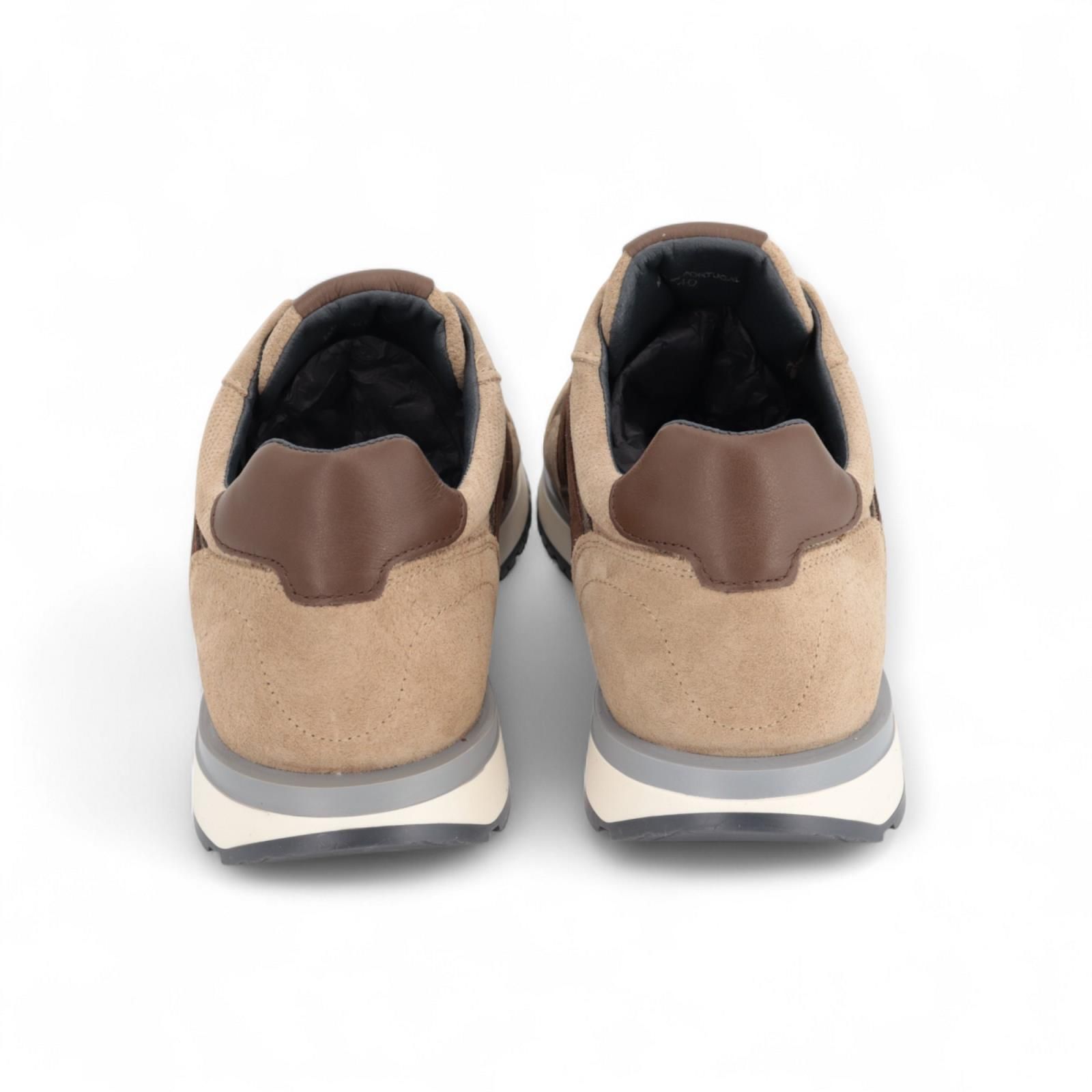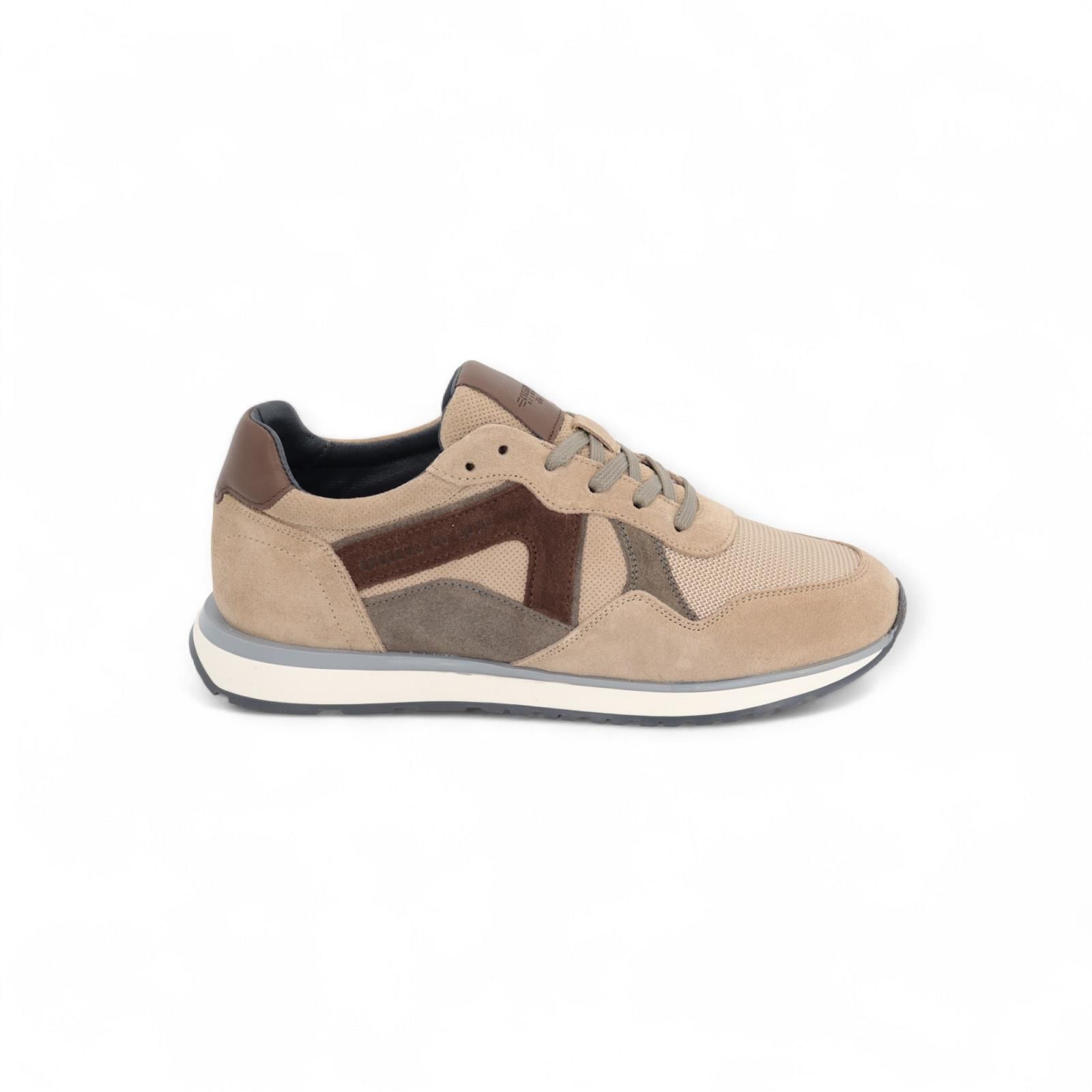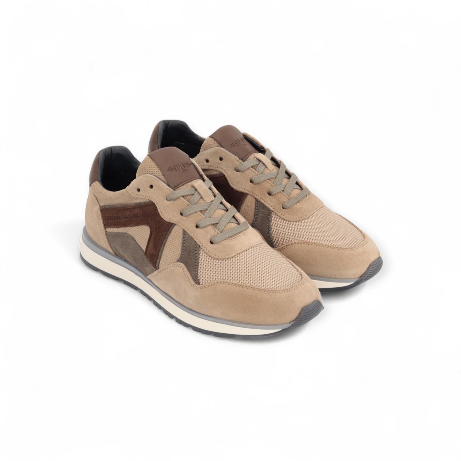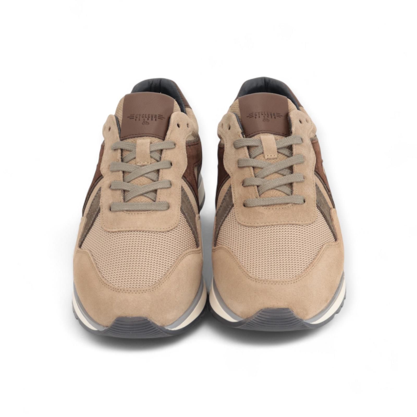 Sneaker P2 van Cycleur De Luxe voor heren. Deze runner is in zand mesh/ suède met bruine en taupe stukken aan de zijkant. Heeft een bruine leren hielflap. De binnenzool is uitneembaar en de rubberen buitenzool is afgewerkt met bovenaan een grijze rand.
