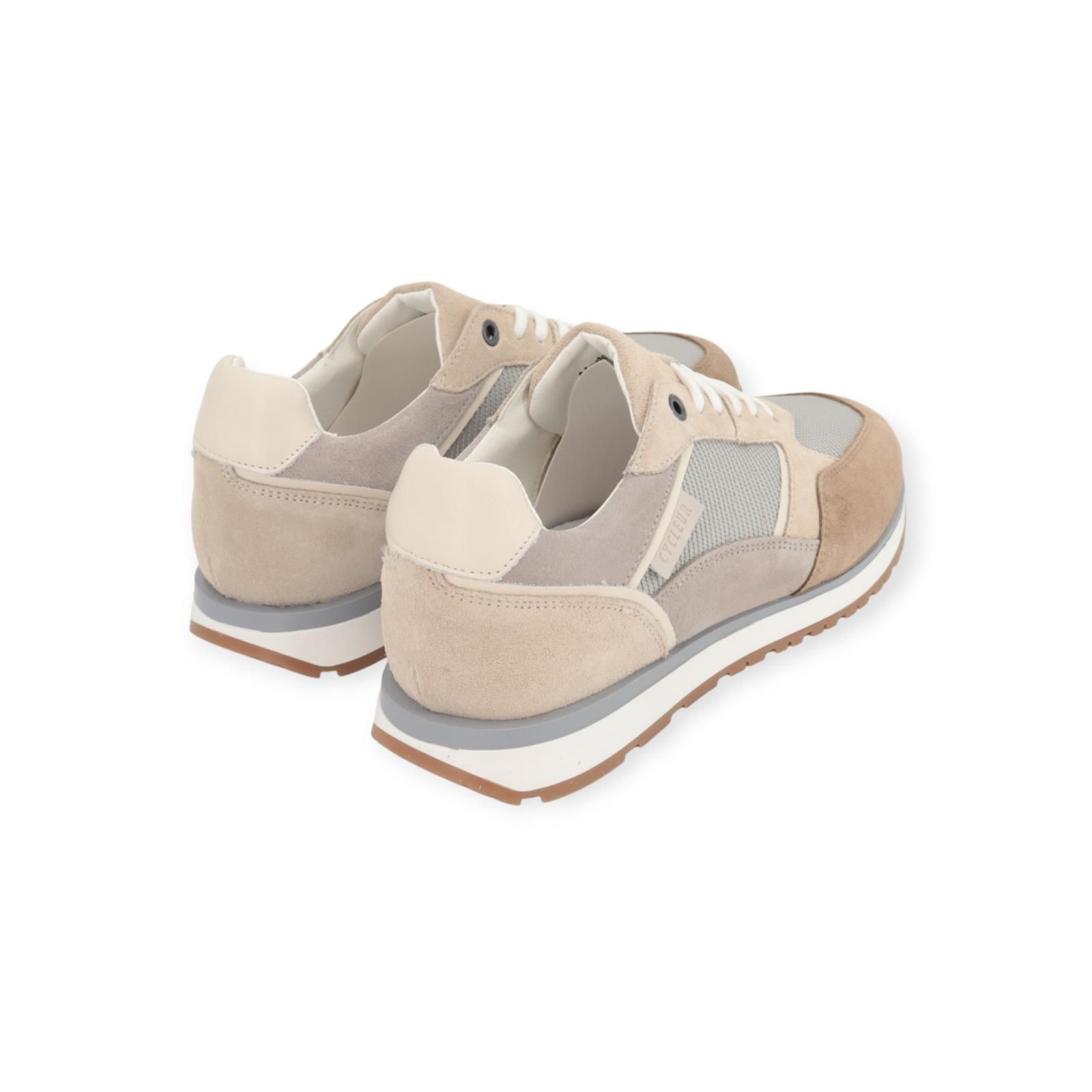 Sneaker P4 VAN Cycleur De Luxe voor heren. Deze runner is in beige suède tinten met grijze mesh. Afgewerkt met off wit leer en witte veters, met een 2laag zool in grijs en wit. De binnenzool is uitneembaar.