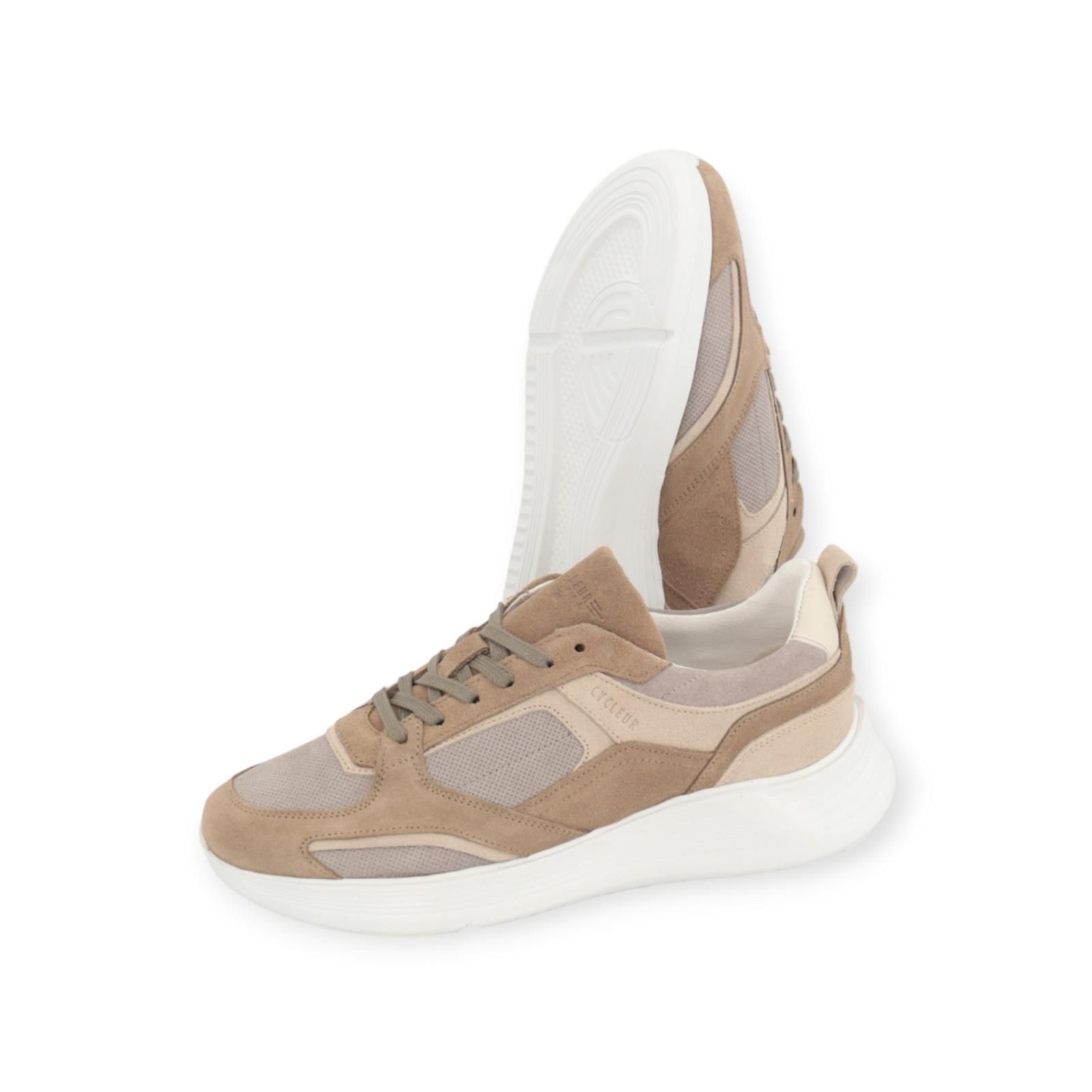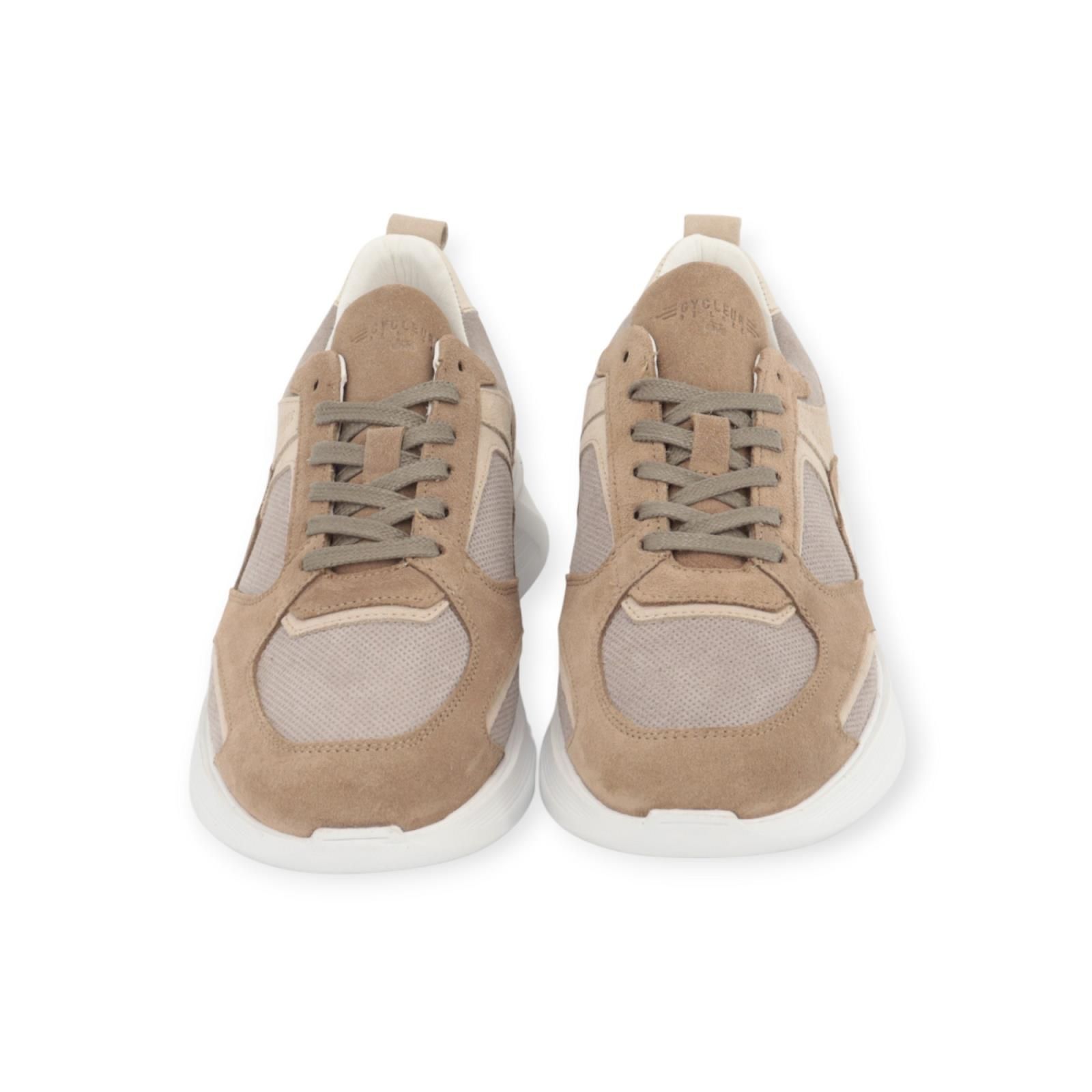 Sneaker Shifter RP3 van Cycleur De Luxe voor heren. Deze sneaker is in beige suède met zand tinten. Heeft aan de zijkanten en neus lichte mesh stukken. Heeft een dikke zool die zeer licht aanvoelt met een dempende uitneembare binnenzool.