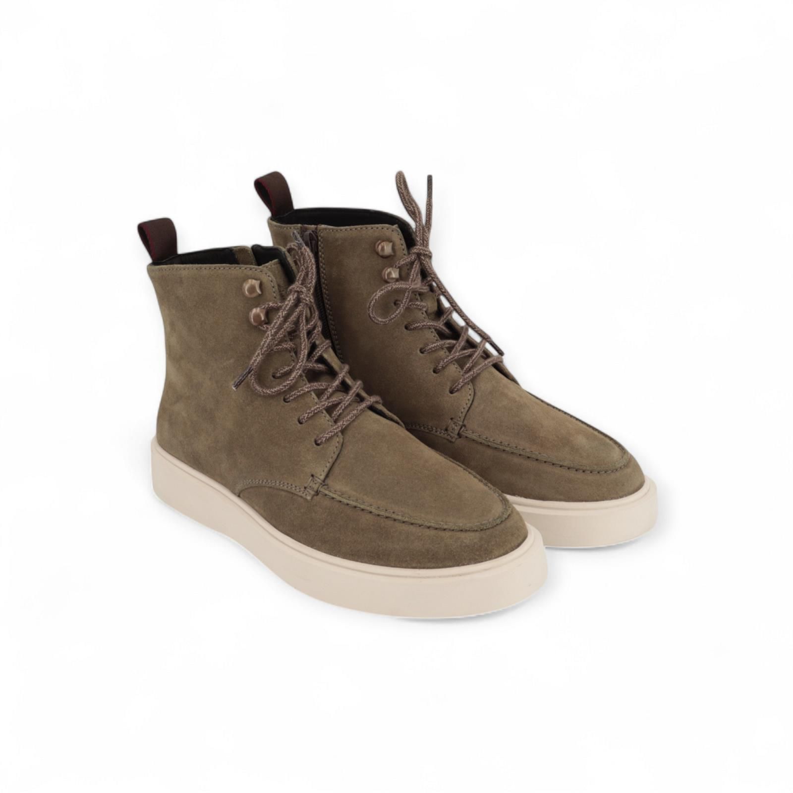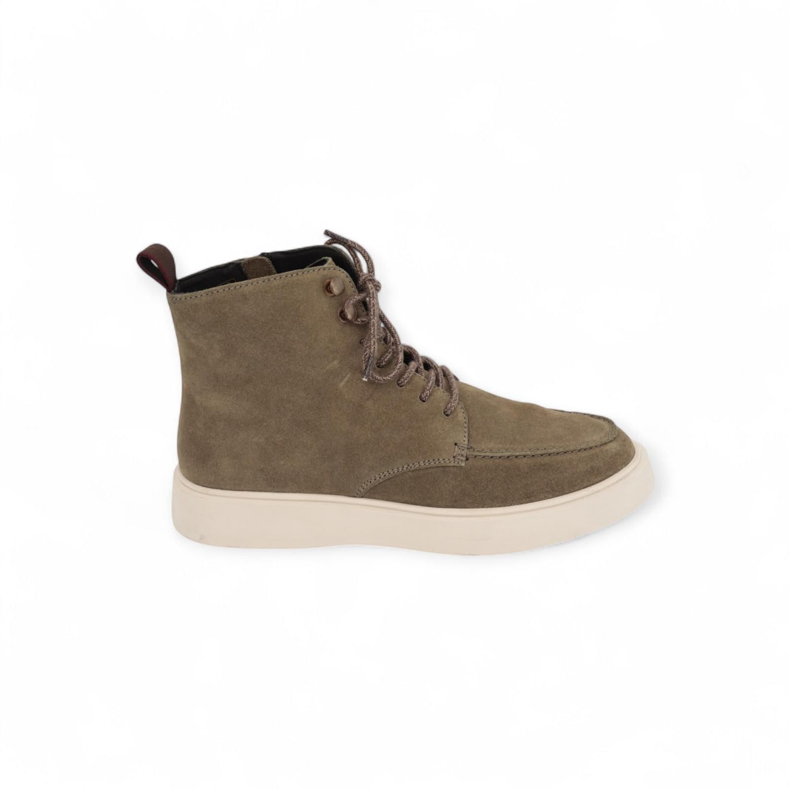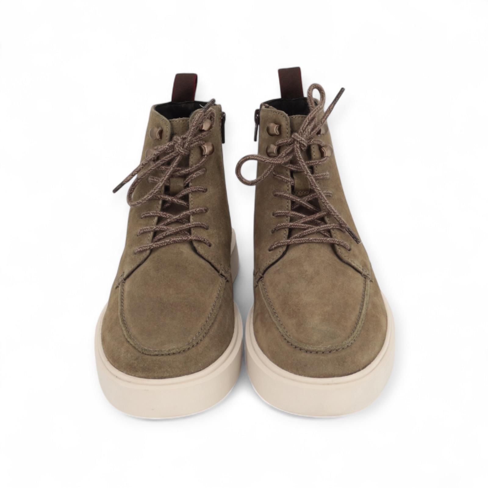 Sneaker VR9 van Cycleur De Luxe voor heren. Deze sneaker komt tot aan de enkel en is in groen suède. Heeft een stekking aan de voorvoet en veters met bovenaan metalen haakjes. Heeft een ritssluiting aan de zijkant en is op een dikke witte sneakerzool. De binnenzool is uitneembaar.
