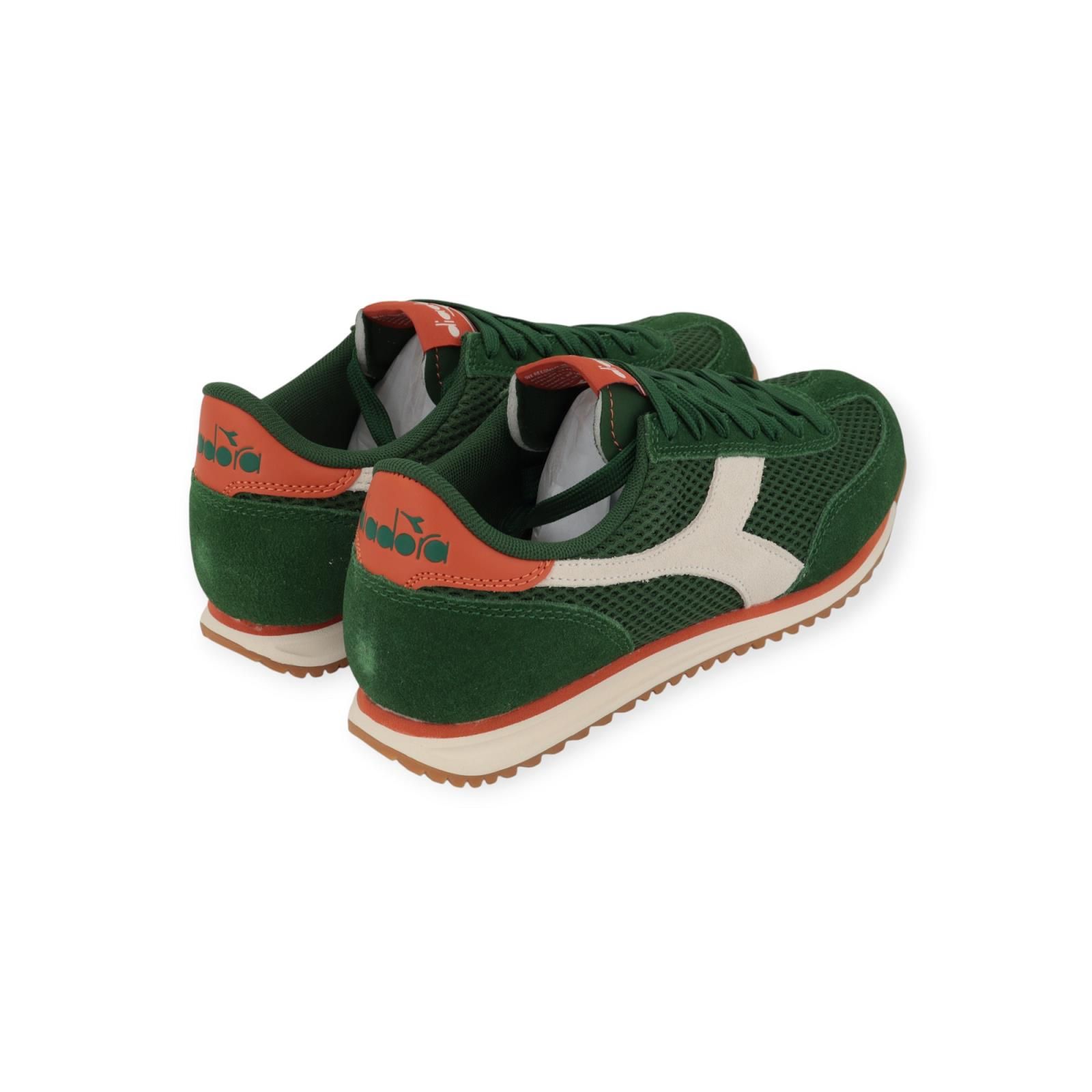 Diadora Cross sneaker voor heren: Deze groene runner combineert de klassieke sneaker met de moderne. De schoen is in groen suède en mesh met witte accenten en Diadora lijnen. Is afgewerkt met een oranje hielflap.