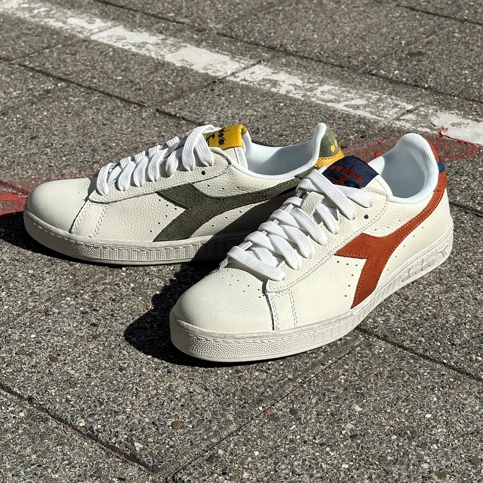 Deze Game L Low Diadora is dé populairste stijl aller tijden. Dit is de lage versie en is volledig uitgevoerd in off wit leer met aan de zijkant het Diadora patroon in oranje suède. De hielflap is eveneens in oranje met blauw leer. Dit model is unisex.