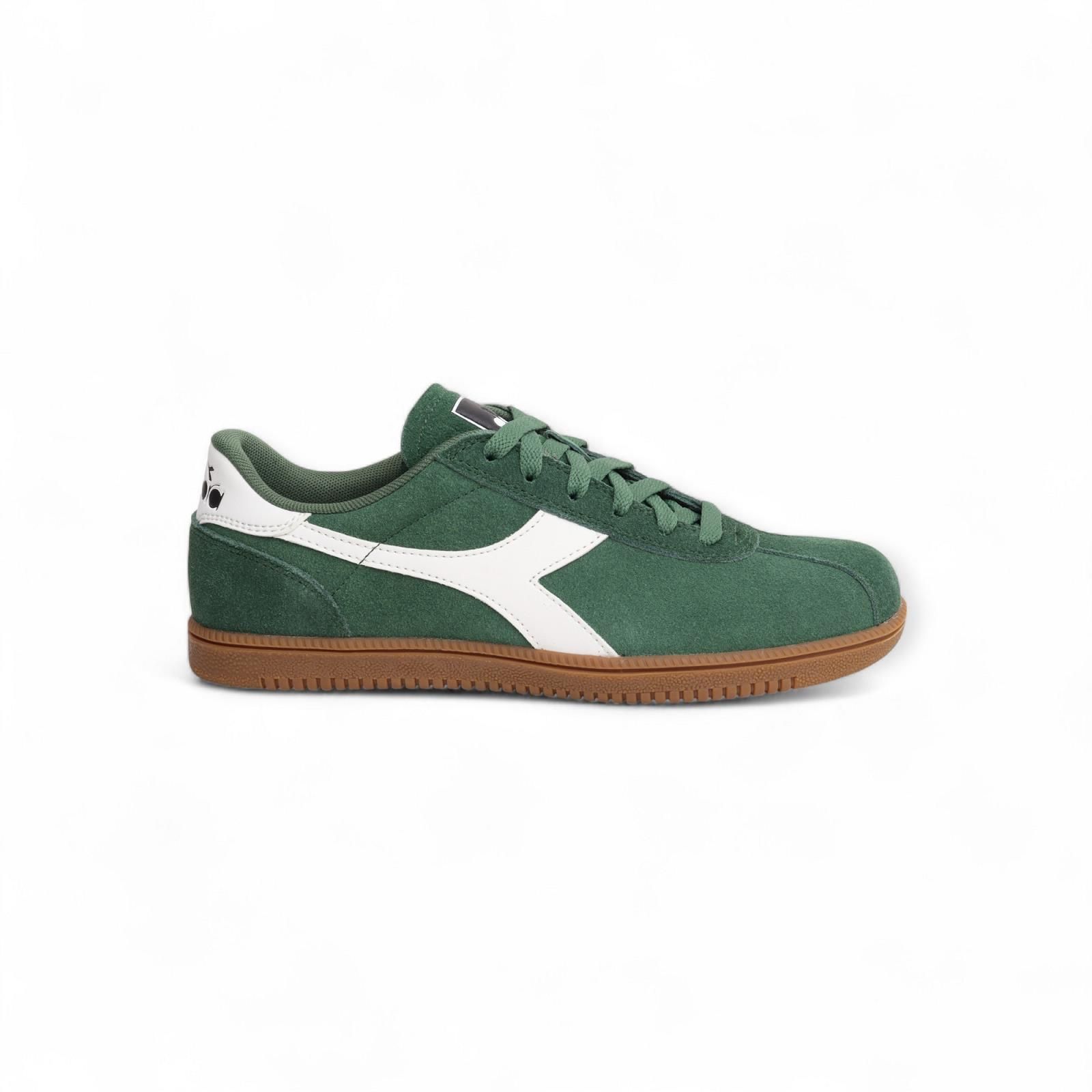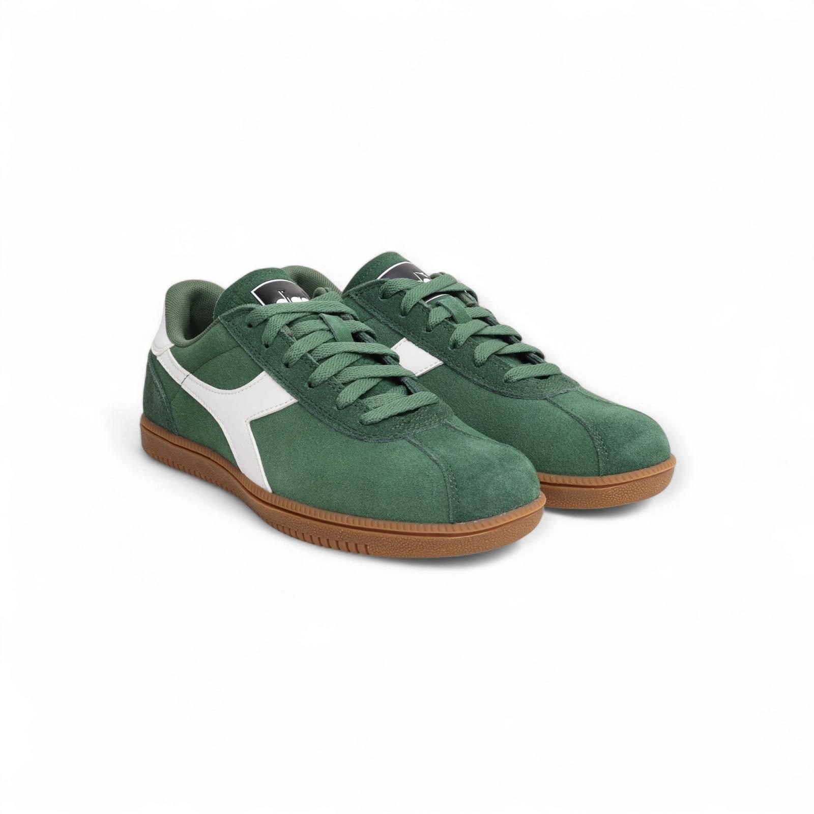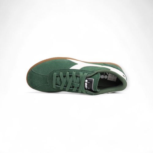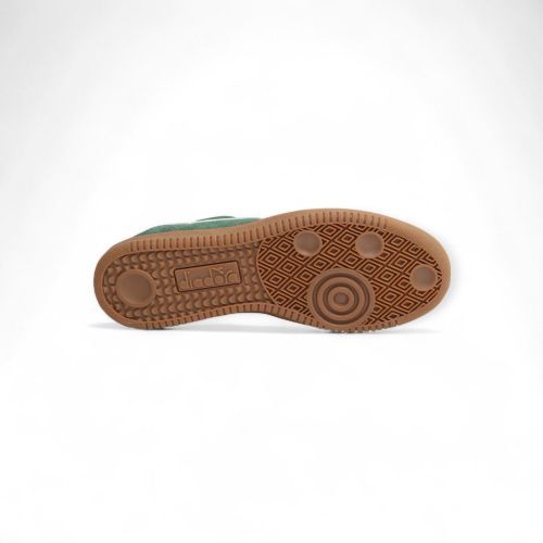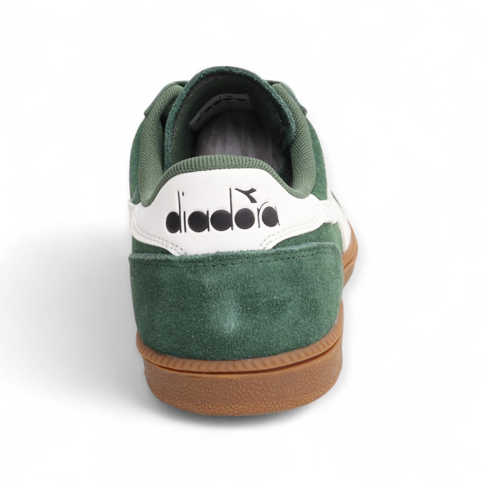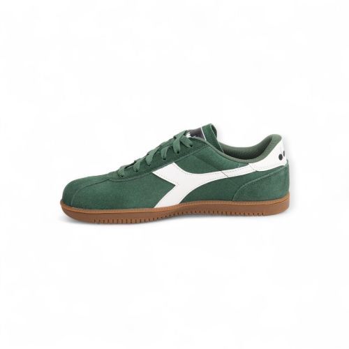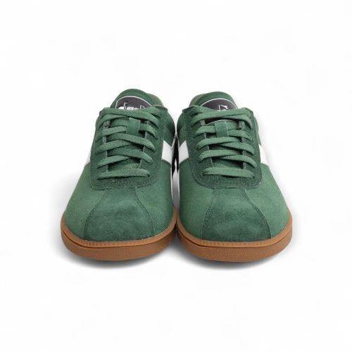 Deze heren Tokyo trainer model van Diadora maakt een comeback in de sneakerwereld. Het model is typerend aan hun zool: comfortabel, klassiek en een zool met handbal drukpunten. Deze versie is uitgevoerd in groen suède met witte Diadora strepen en een wit hiellip met Diadora erin.