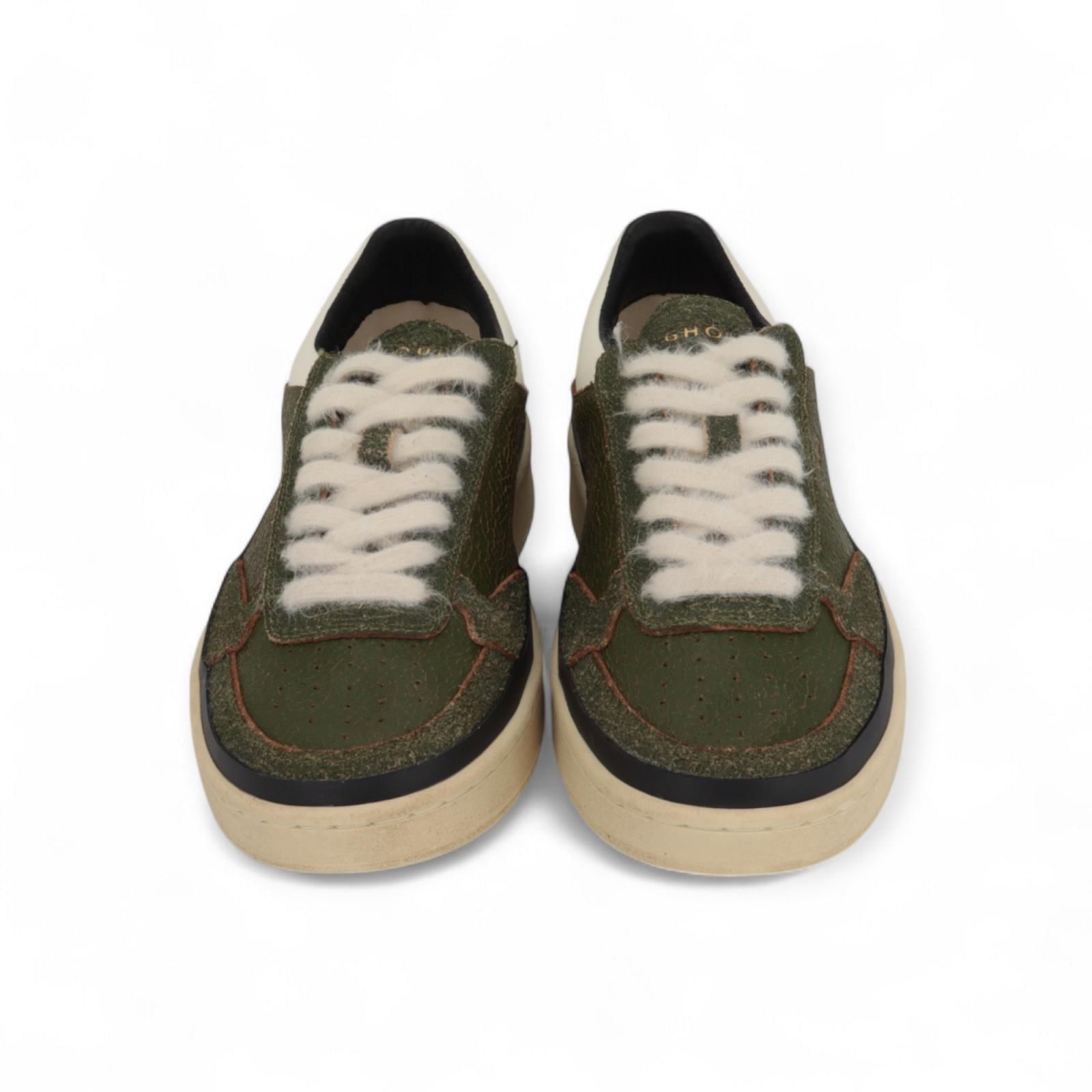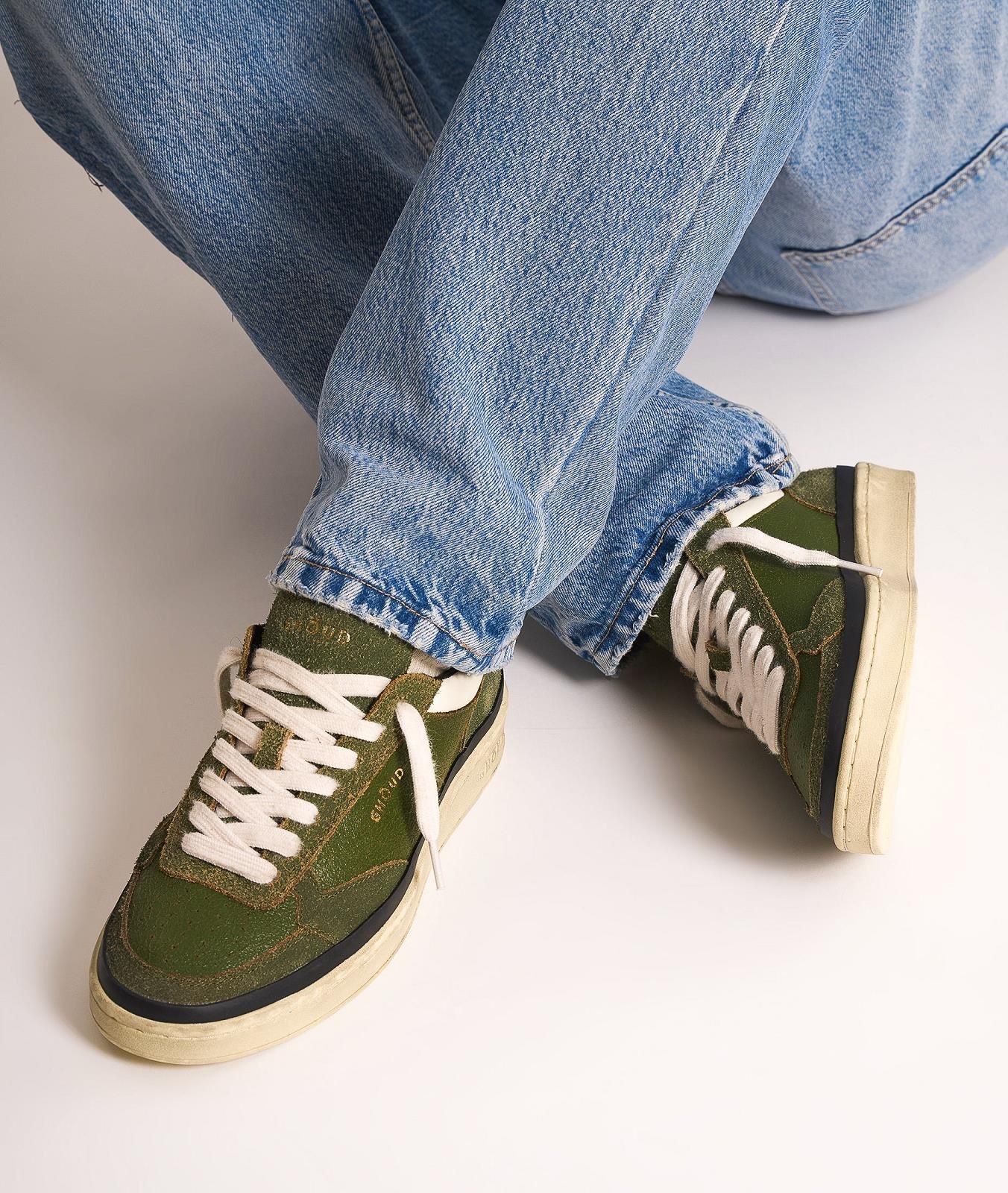 Sneaker Pads Brushed van Ghoud voor heren. Deze sneaker is in groen cracked leer. Heeft een bewust gebarsten ruw effect aan deze hippe sneaker. Is afgewerkt met witte veters en een witte hielflap met rand rond de schoen. De zool is omrand met een blauw leren band en de binnenzool is uitneembaar.