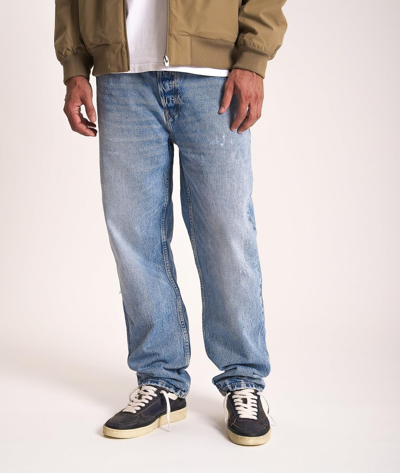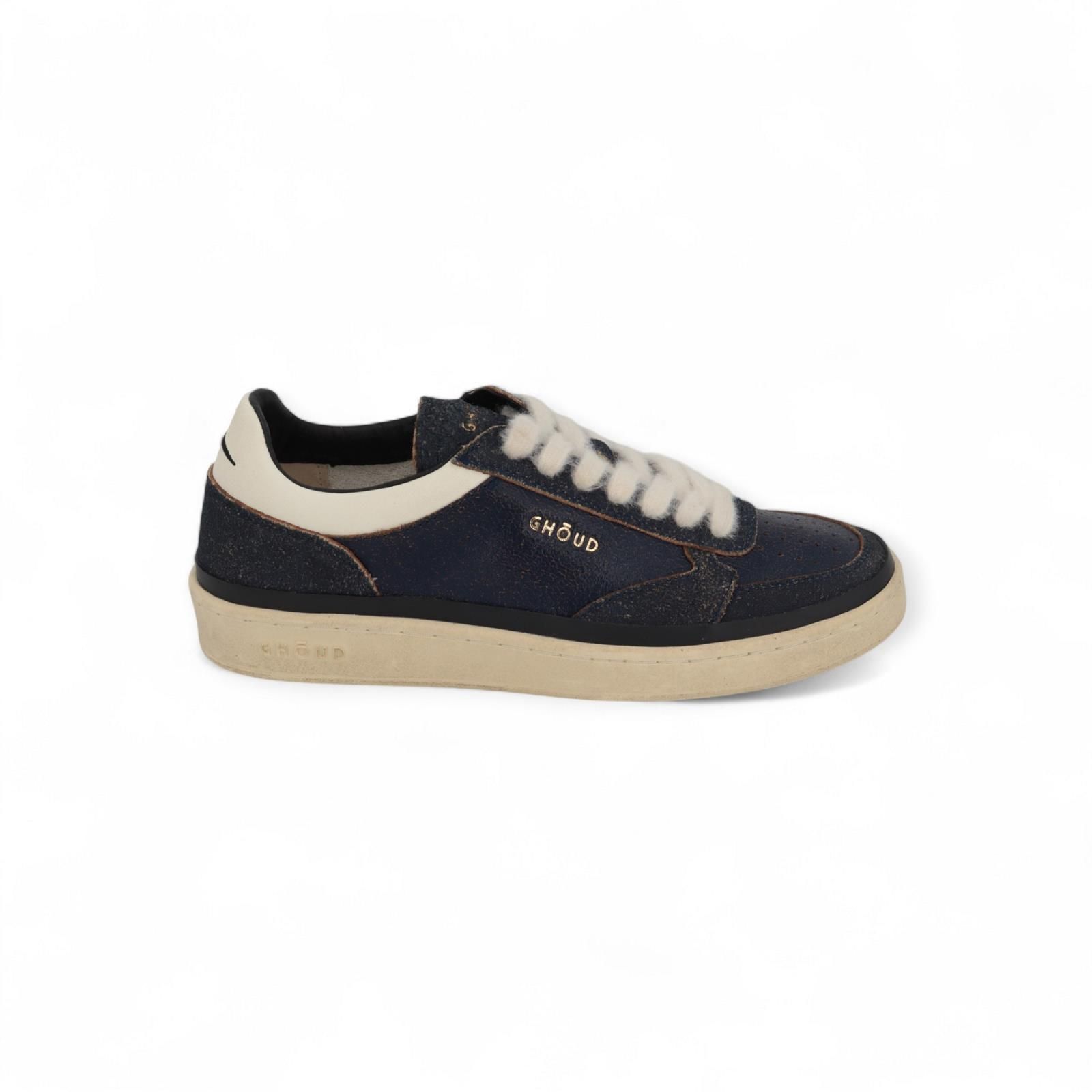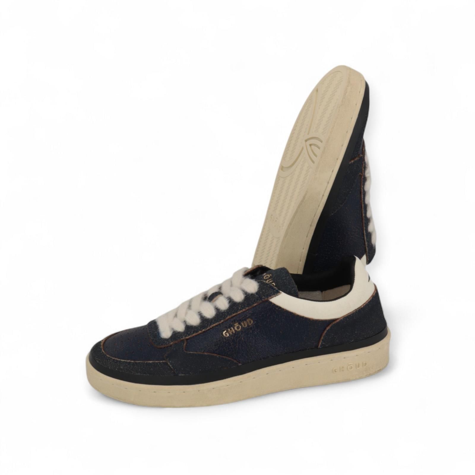 Sneaker Pads Brushed van Ghoud voor heren. Deze sneaker is in blauw cracked leer. Heeft een bewust gebarsten ruw effect aan deze hippe sneaker. Is afgewerkt met witte veters en een witte hielflap met rand rond de schoen. De zool is omrand met een zwart leren band en de binnenzool is uitneembaar.