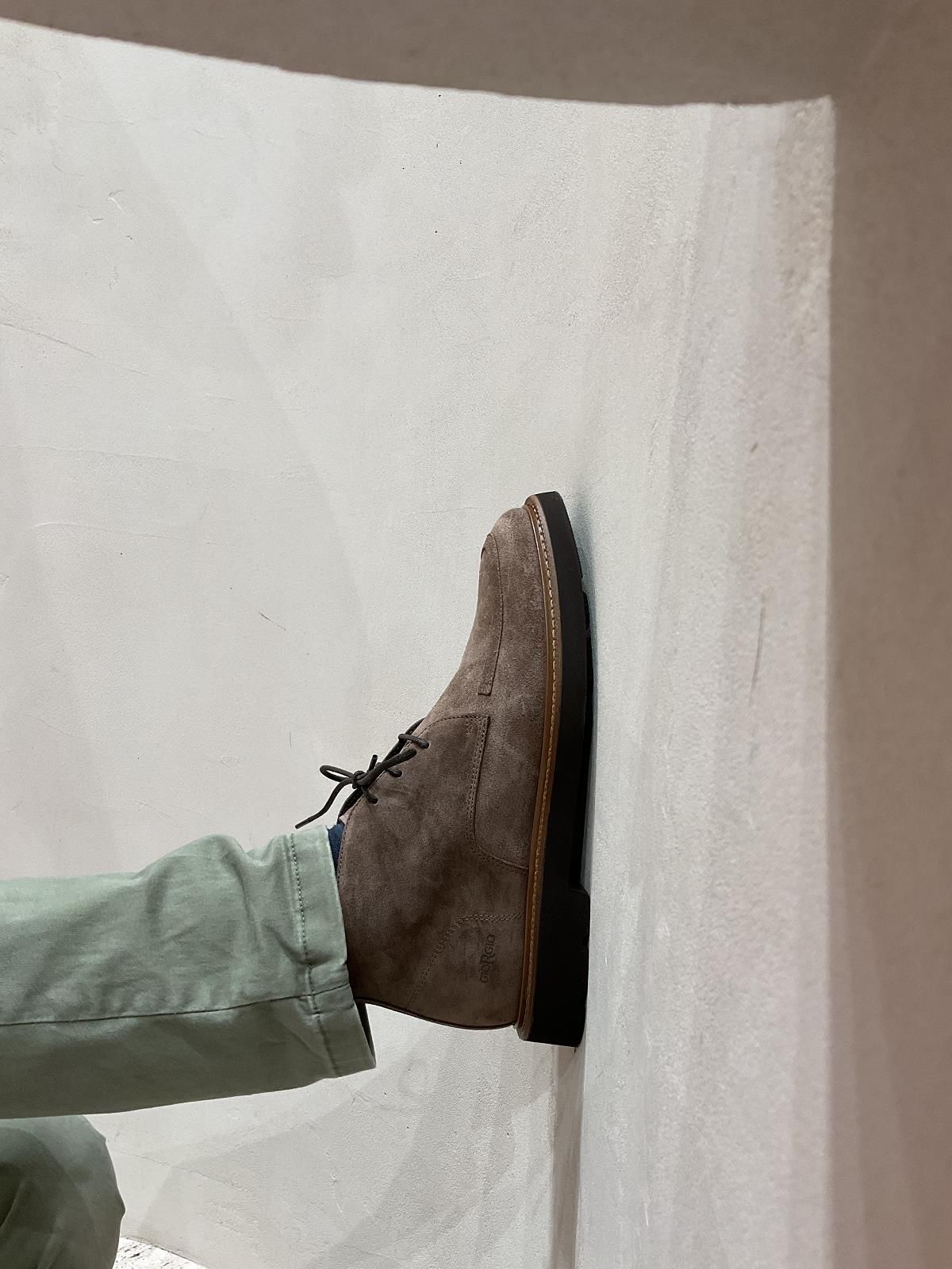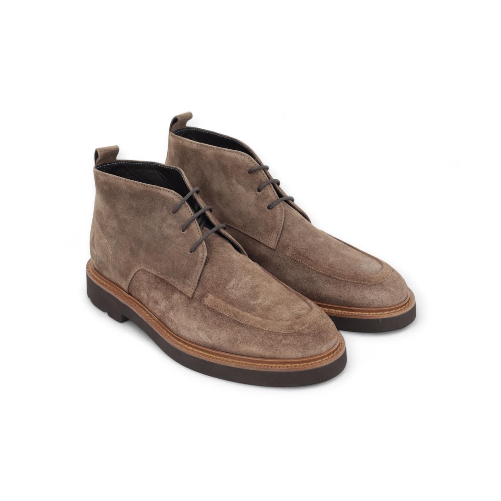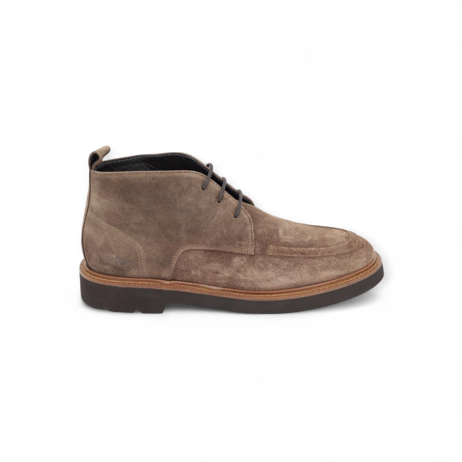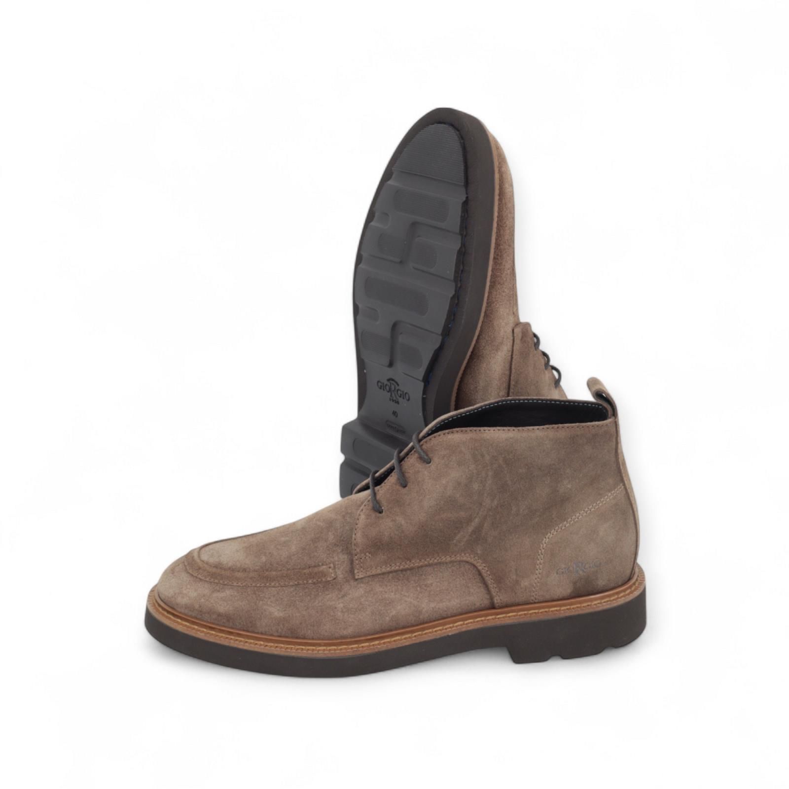 Enkellaars van Giorgio voor heren. Deze enkellaars is in bruine/taupe suède met een vetersluiting. Heeft een extra stekking op de voorvoet die het model nog gekleder maakt. Is op een bruine antislipzool die licht aanvoelt. De binnenzool is uitneembaar.