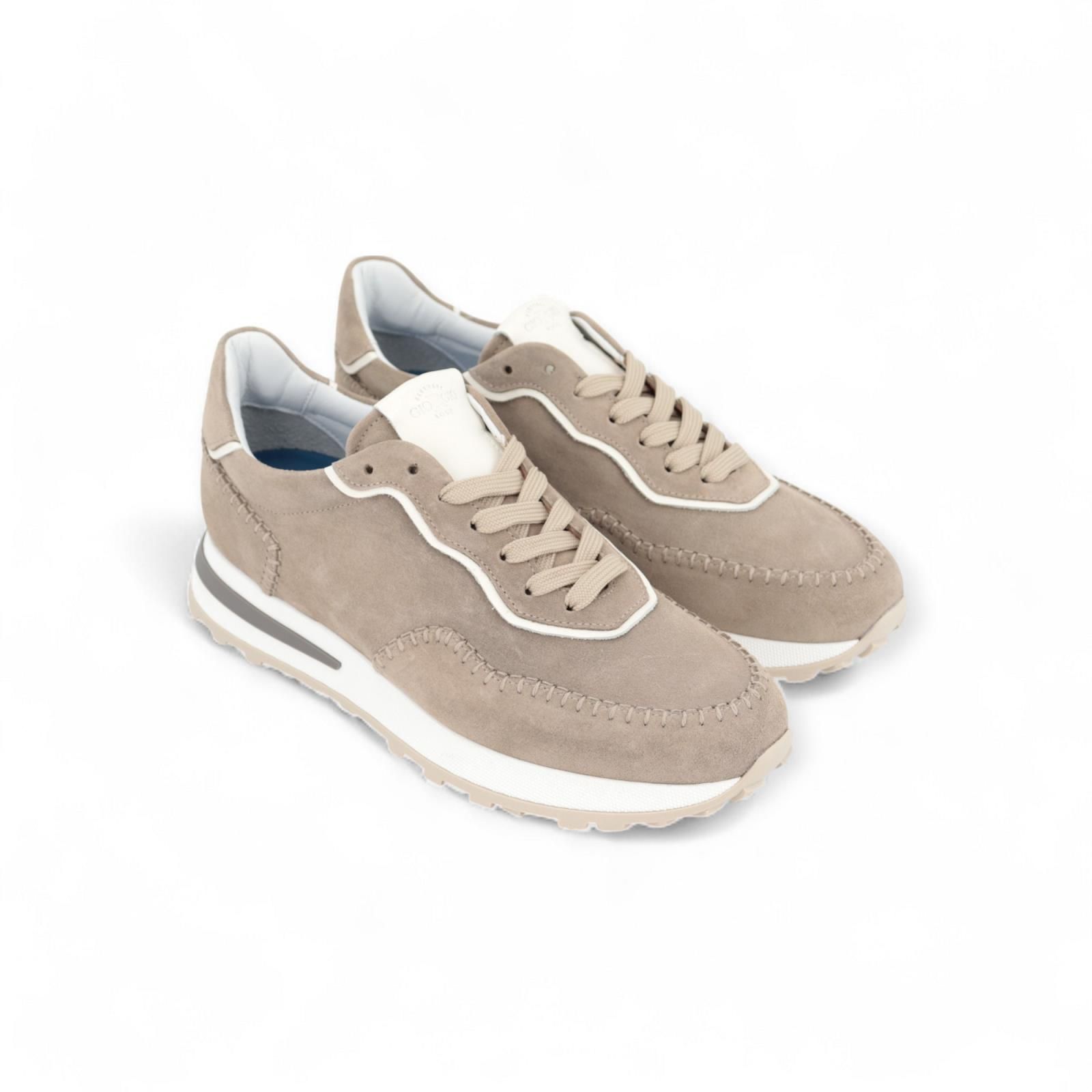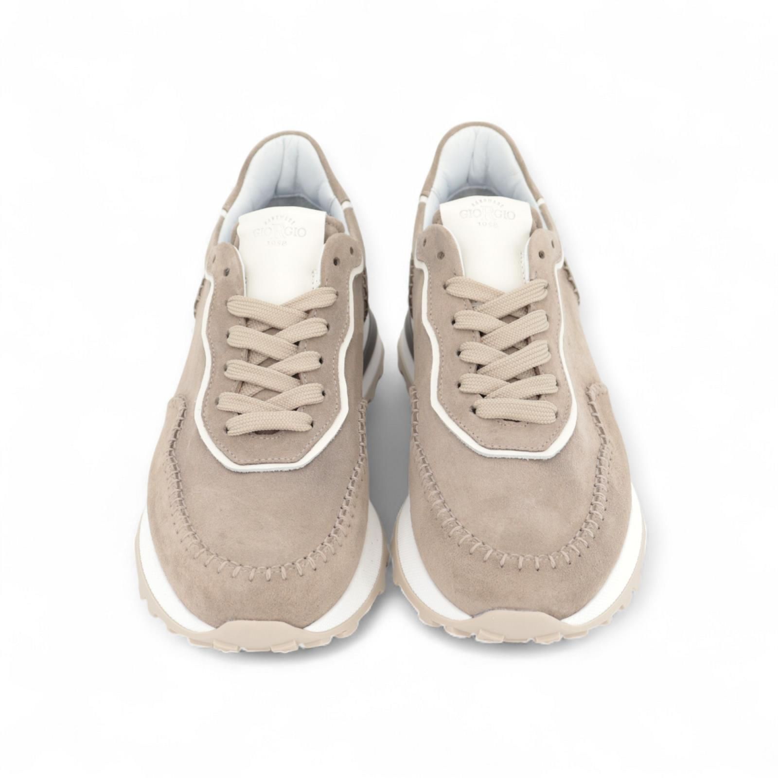 Giorgio sneaker voor heren: Dit runnermodel in beige, zandkleur is volledig in leder vervaardigt. Afgewerkt met stiksels op de schoen en witte details. De binnenzool van dit model is uitneembaar.