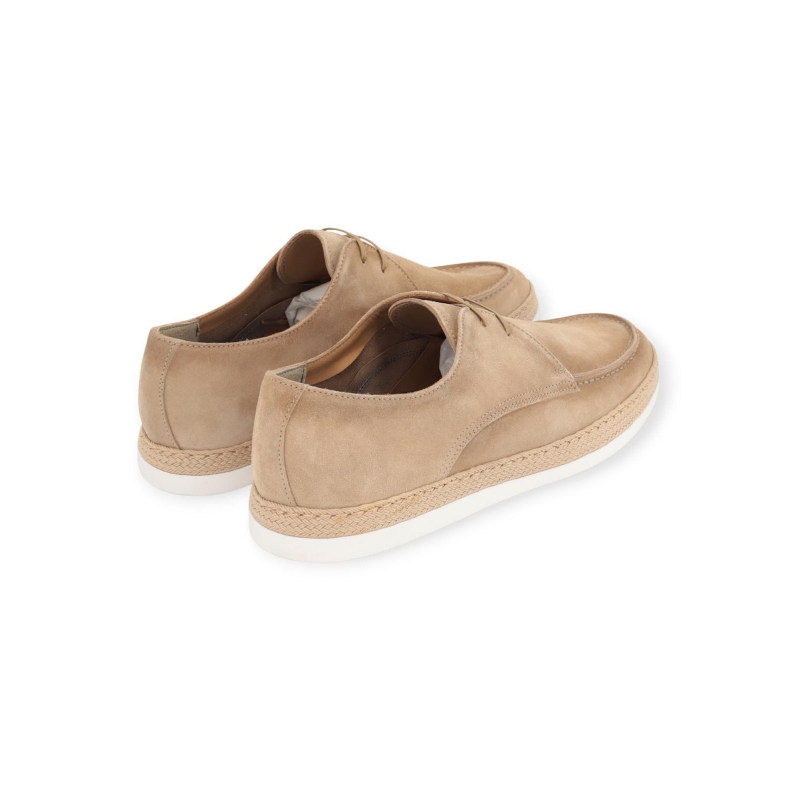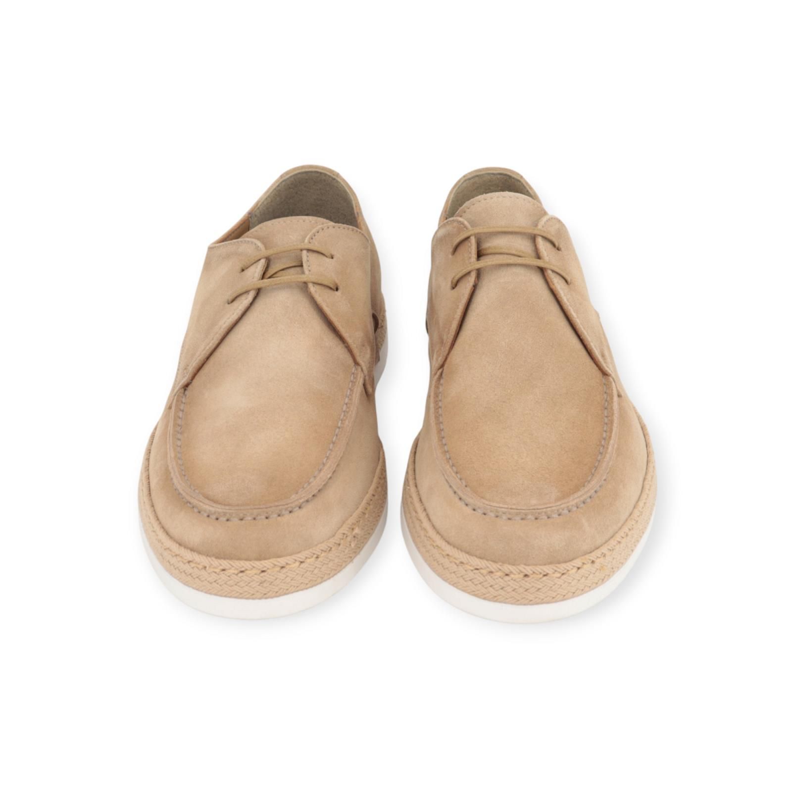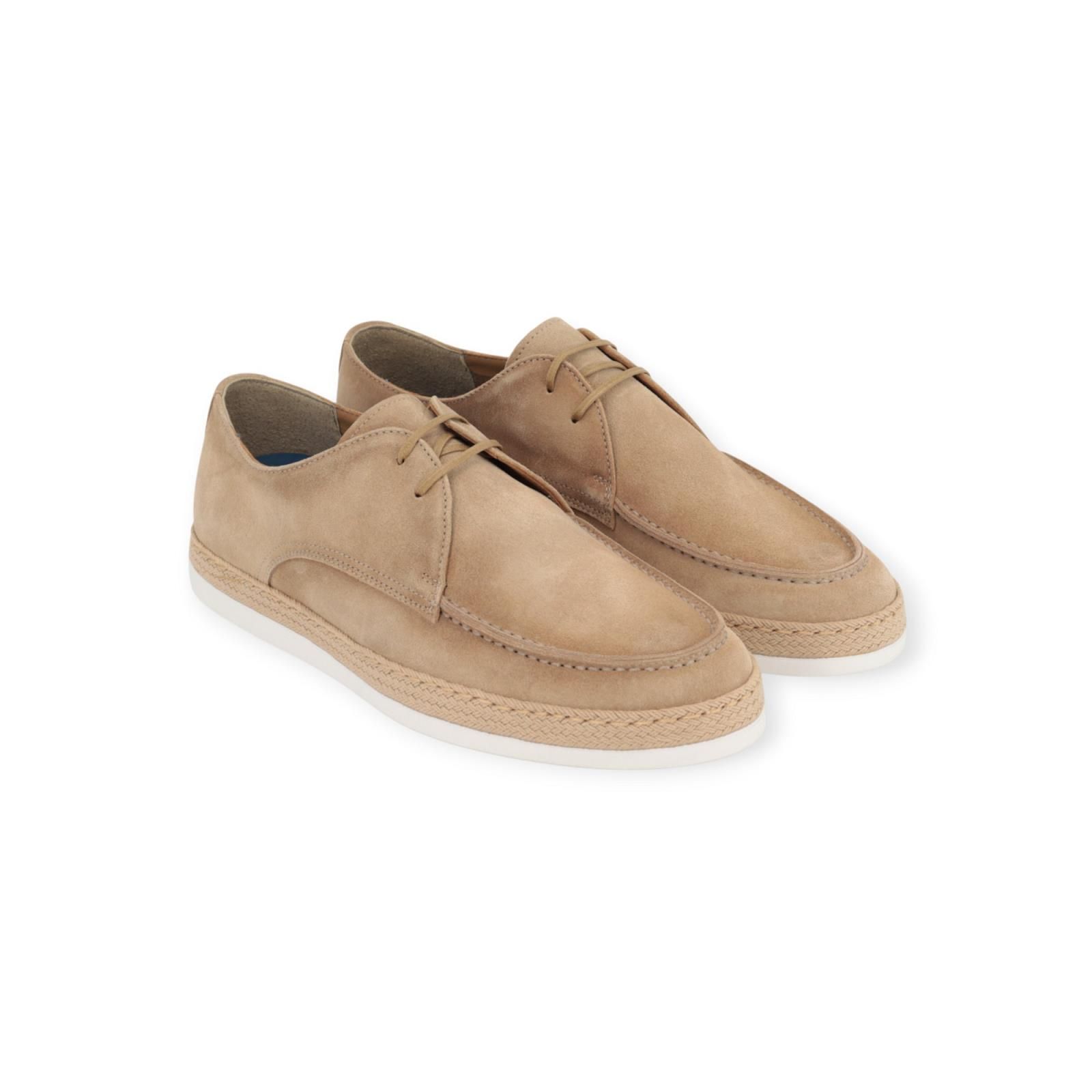 Veterschoen van Giorgio voor heren. Deze veterschoen is in beige suède met vetersluiting en een dikke stekking op de neus. Is mooi afgewerkt met een ‘espadrille look’, een touwzool band boven de witte zool, die het model iets meer casual maakt. De binnenzool is uitneembaar. Combineer deze schoen met bijpassende riem.