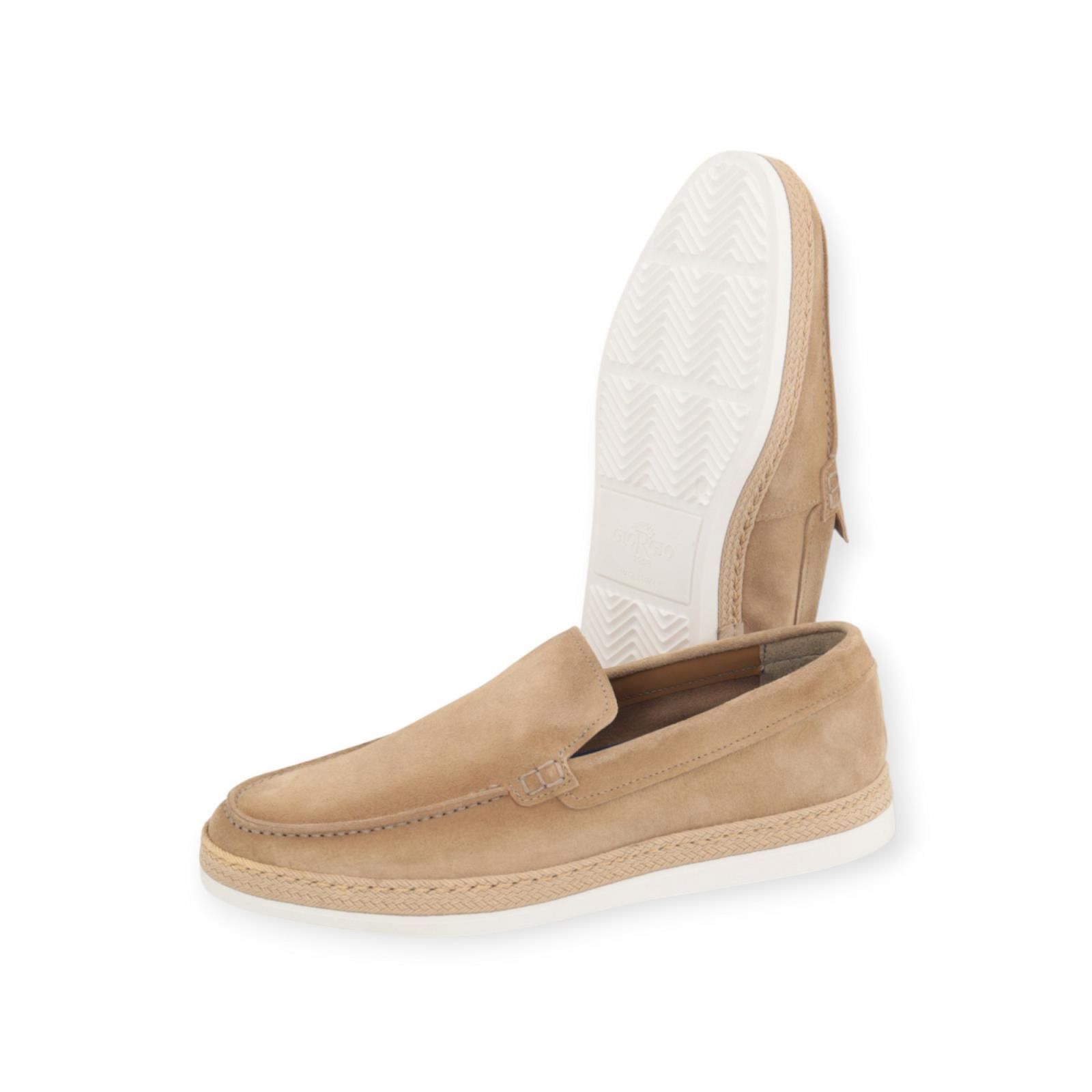 Mocassin van Giorgio voor heren. Deze comfortabele mocassin is in beige suède. Afgewerkt met een ‘espadrille look’ touwzool boven de rubberenzool. Geeft de schoen een nog zomerse uitstraling. De binnenzool is uitneembaar. Maak je aankoop compleet met de bijhorende riem.