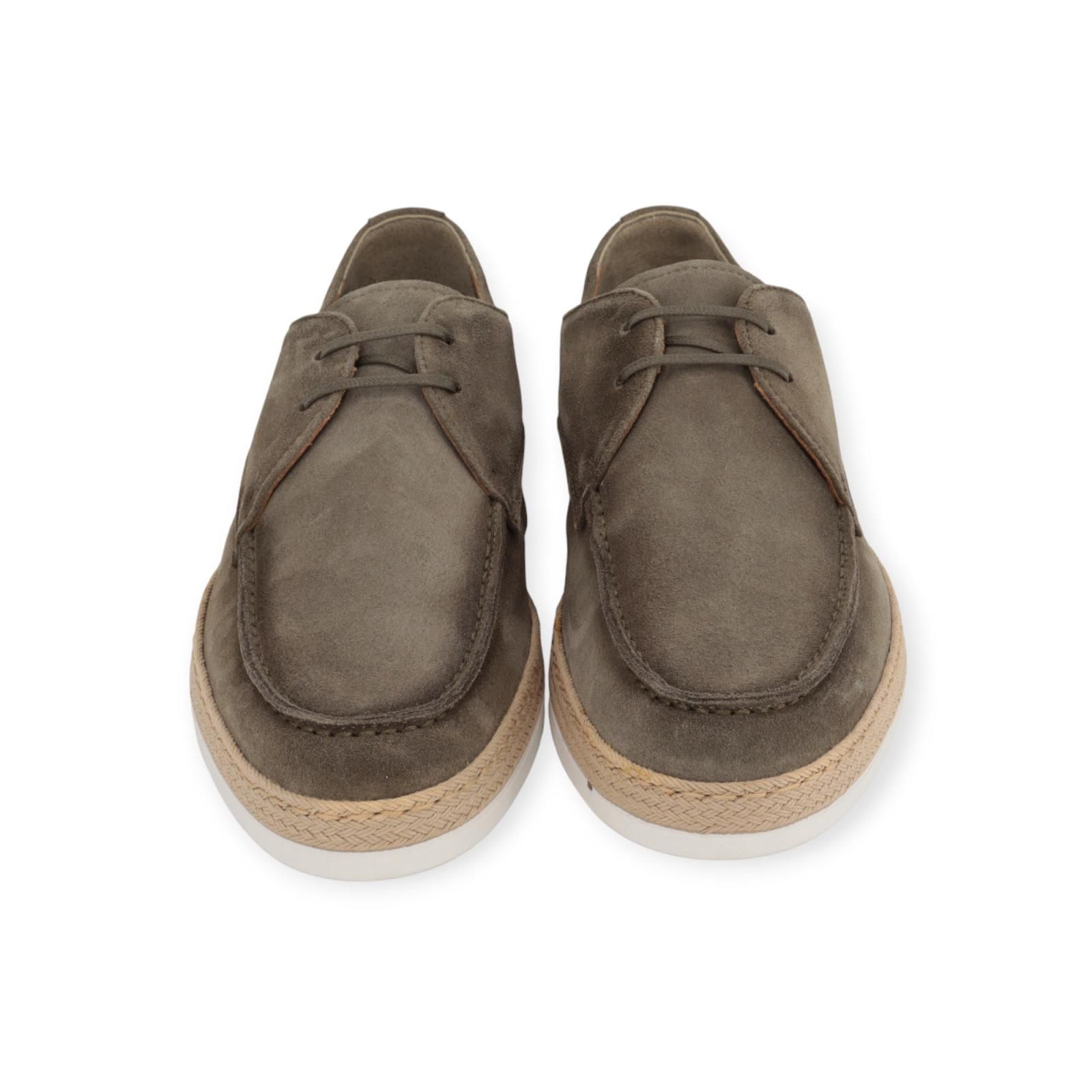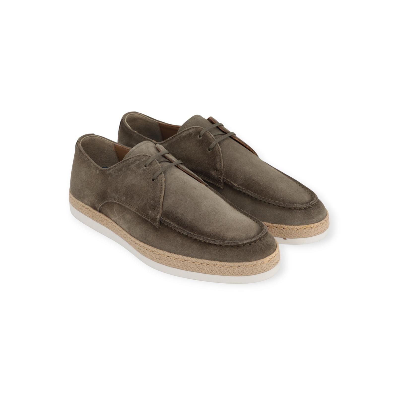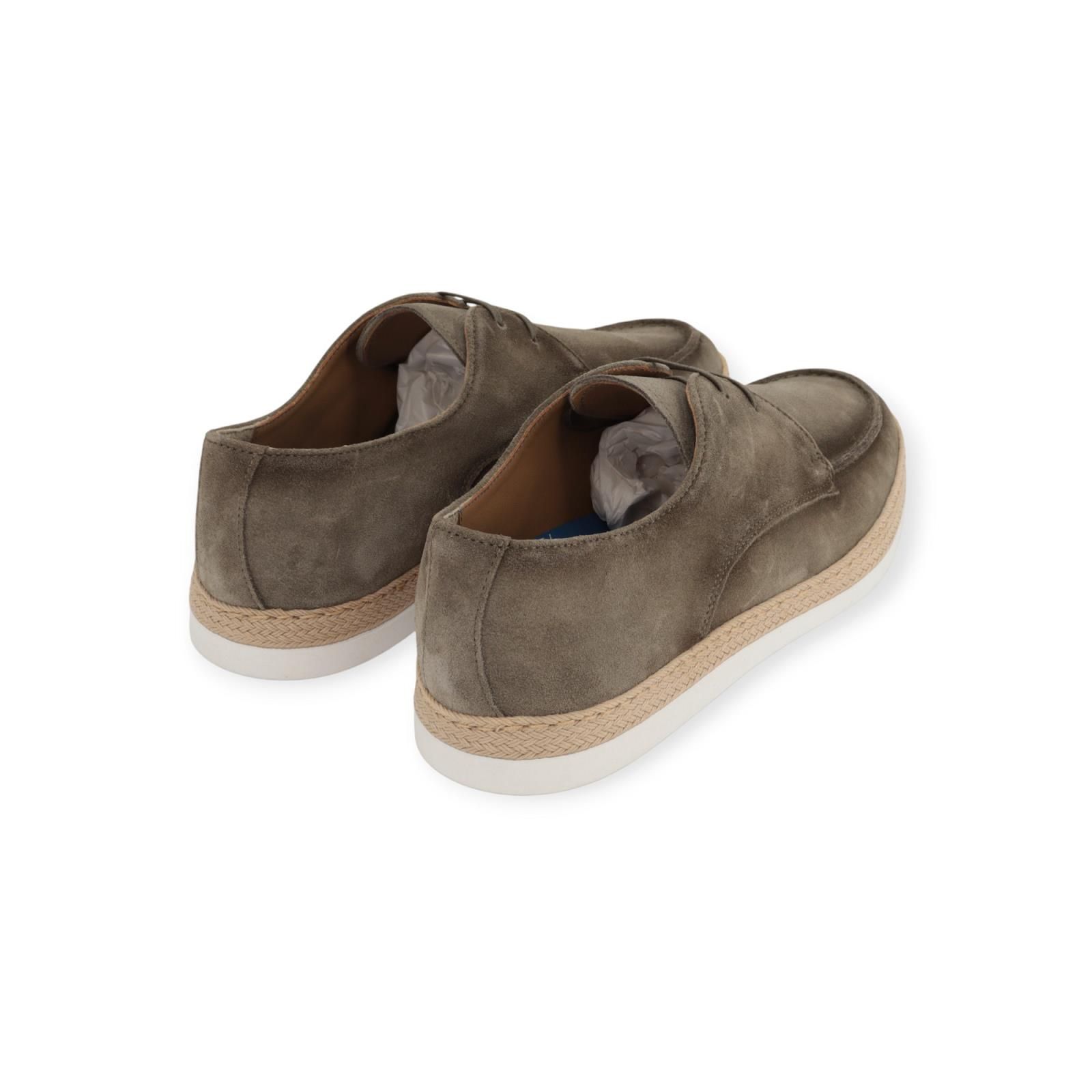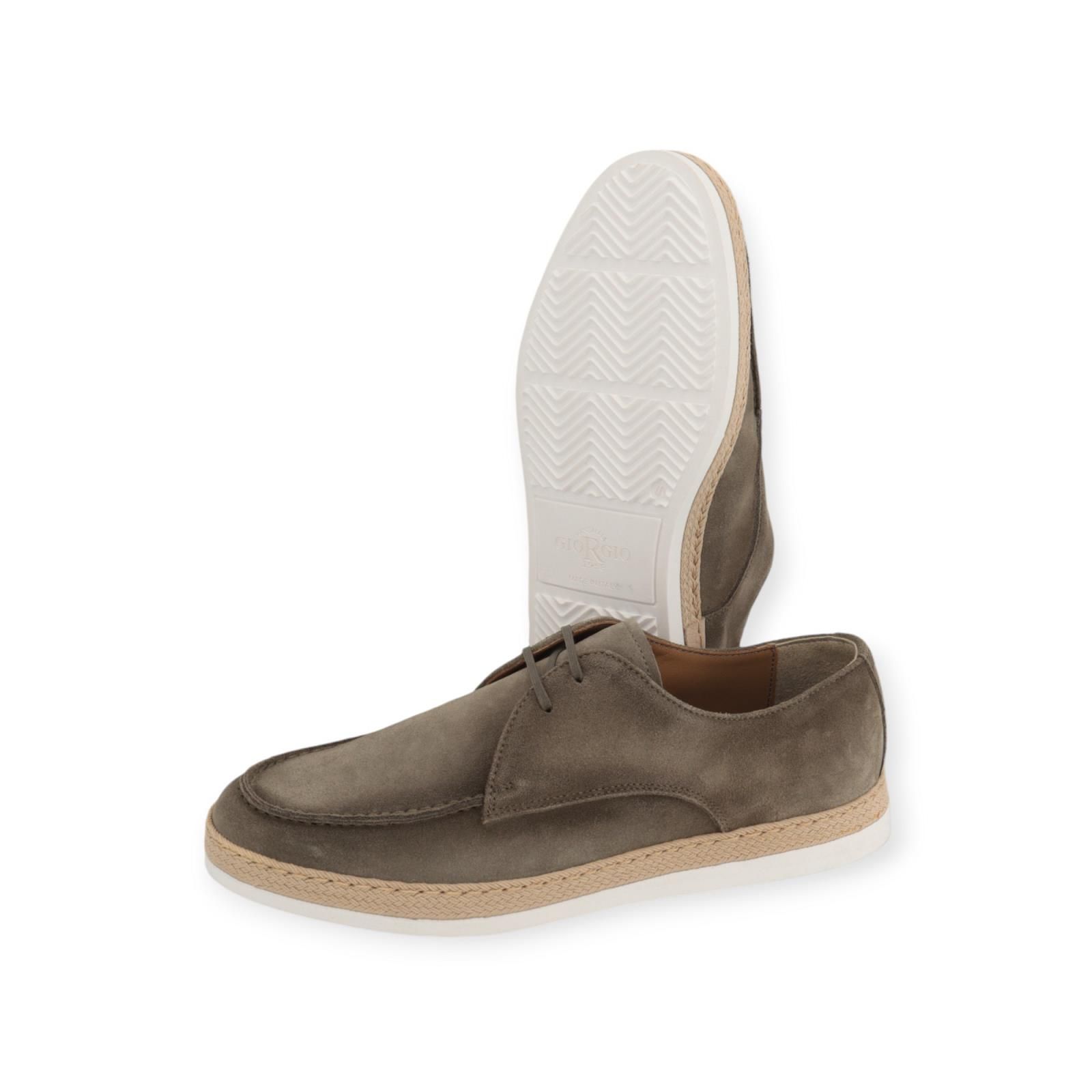 Veterschoen van Giorgio voor heren. Deze veterschoen is in kaki suède met vetersluiting en een dikke stekking op de neus. Is mooi afgewerkt met een ‘espadrille look’, een touwzool band boven de witte zool, die het model iets meer casual maakt. De binnenzool is uitneembaar. Combineer deze schoen met bijpassende riem.