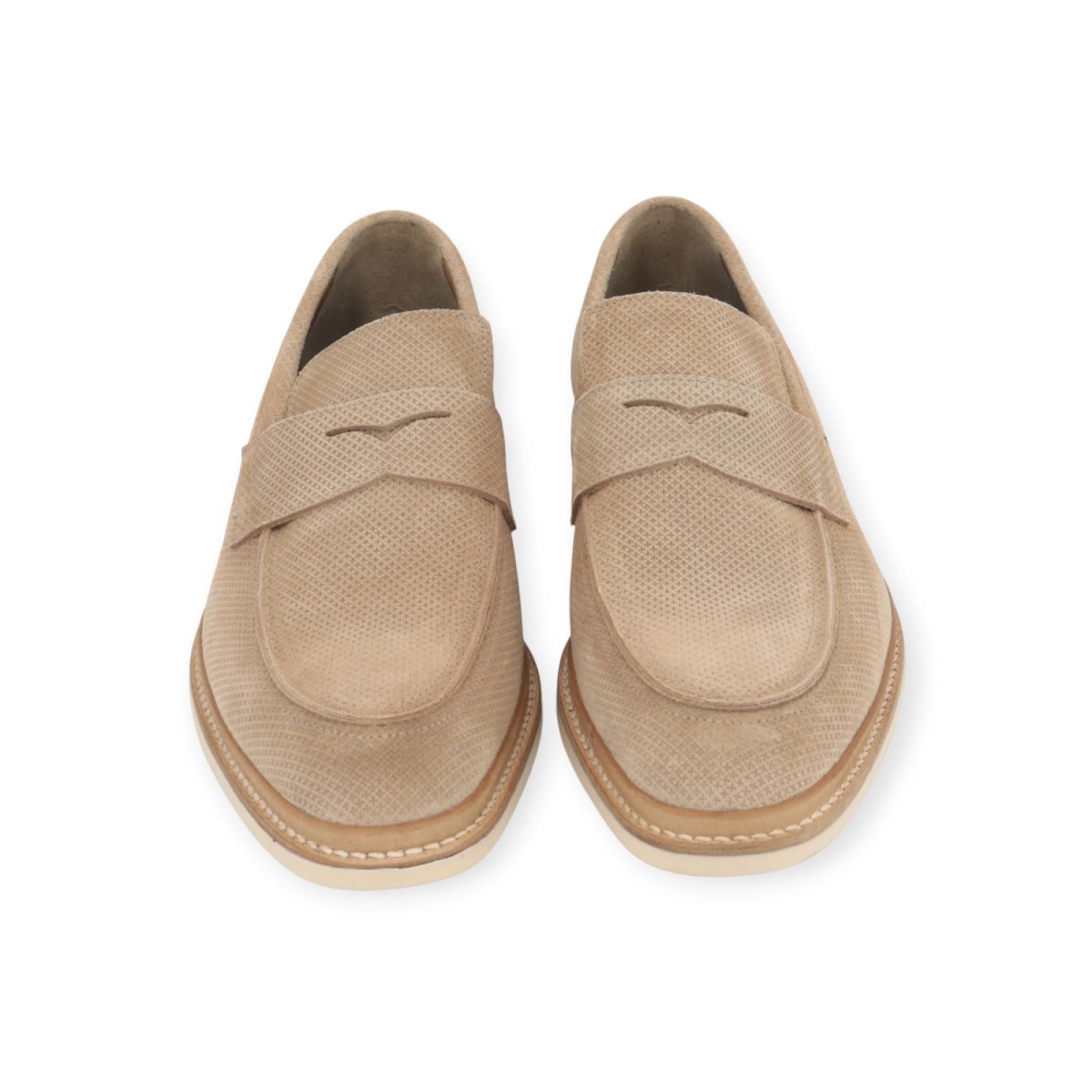Mocassin van Giorgio voor heren. Deze elegante mocassin in zand geprint suède met een band over de wreef. Is op een aangename witte antislipzool omrand met beige leer en een uitneembare binnenzool. Maak je aankoop compleet met bijpassende riem.