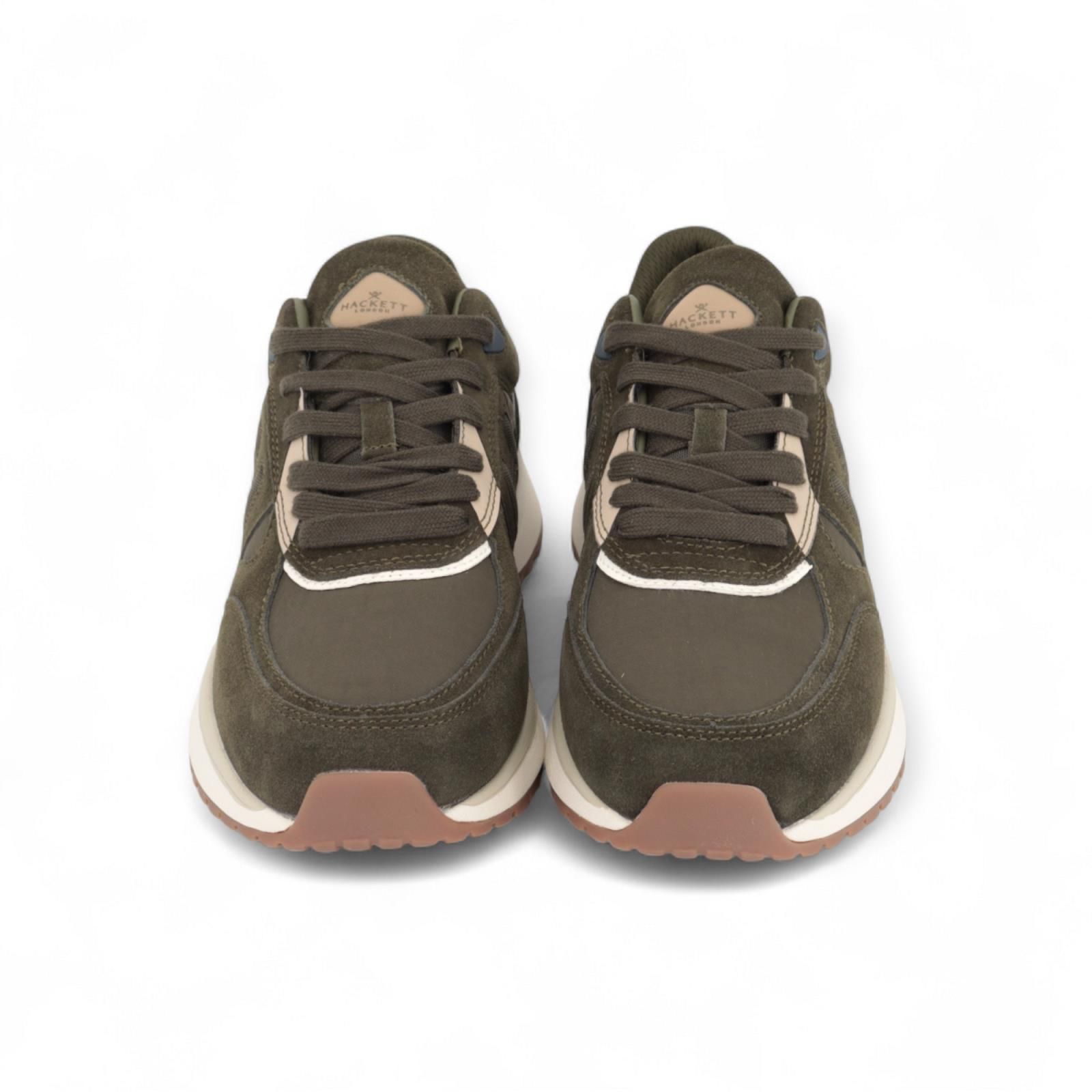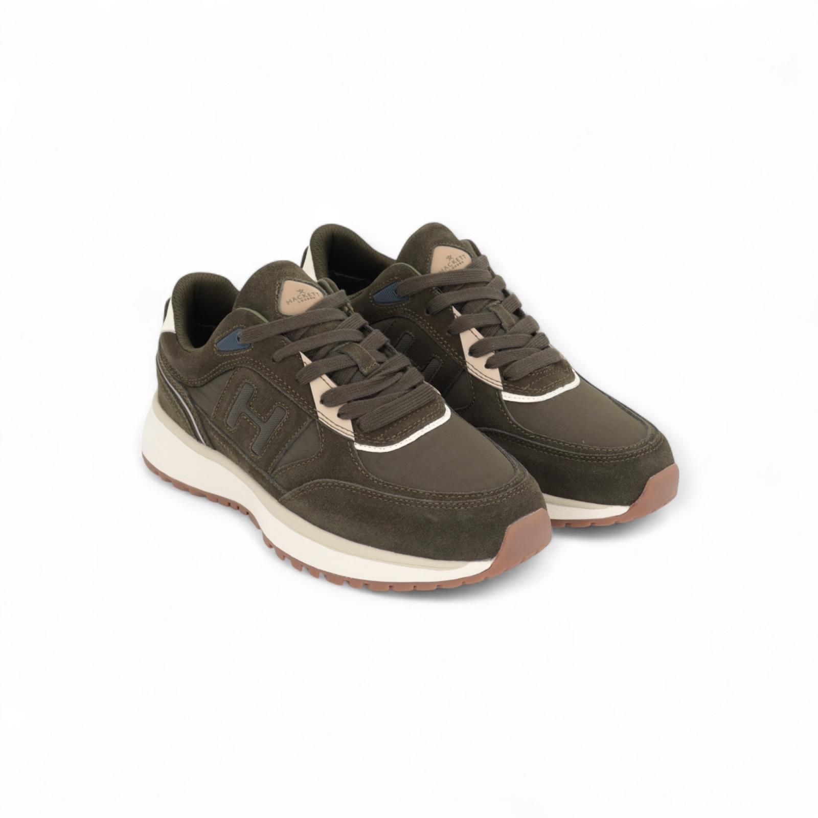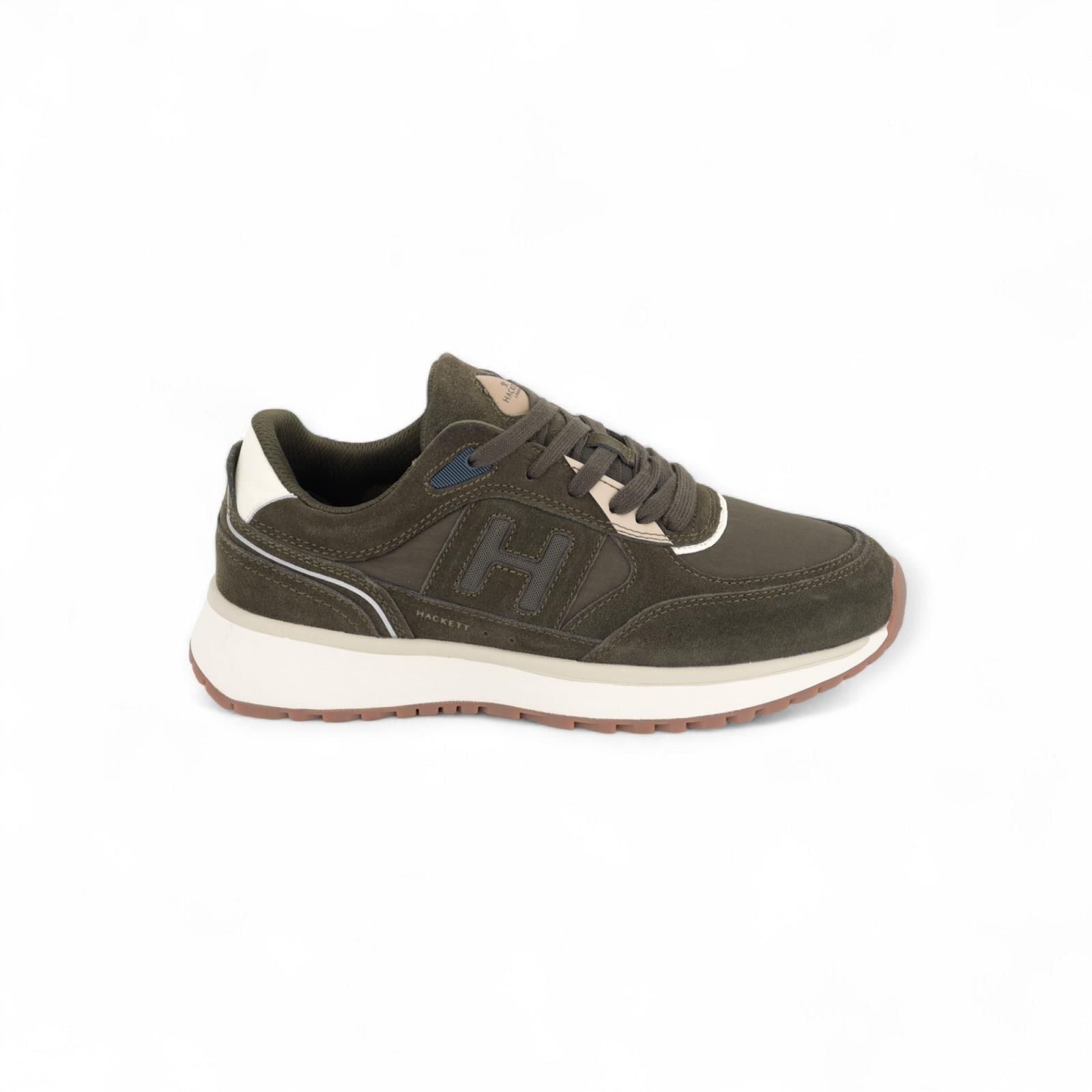 Sneaker Otto Run van Hackett voor heren. Dit runner model is kaki groen met off wit details. Is een rijke mix van suède, leer en nylon samen. Is mooi afgewerkt met het H logo aan de zijkant en op de flap. Is op een wit met grijze zool en heeft een uitneembare binnenzool.