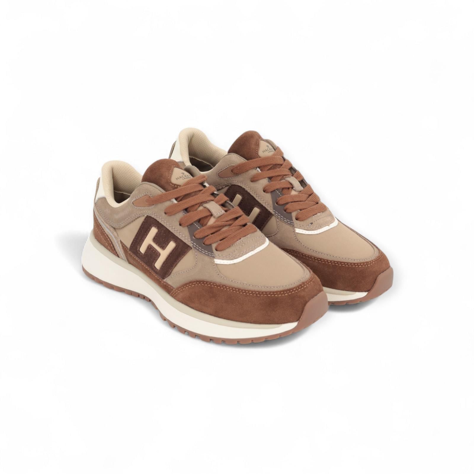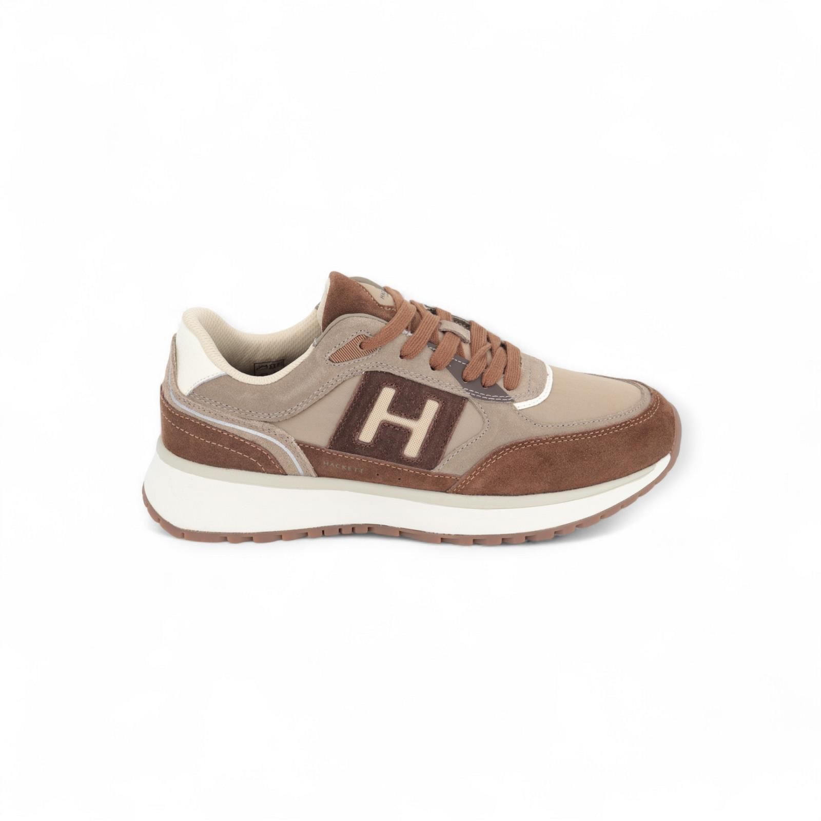 Sneaker Otto Run van Hackett voor heren. Dit runner model is in zand kleur met beige en cognac tinten. Is een rijke mix van suède, leer en nylon samen. Is mooi afgewerkt met het H logo aan de zijkant en op de flap. Is op een wit met grijze zool en heeft een uitneembare binnenzool.