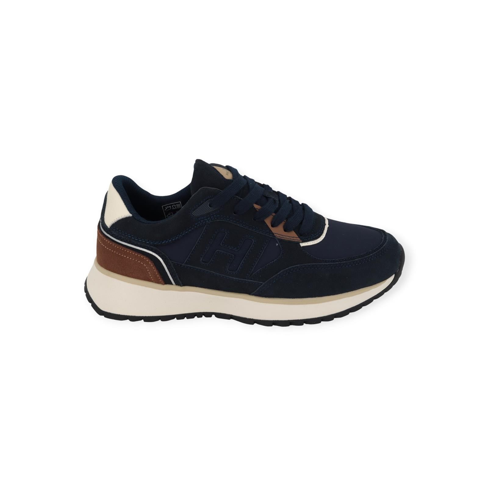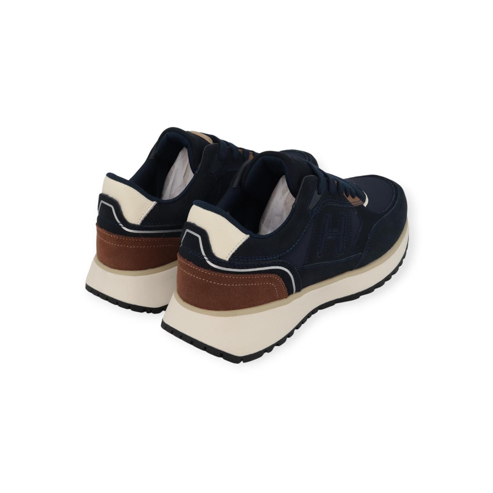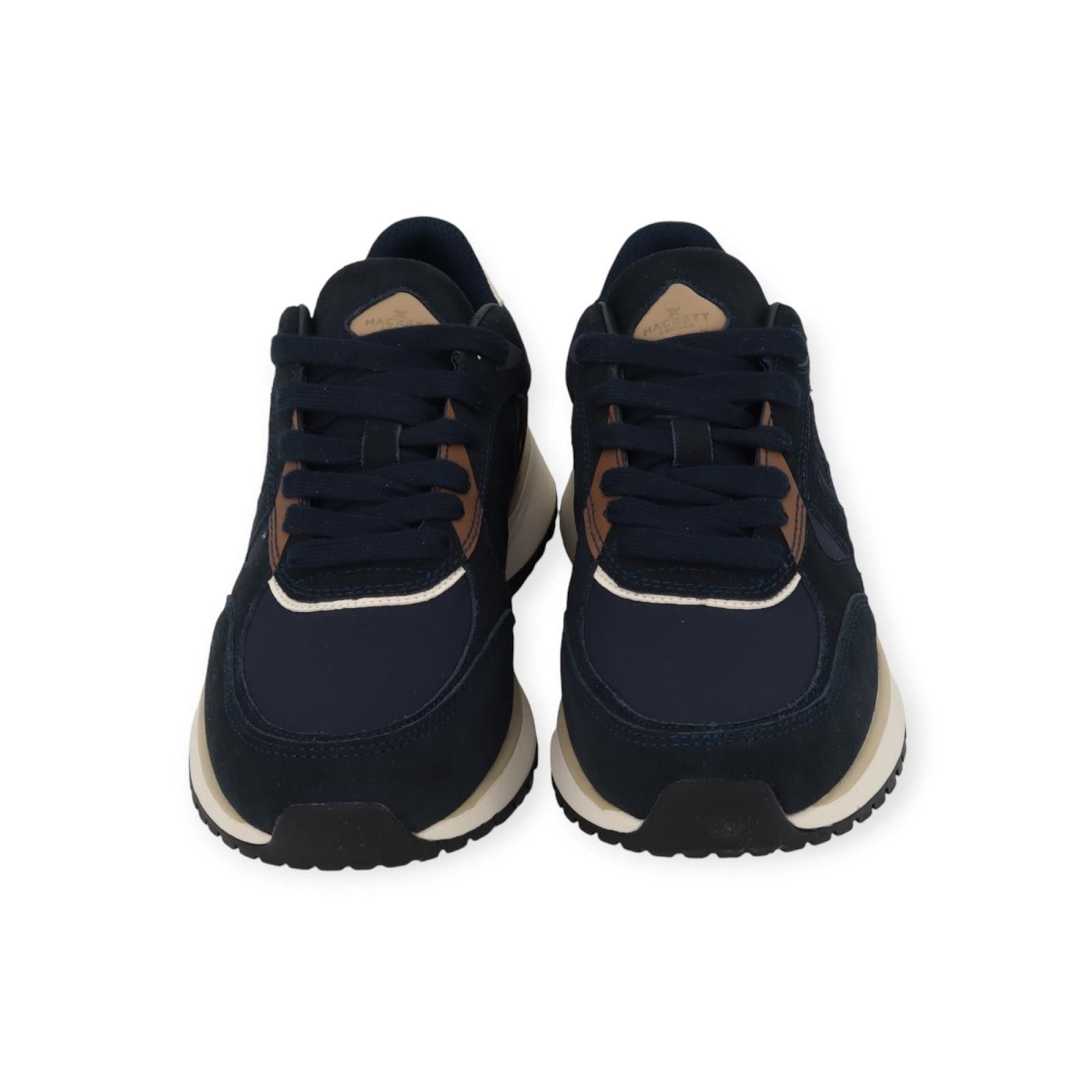 Sneaker Otto Run van Hackett voor heren. Dit runner model is in blauw met cognac in een rijke mix van suède, leer en nylon samen. Is mooi afgewerkt met het H logo aan de zijkant en op de flap. Is op een wit met grijze zool en heeft een uitneembare binnenzool.