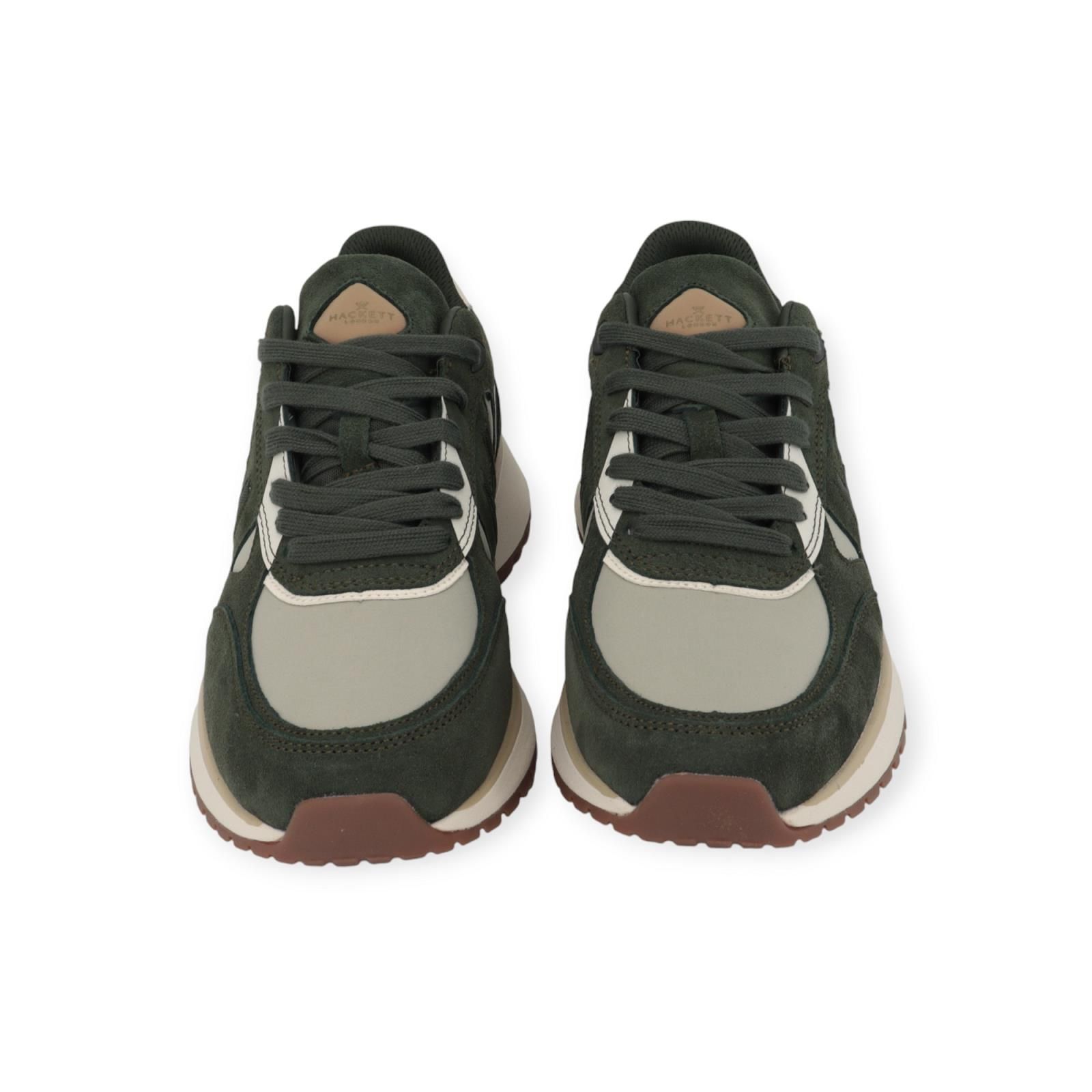 Sneaker Otto Run van Hackett voor heren. Dit runner model is in groen met lichtgroen in een rijke mix van suède, leer en nylon samen. Is mooi afgewerkt met het H logo aan de zijkant en op de flap. Is op een wit met beige zool en heeft een uitneembare binnenzool.