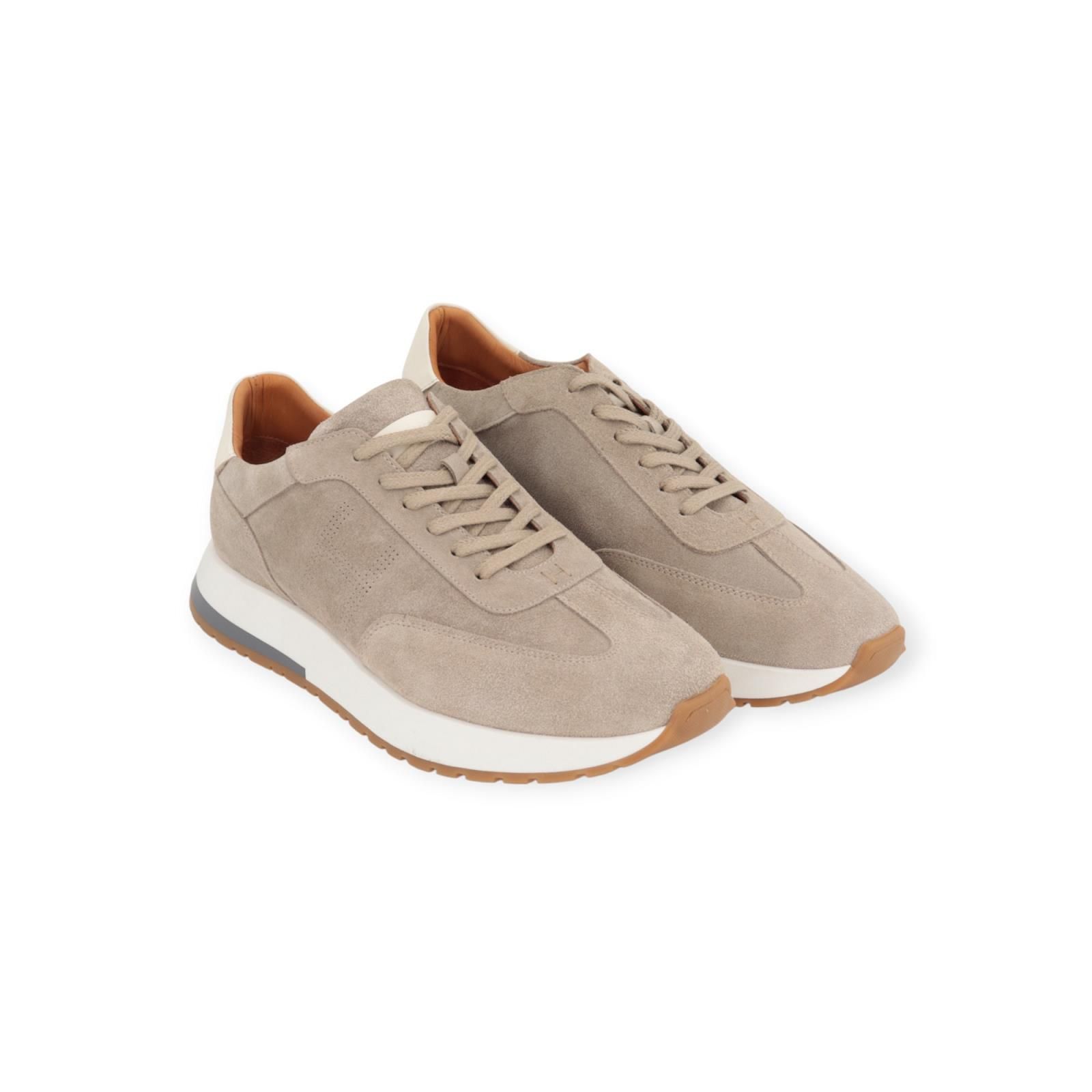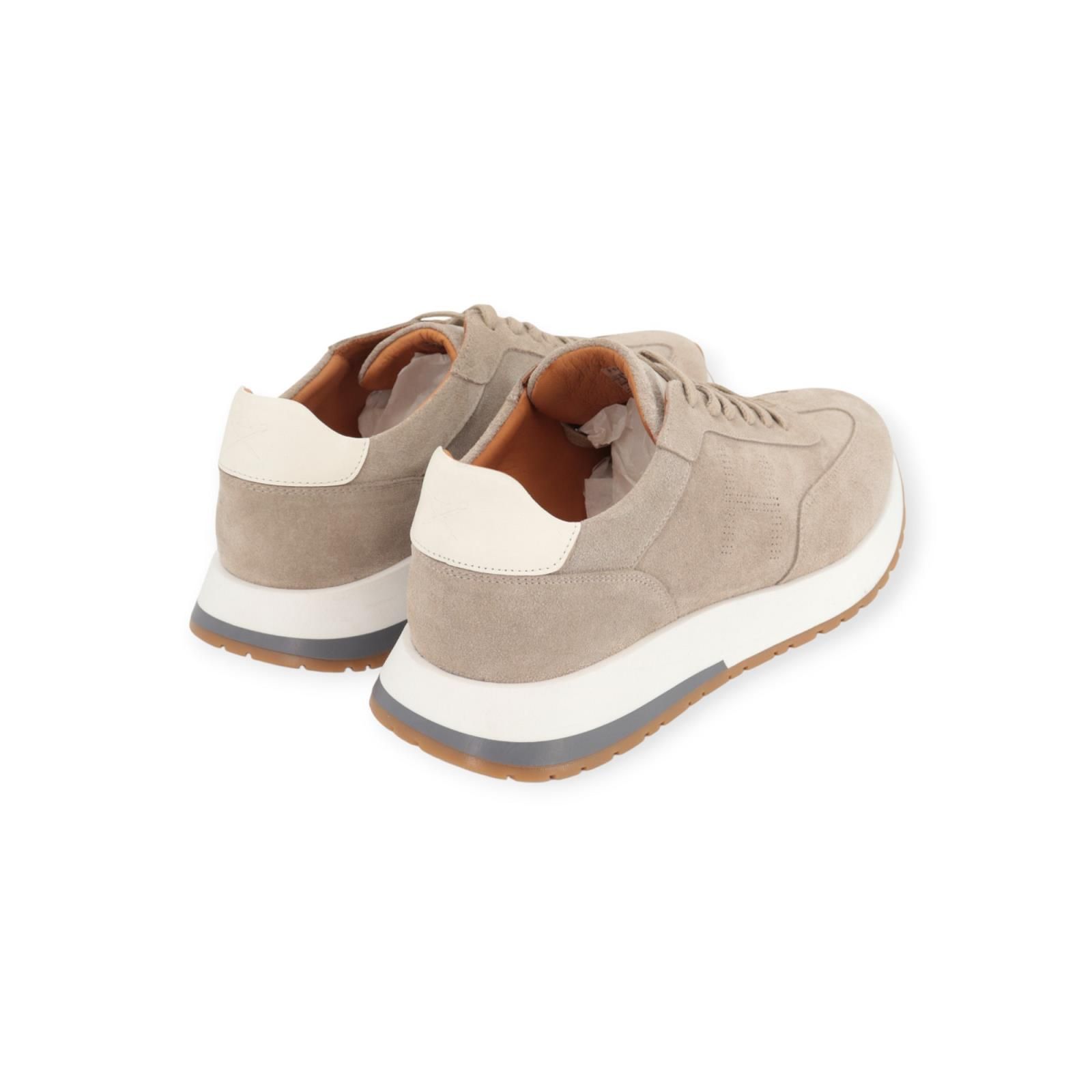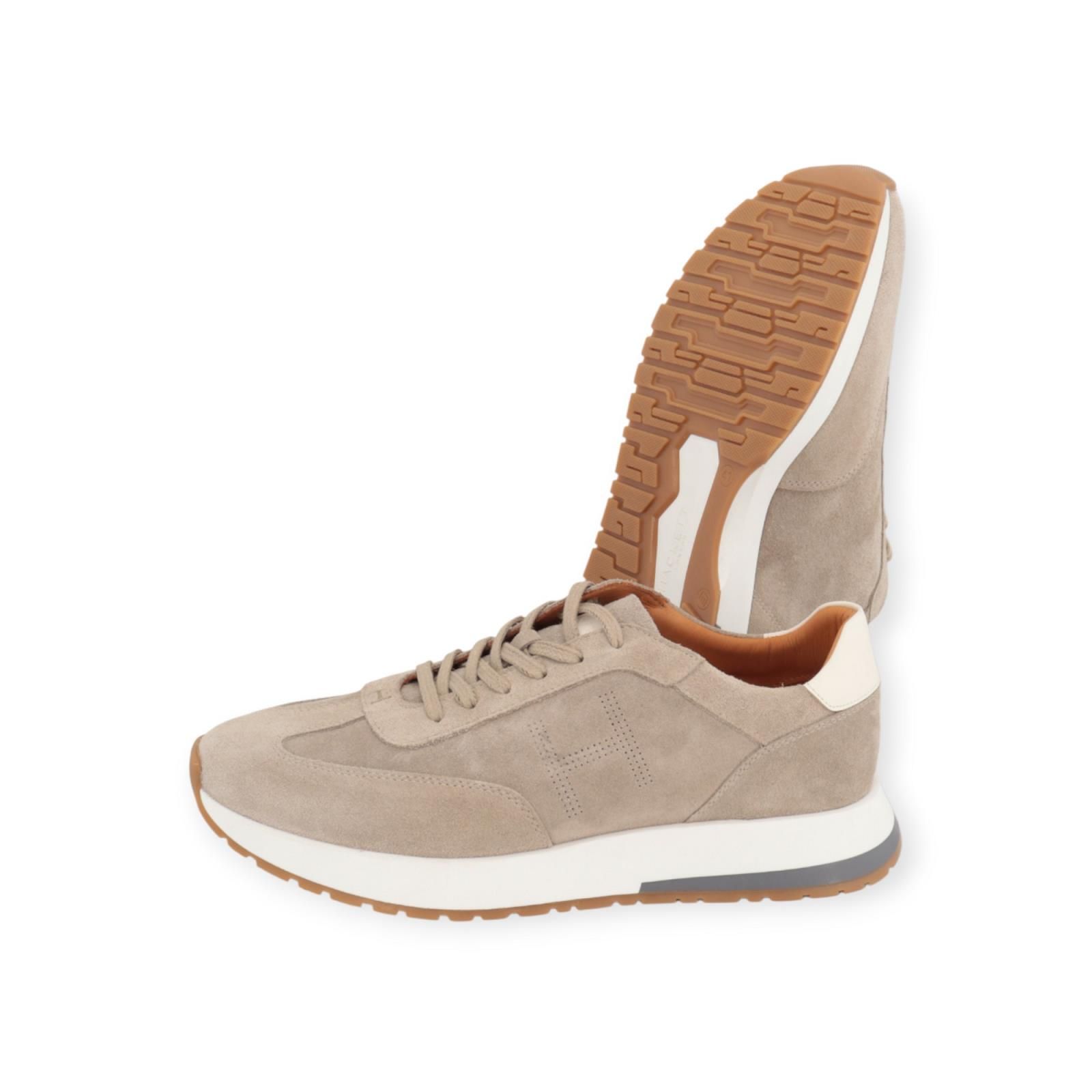 Sneaker Rapid Chad van Hackett voor heren. Deze elegante sneaker is in beige suède met off wit hielflap. Heeft aan de zijkant een licht geperforeerde H label. Is volledig in leer met een rubberen licht verhoogde zool.