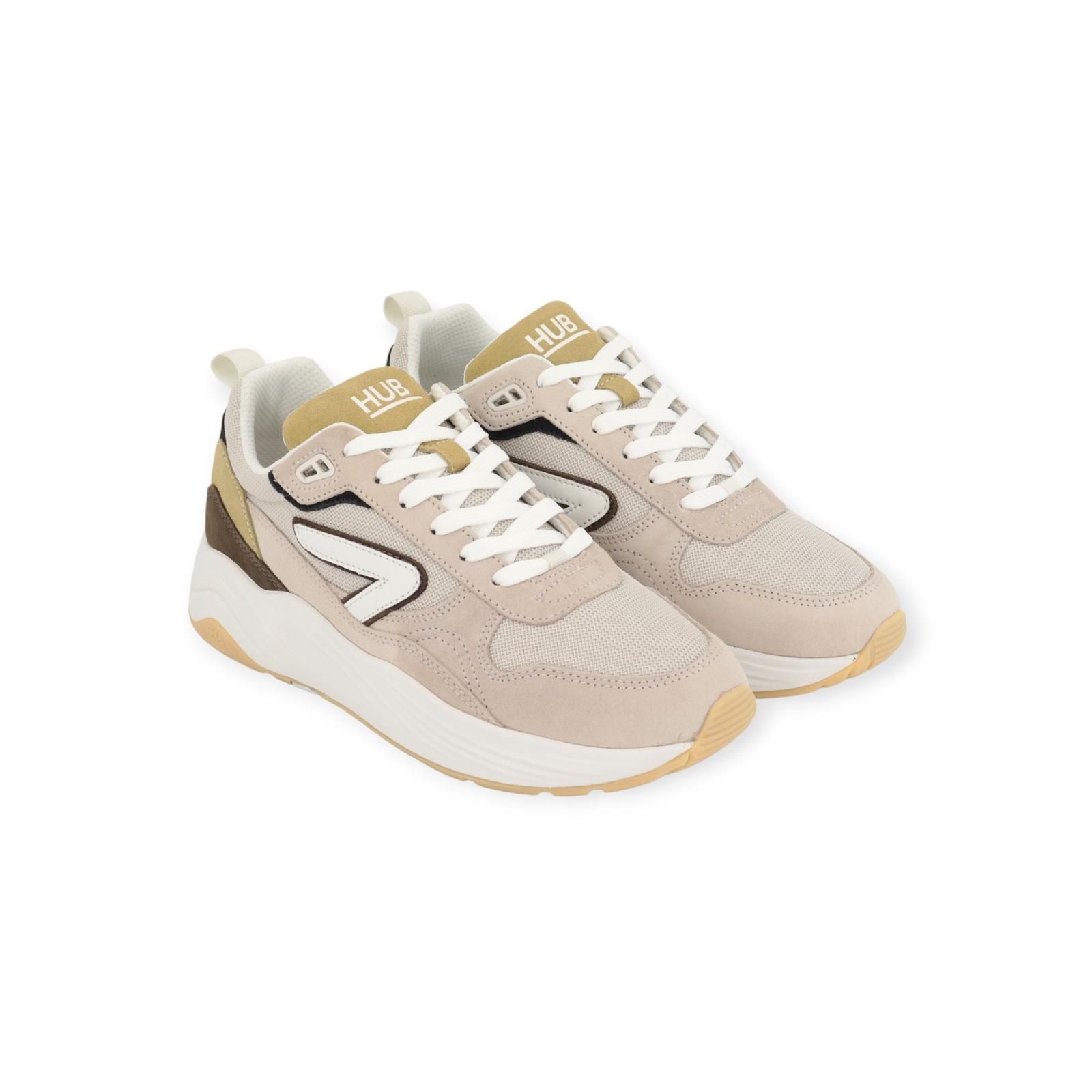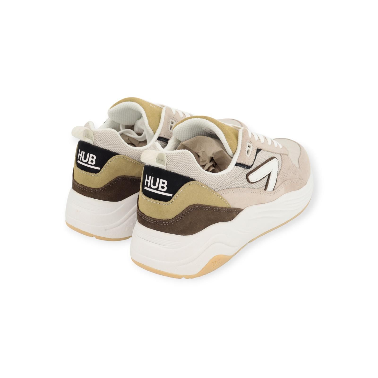 Sneaker Glide S43 van Hub voor heren. Deze runner is in zand suède met mesh. Afgewerkt met mooie stiksels en suède inzetstukkken in kaki, olijf groene . Is op een aangename chunky plateauzool die voor een uitstekende grip en stabiliteit zorgt. Heeft een uitneembare binnenzool die een zachte demping heeft.
