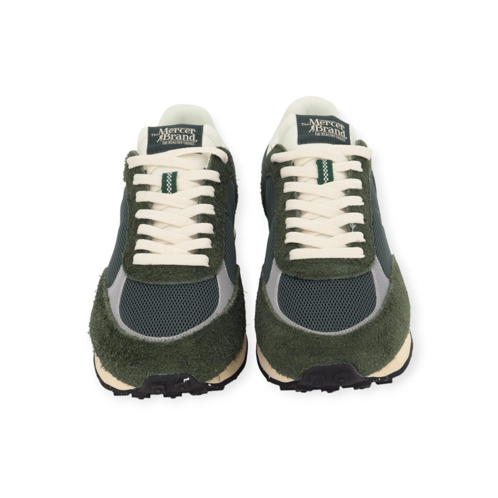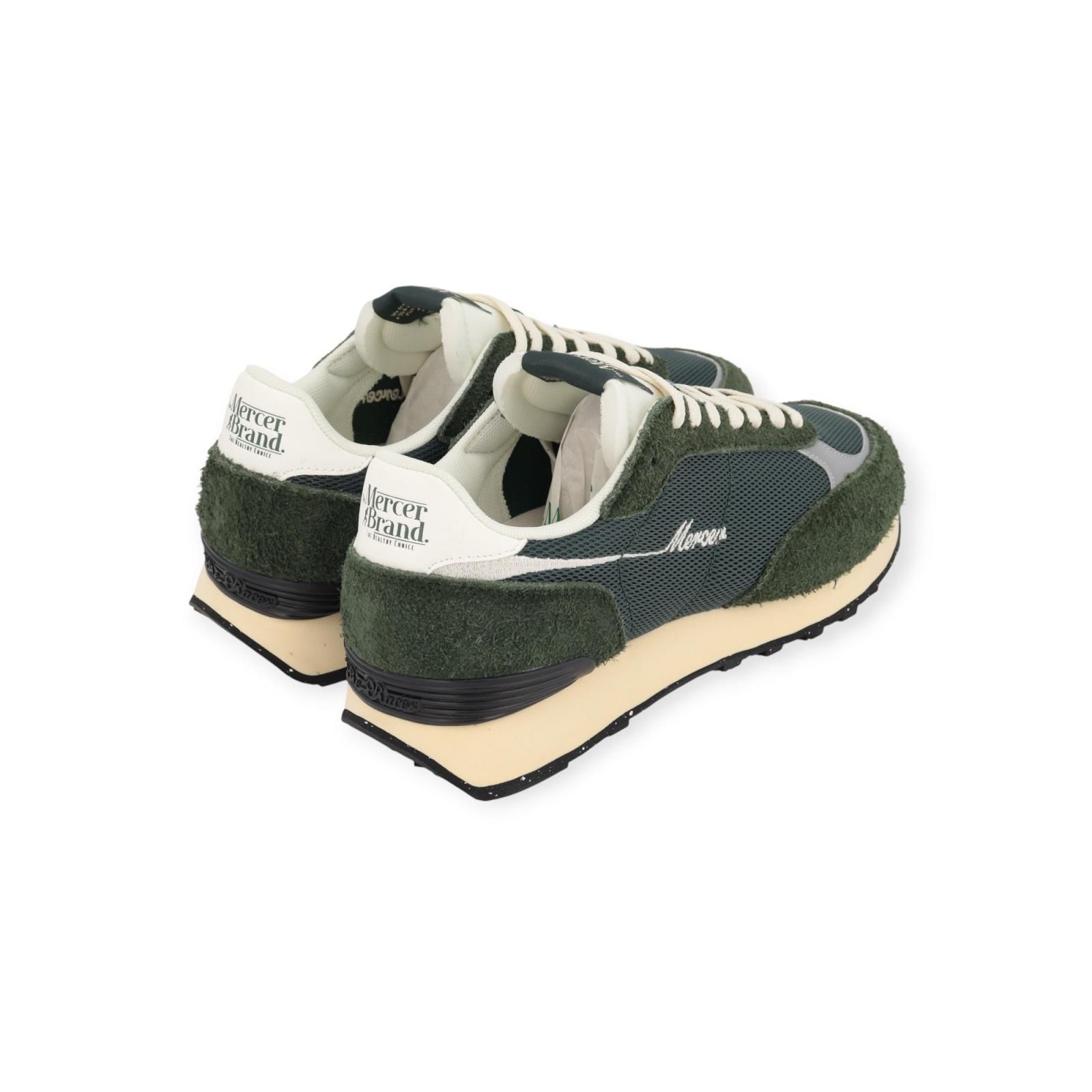 Sneaker The Re-Racer van Mercer voor heren. Deze Re-Racer is in groene mesh met witte hielflap en reflecterende stukken. Heeft het nieuw geborduurd Mercer-logo aan de zijkant in wit suède. Zelfde comfort maar met nog fijnere afwerking. De binnenzool is uitneembaar en heeft een ‘ nieuwe ‘ lichtgewicht buitenzool voor een gedempte stap gemaakt van gerecycled rubber. Combineer deze met je favoriete Mercer outfit.