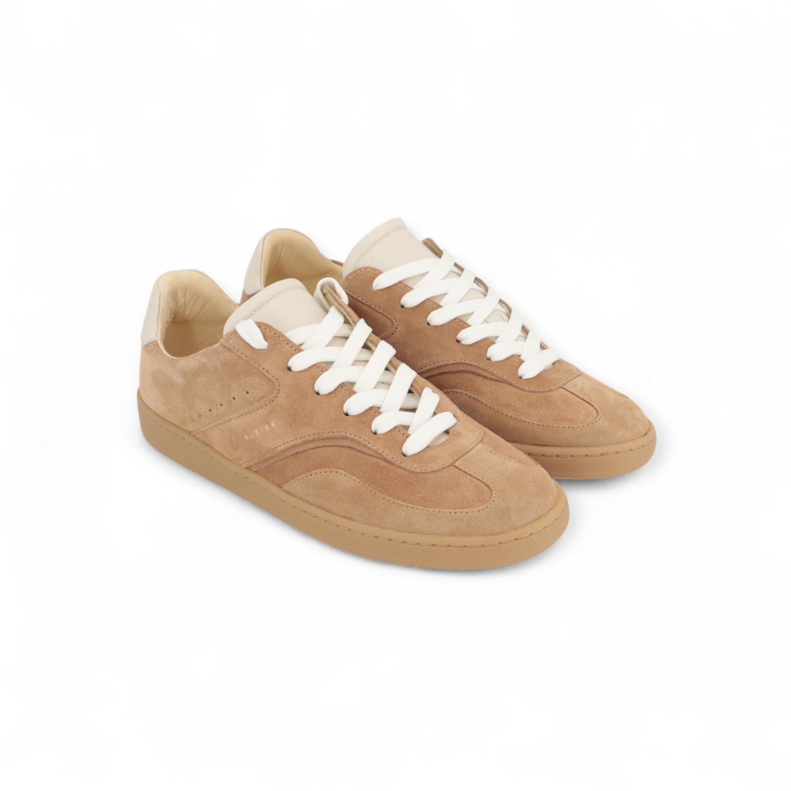 Sneaker Ray Owen van Nubikk voor heren. Deze sneaker is in zand suède met witte veters. Heeft een off wit flap en hielflap. Deze sneaker heeft ons kenmerkende wing-design en het Nubikk-logo, wat zorgt voor een tijdloze stijl en duurzaamheid. Is op een aangename bruine gummy zool en de binnenzool is uitneembaar.
