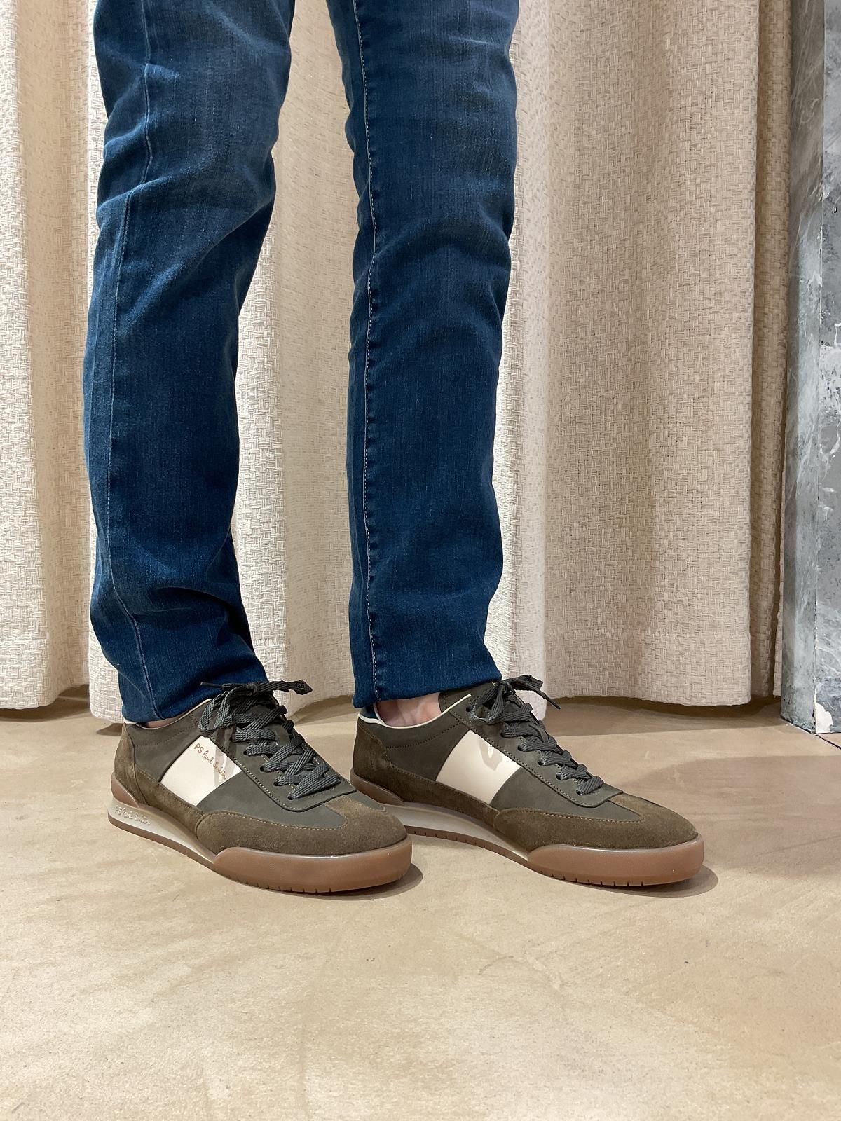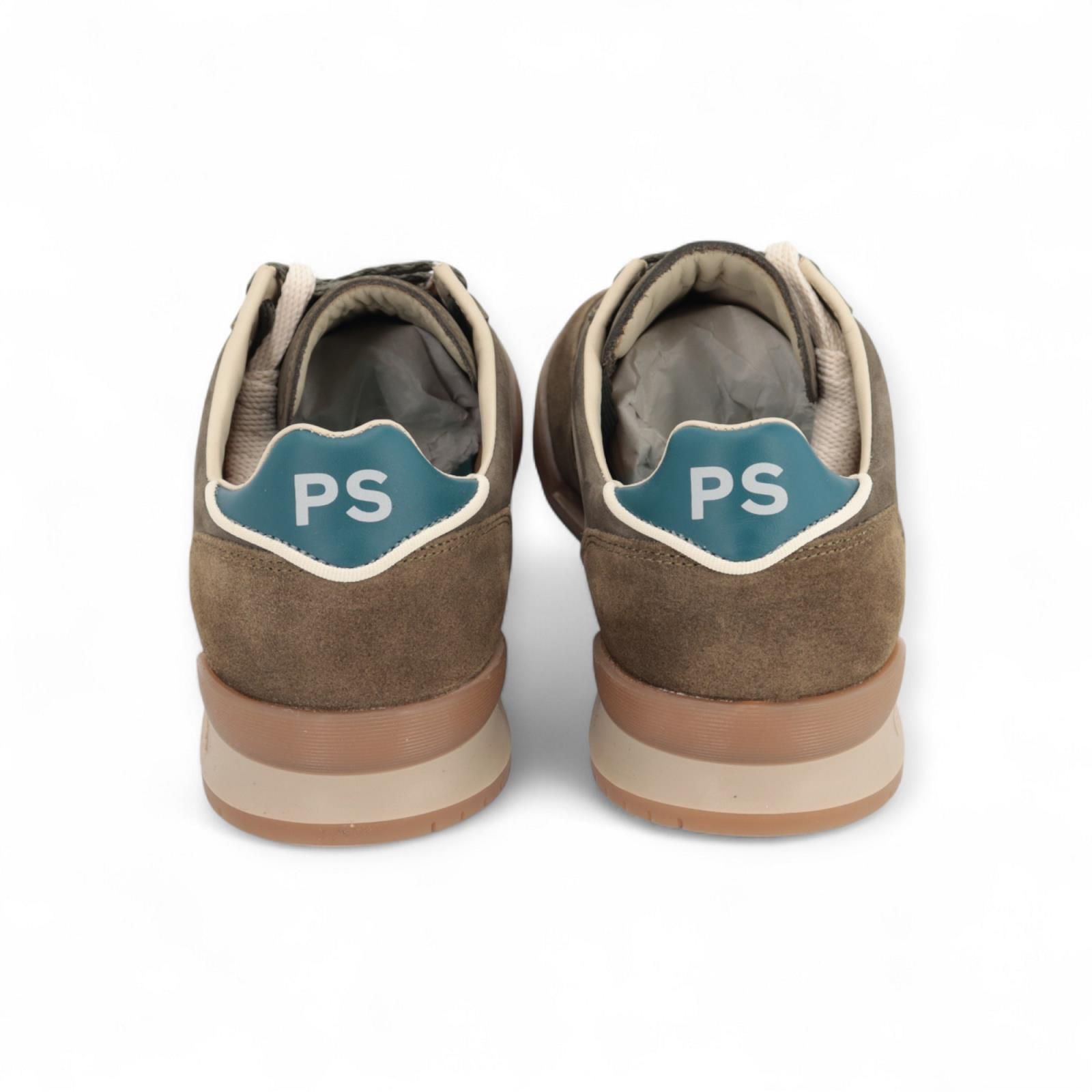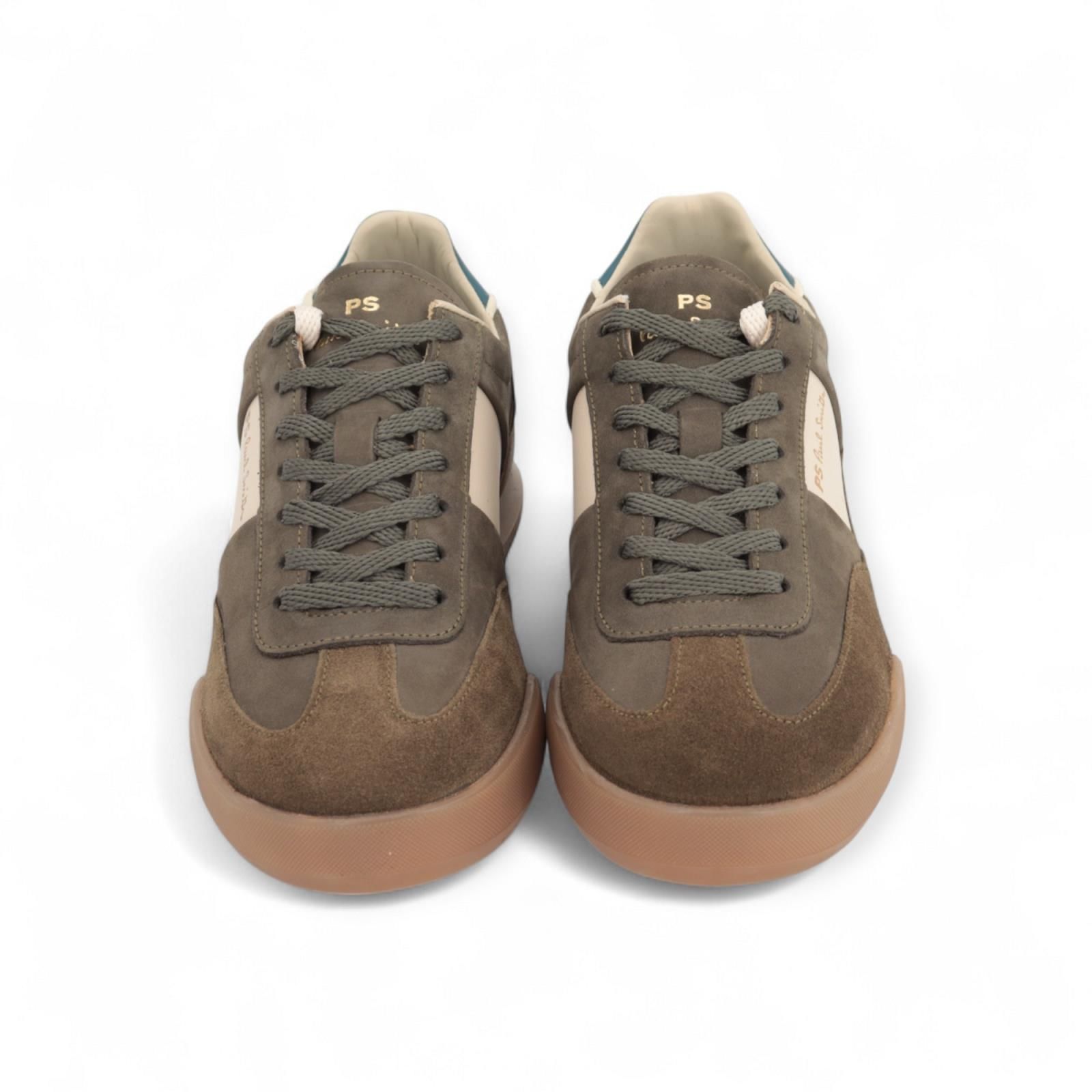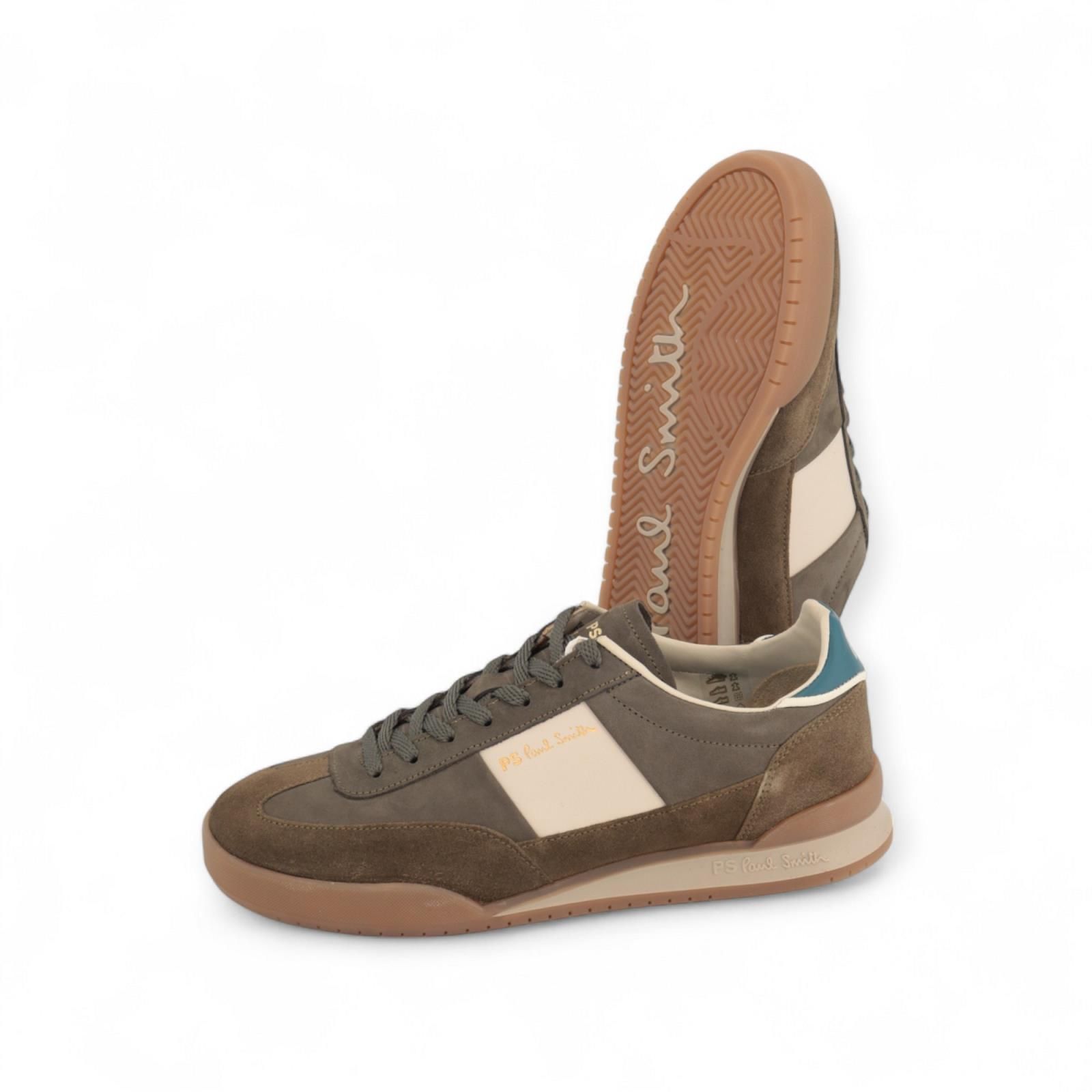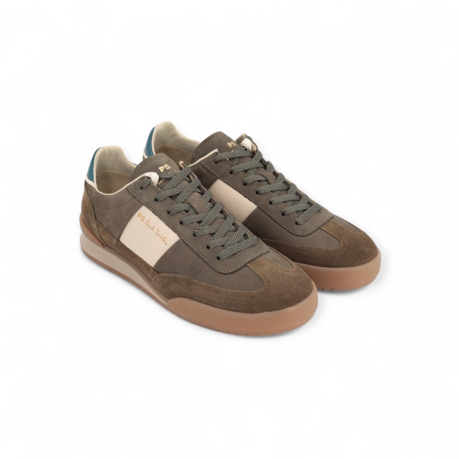 Sneaker Dover van Paul Smith voor heren. Deze sneaker is in kaki suède en nubuck. Zijn afgewerkt met off wit aan de zijkant en een petroleum groene hielflap met PS logo. De binnenkant is uit leder met een uitneembare zool. Ook op de rubberen buitenzool vind je het logo terug. Extra toegevoegd off wit veters naast de groene veters die er al inzitten.