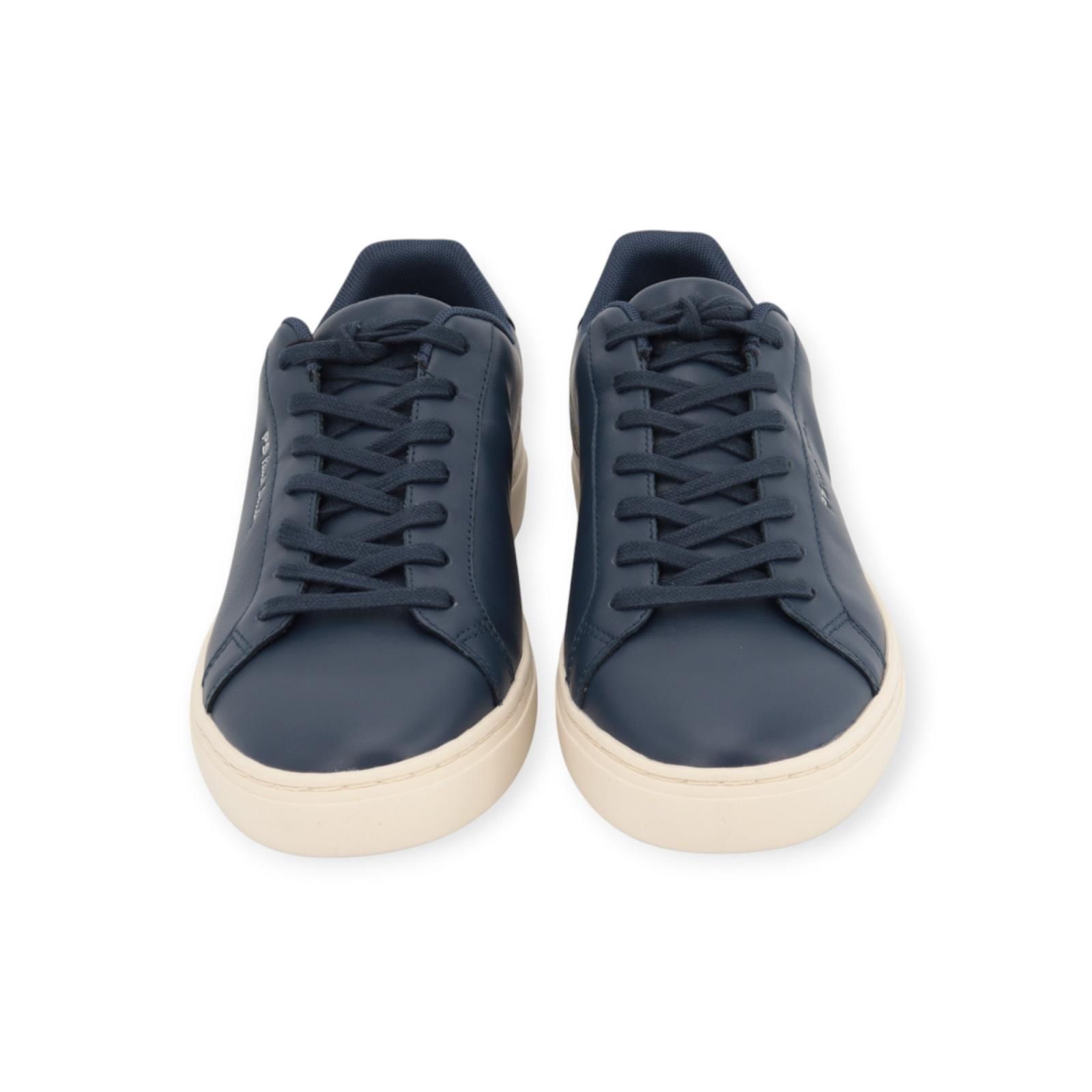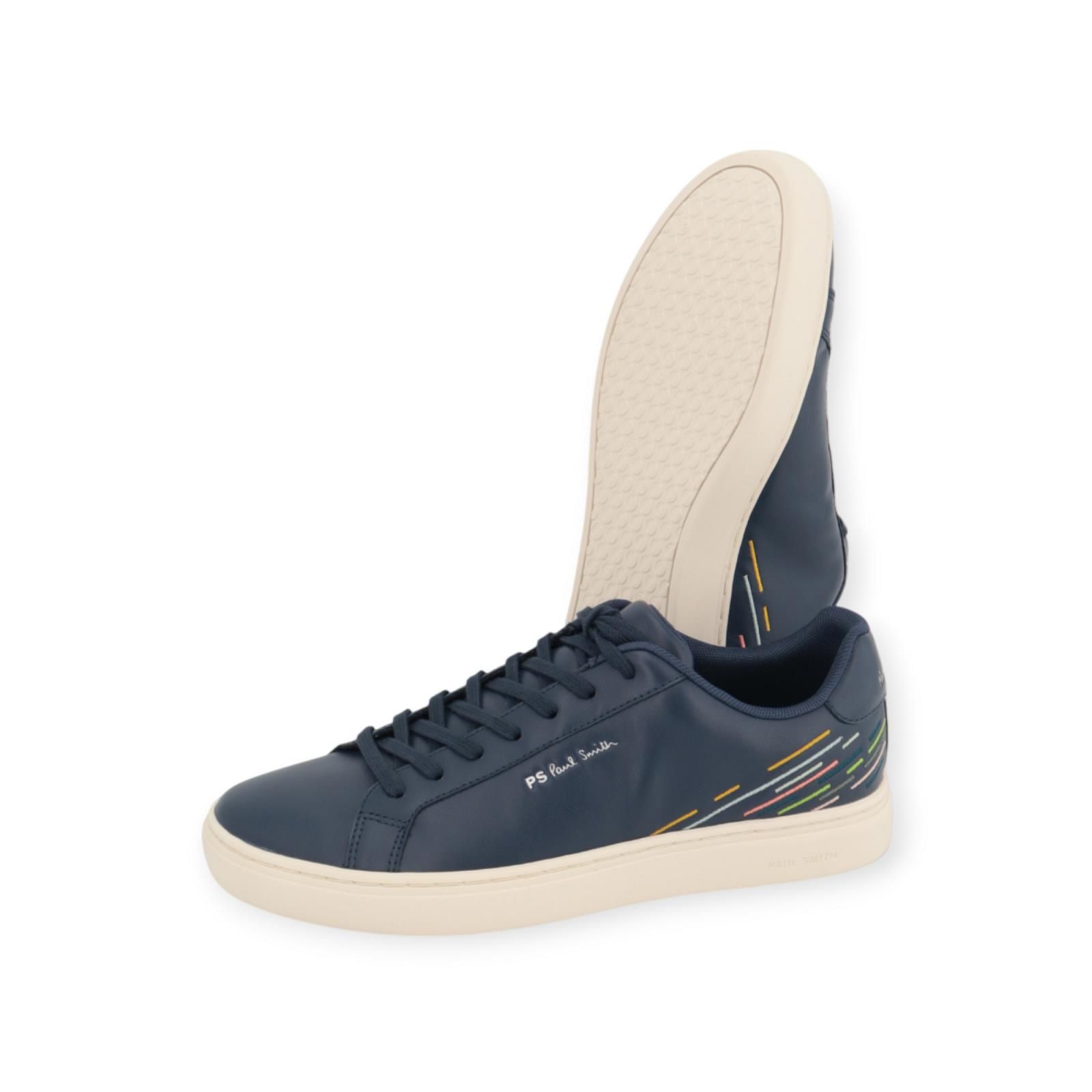 Sneaker Rex van Paul Smith voor heren. Deze sneaker is in blauw leer en is voorzien van borduurmotief in hun ‘Sports Stripe’ kleuren. De binnenzool is uitneembaar. Is op een witte rubberen cupzool met stiksels en reliëf PS – Logo aan de zijkant.