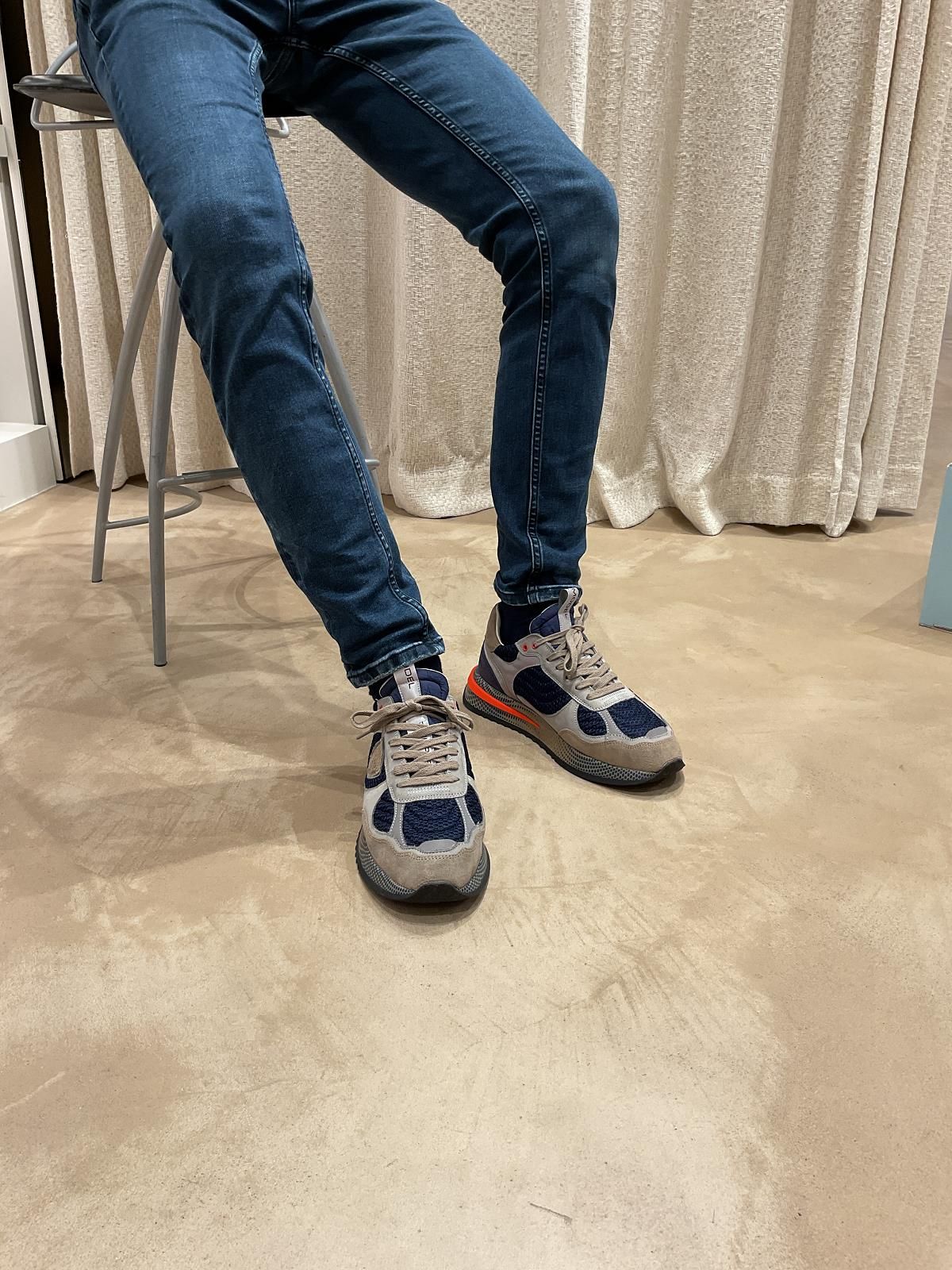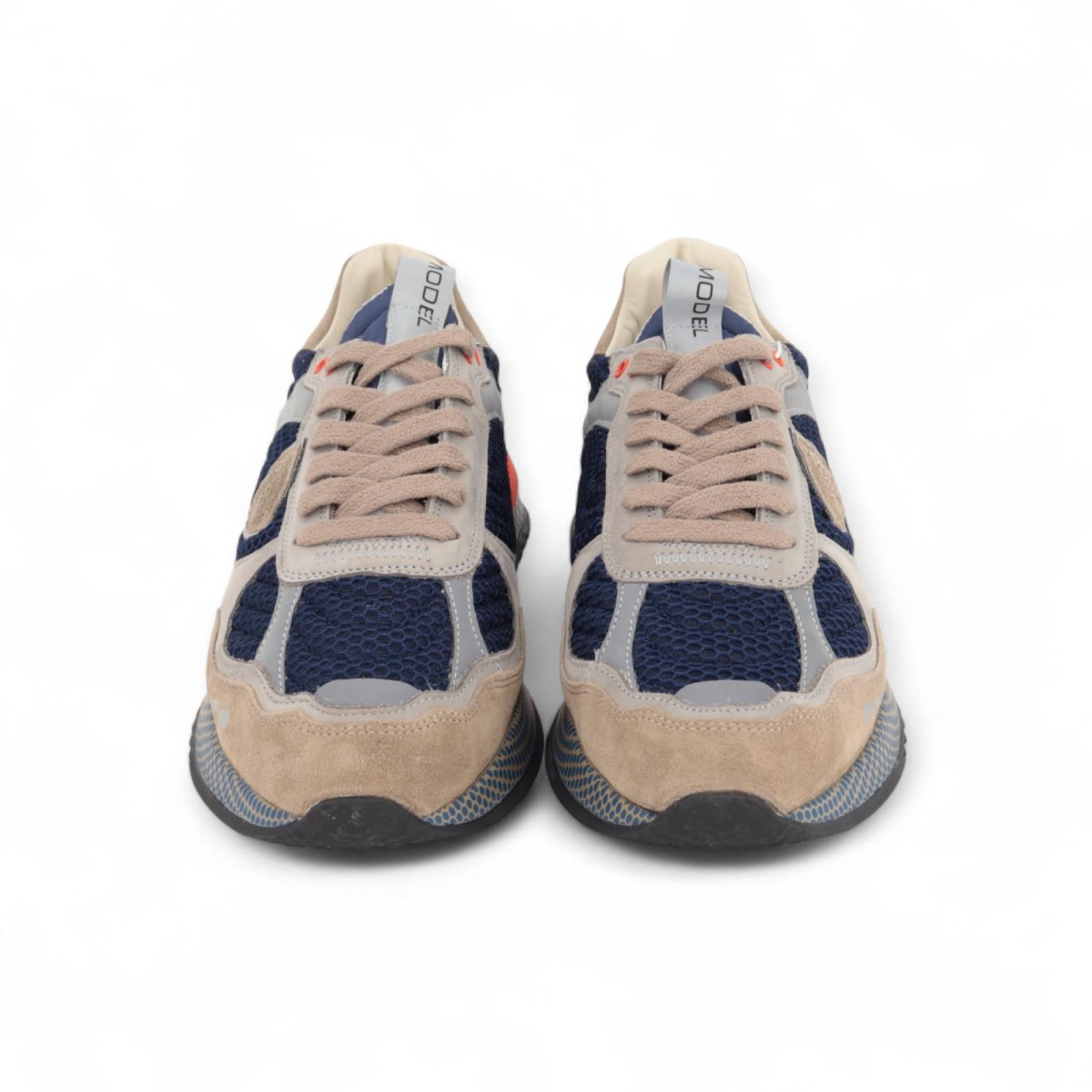 Sneaker Olympique Low van Philippe Model voor heren. Het bovenwerk is gemaakt van blauw geborduurd gaas afgewerkt met grijs leer en een schild met reliëf. De oranje tinten zorgen voor een extra dynamiek. Deze runner is sportief afgewerkt met een lichte en flexibele zool met een uitneembare binnenzool.