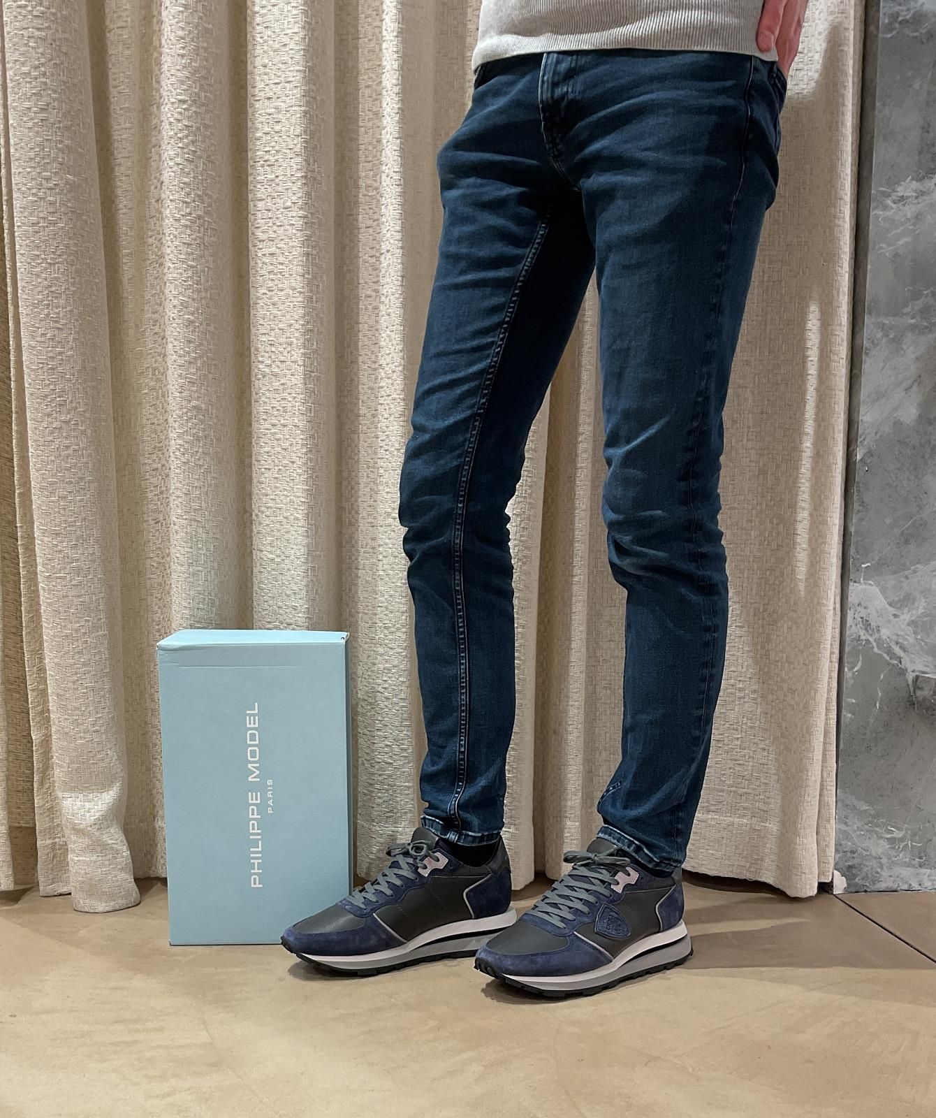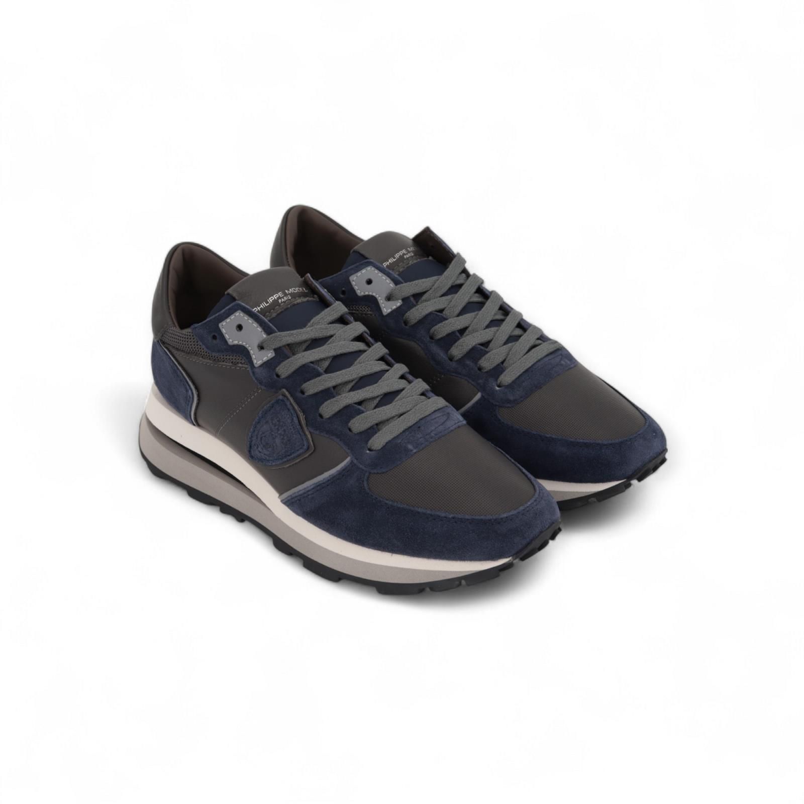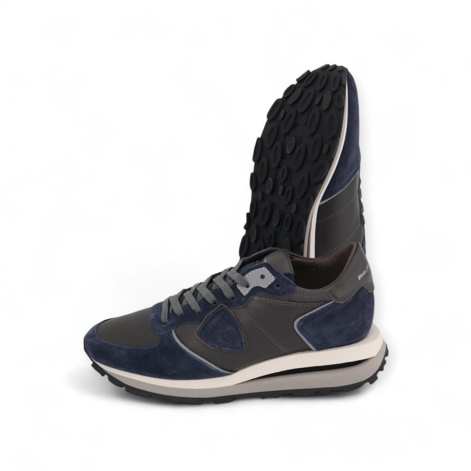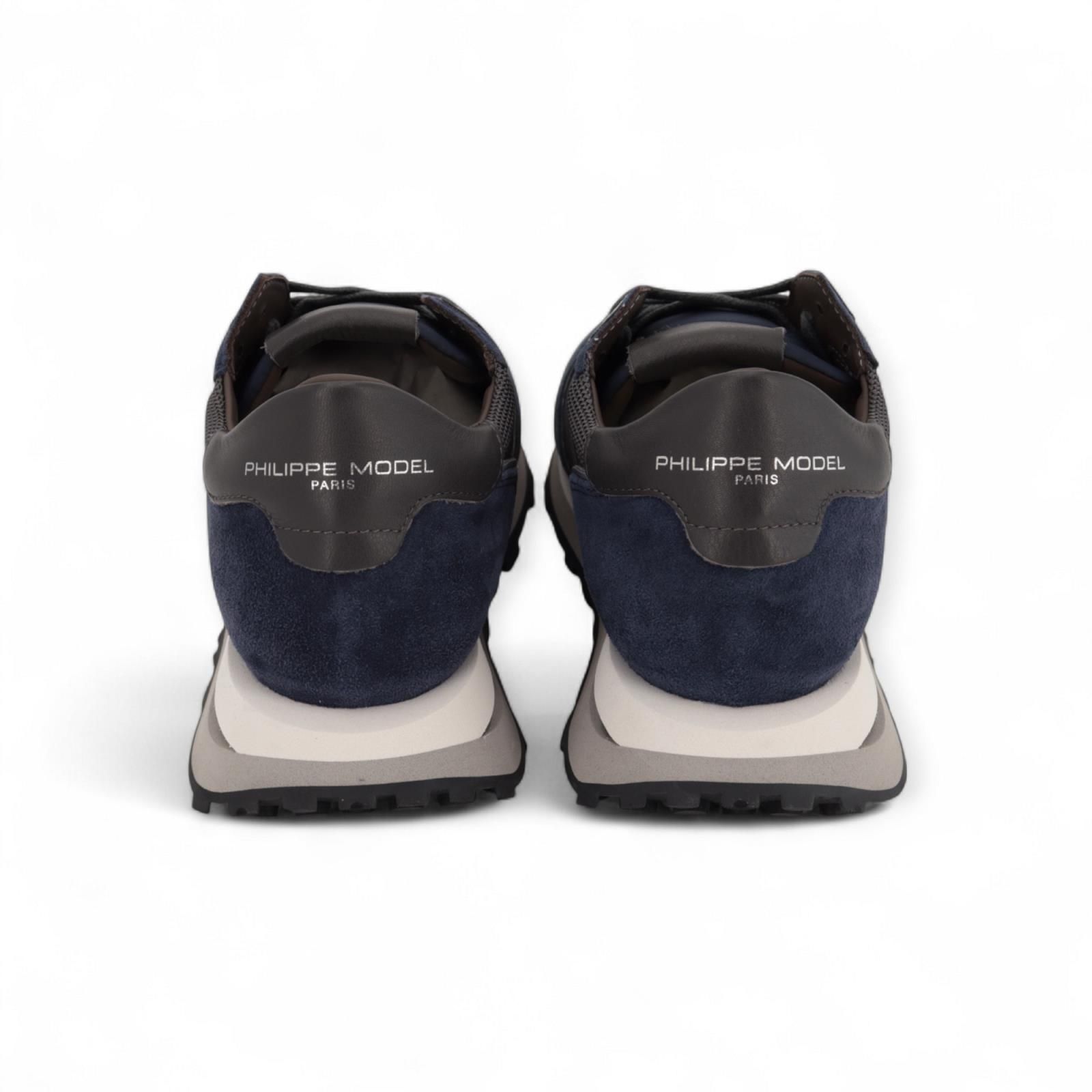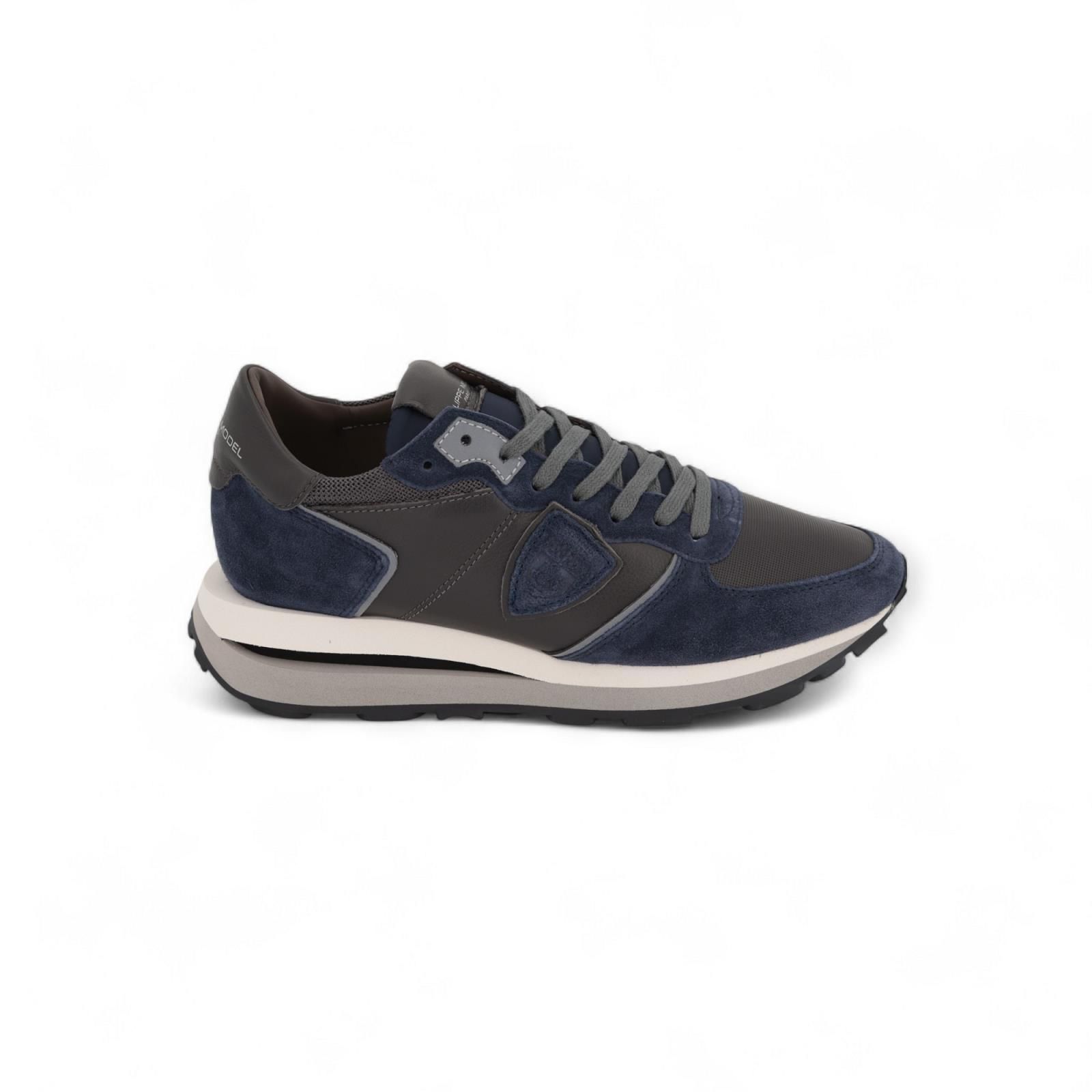 Sneaker Tropez Haute Low van Philippe Model voor heren. Deze runner is in blauw suède met donkergrijs leer en mesh. Afgewerkt met het Philippe Model schild aan de zijkant. Is op een zool van ultralicht rubber met een uitstulping op de hiel een een contrasterend inzetstuk voor een 3D-effect. Heeft een uitneembare binnenzool.
