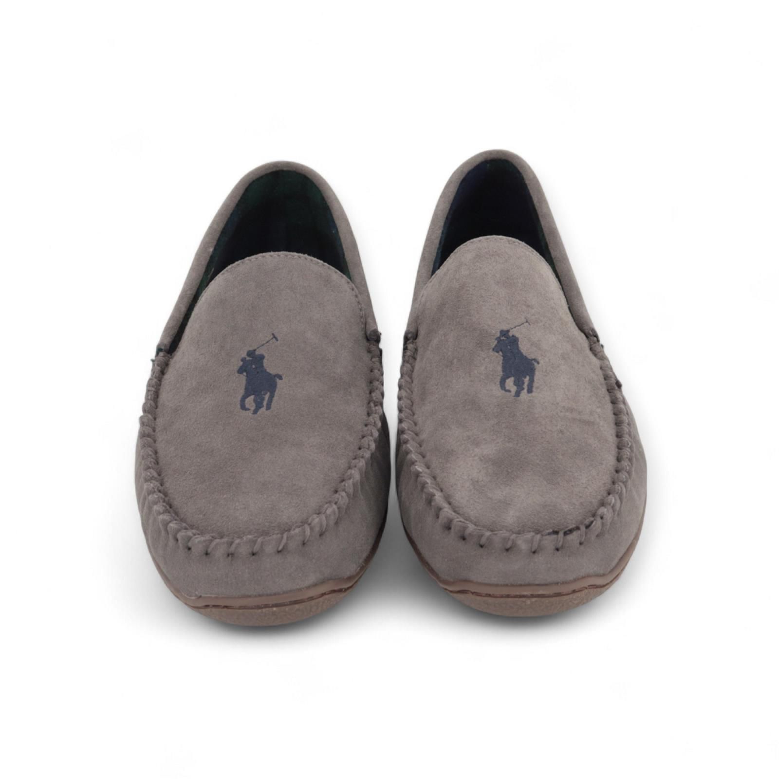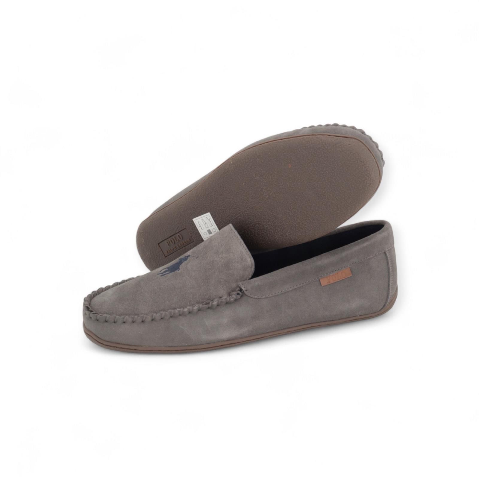 Deze pantoffel is in suède grijs met een blauw logo paard op de wreef. Is binnenin met stof en heeft een antislipzool.