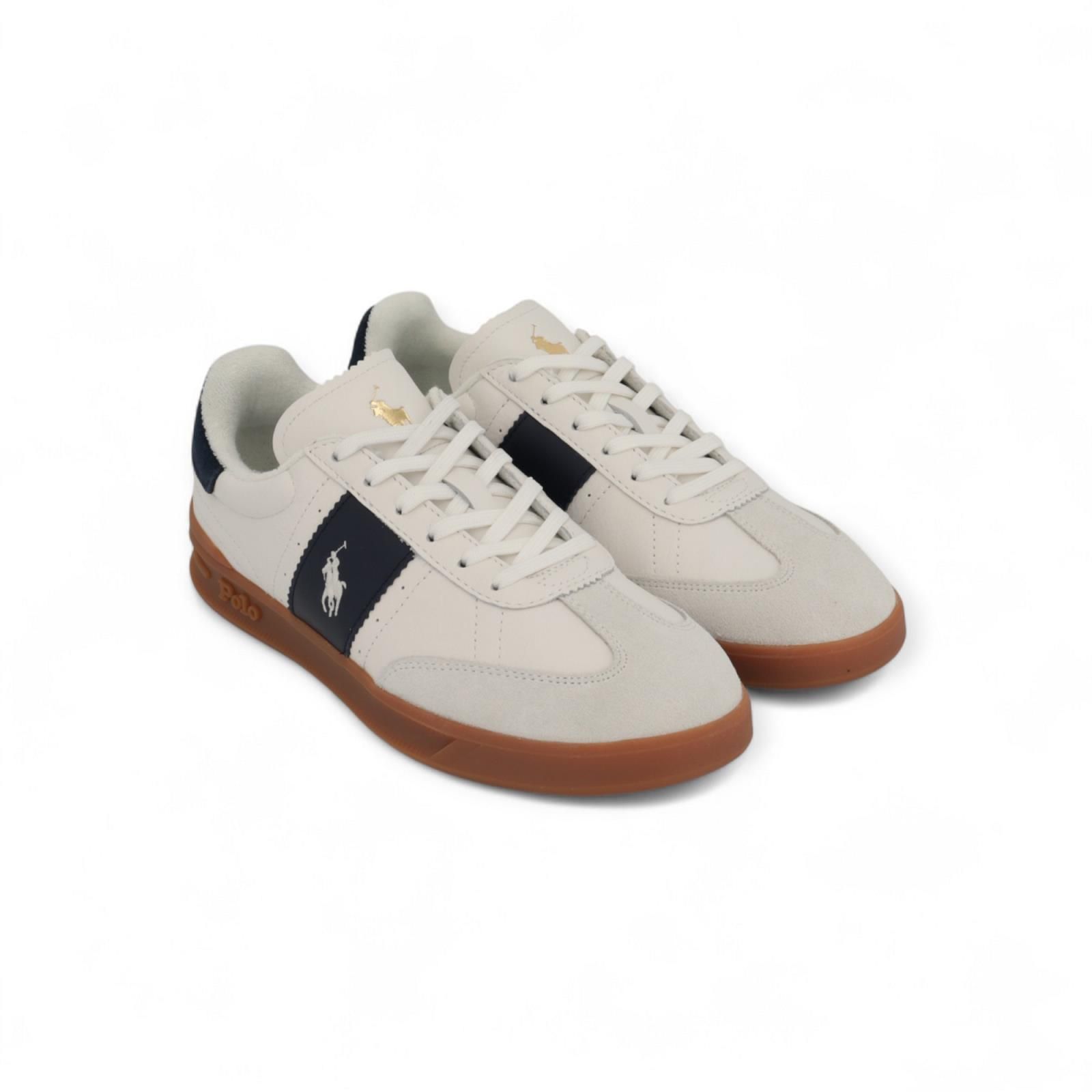 Sneaker Aera Heritage van Polo Ralph Lauren voor heren. Deze sneaker is in off wit leer met suède. Mooi afgewerkt met blauwe streep en logo paardje aan de zijkant en een blauwe hielflap. Is op een aangename bruine gummyzool met een uitneembare binnenzool.